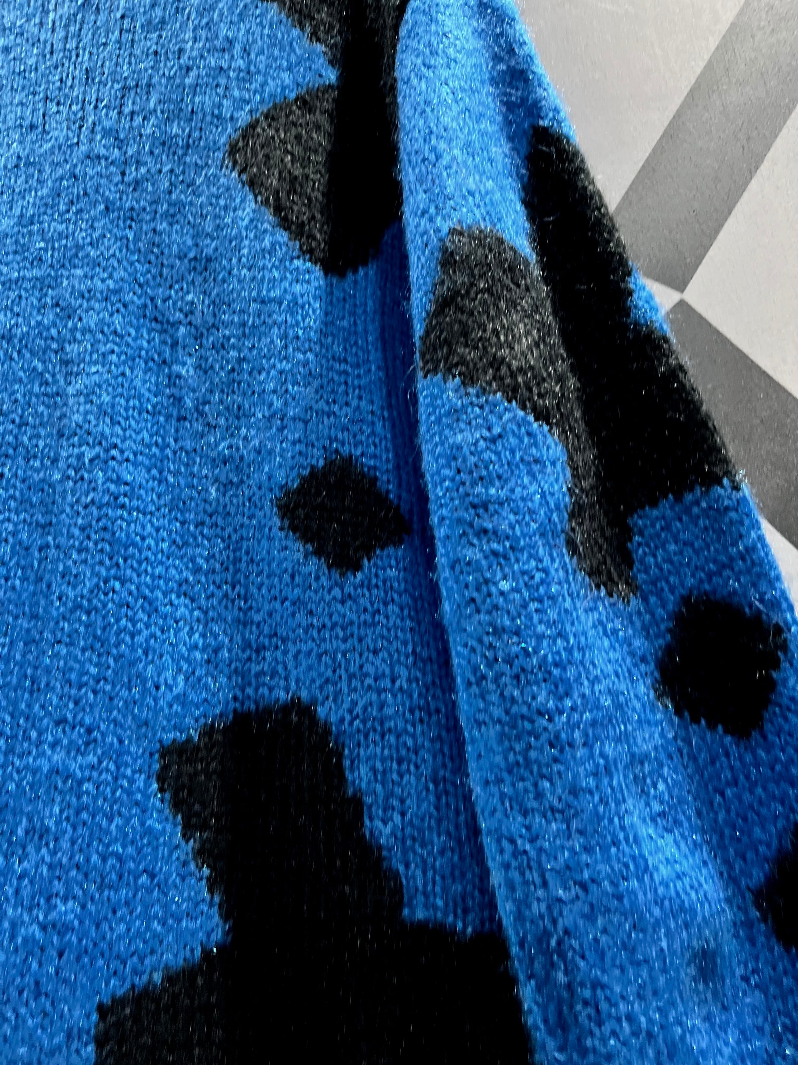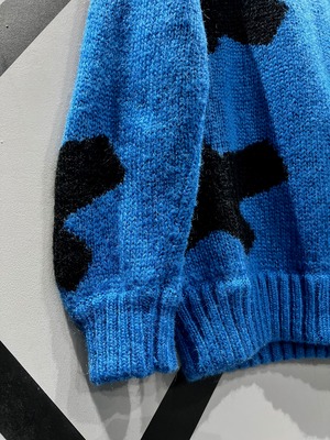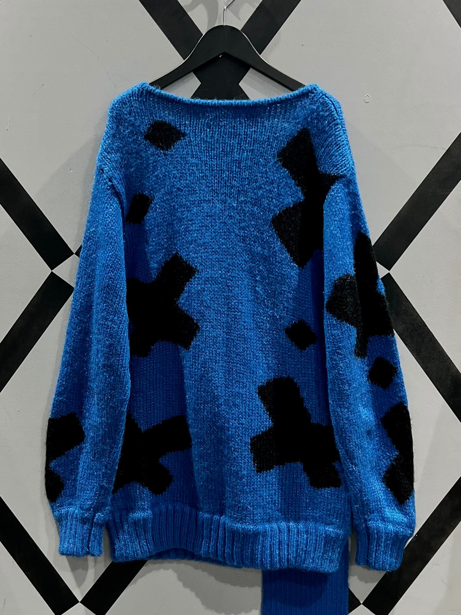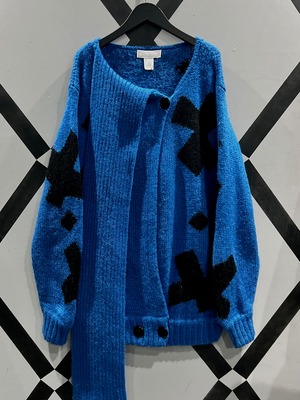 フワッと柔らかな質感の上質なニット生地をボディに使用し、ブルー×ブラックのカラーリングでクロス状の柄を全体に載せたニットジャケット。