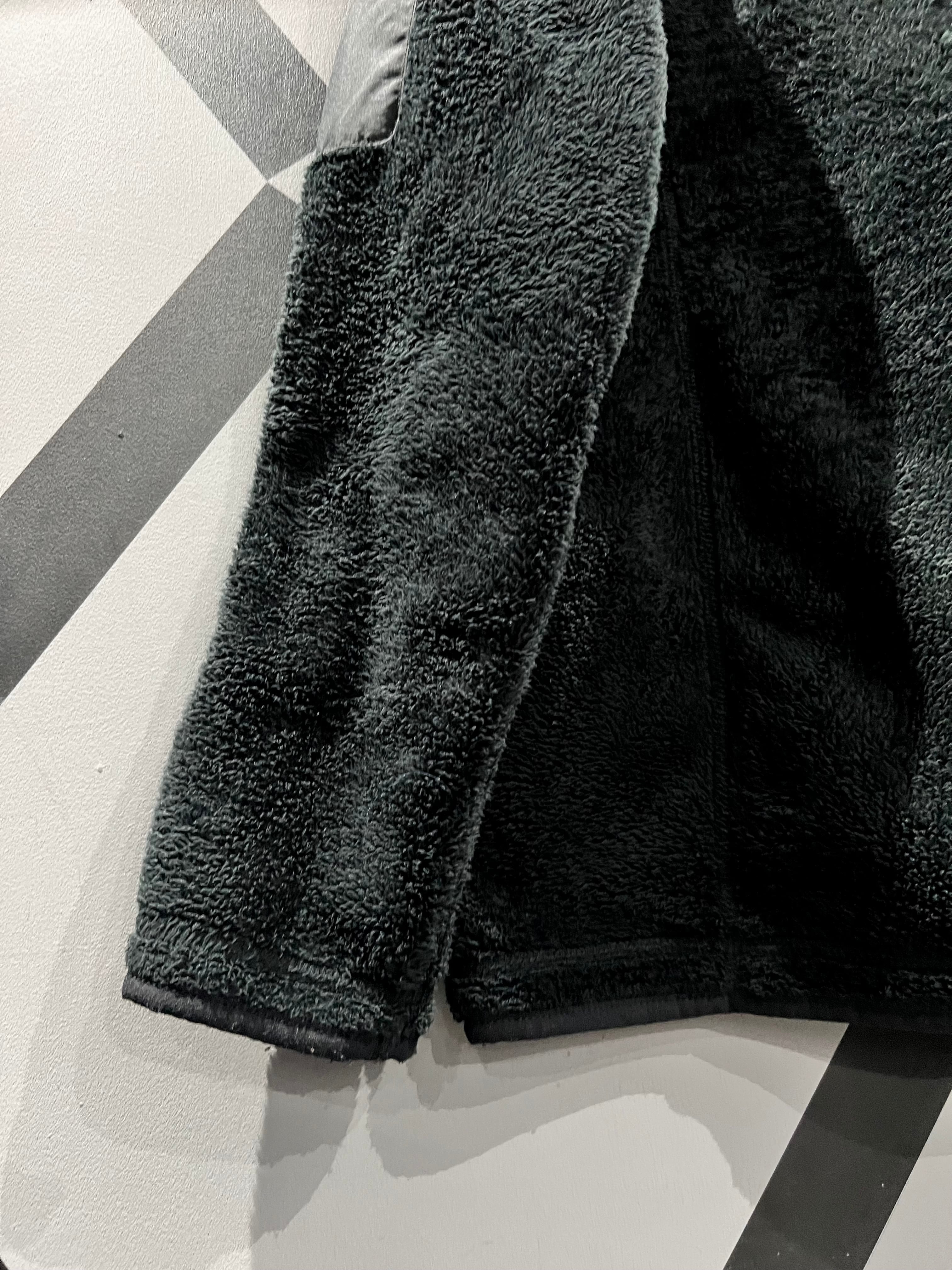 フワッと柔らかな肌触りのフリース生地をボディに使用し、ネックや肩周り等、随所にハリのある微光沢を帯びた生地で切り替えを施したフリースジャケット。