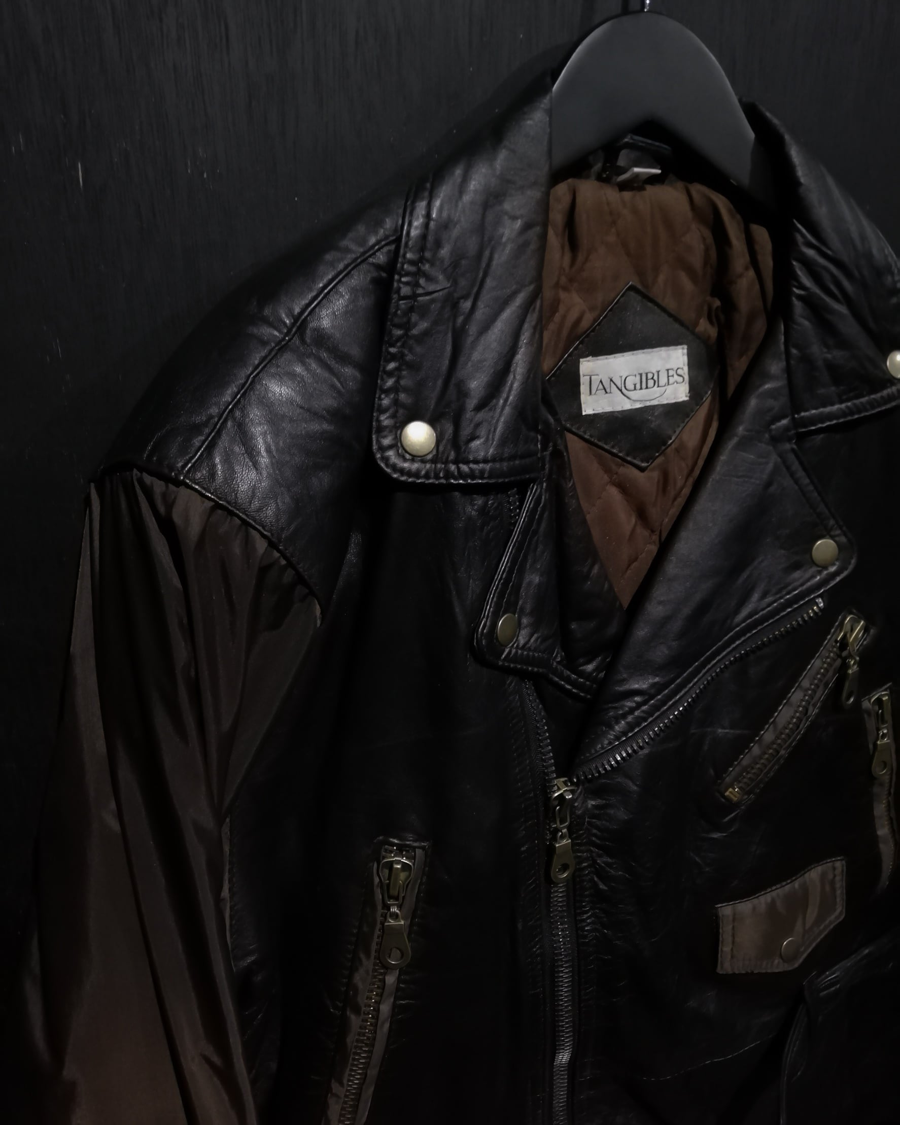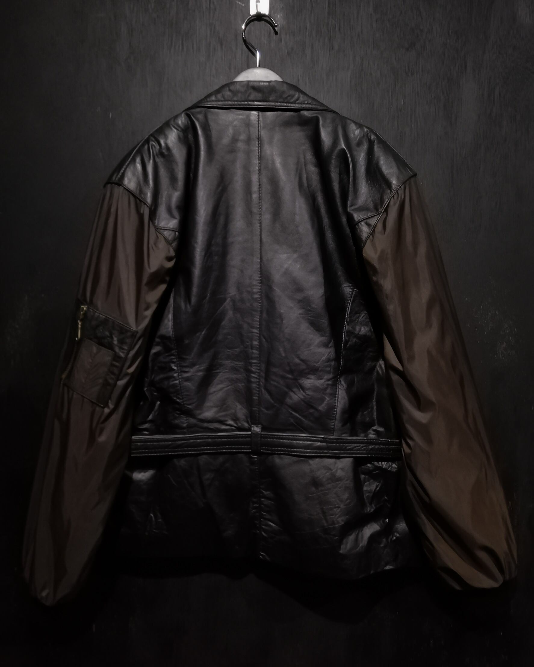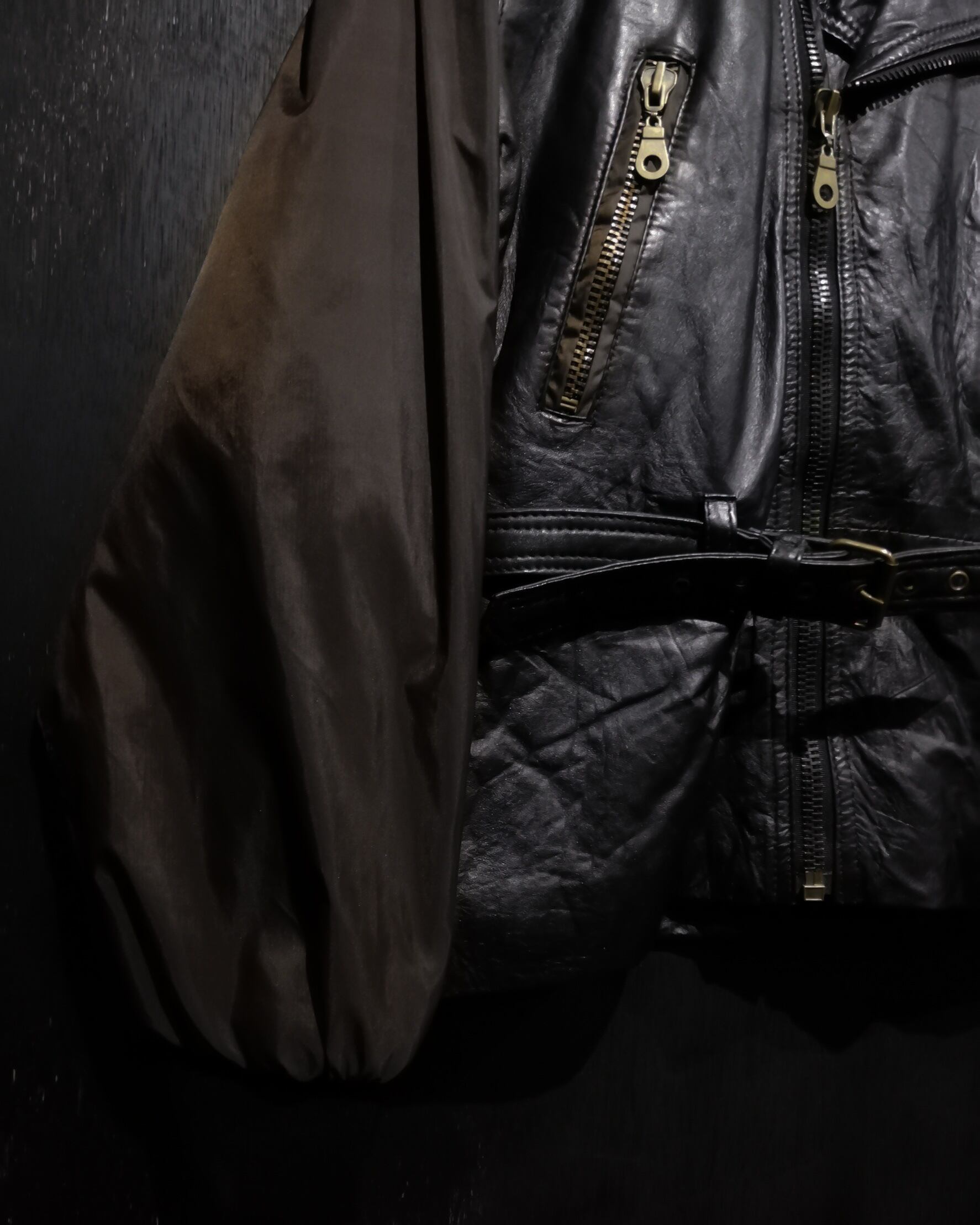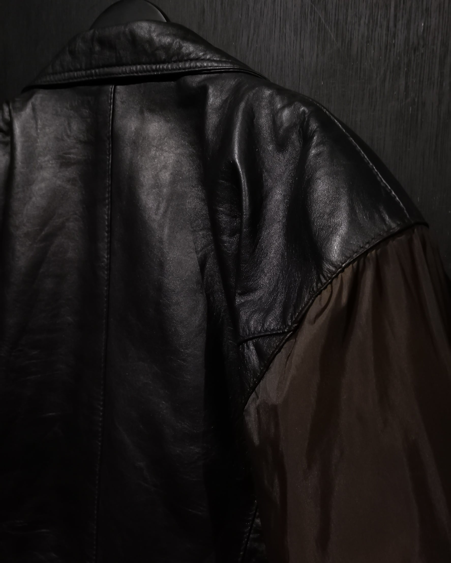 ツルッとしたブラックのスムースレザーをベースに、ブラウンのナイロンをアーム部分に切り替えたレザージャケット。異素材の掛け合せによって生まれる陰影が、他アイテムにはなし得ない独特の表情を生み出しています。