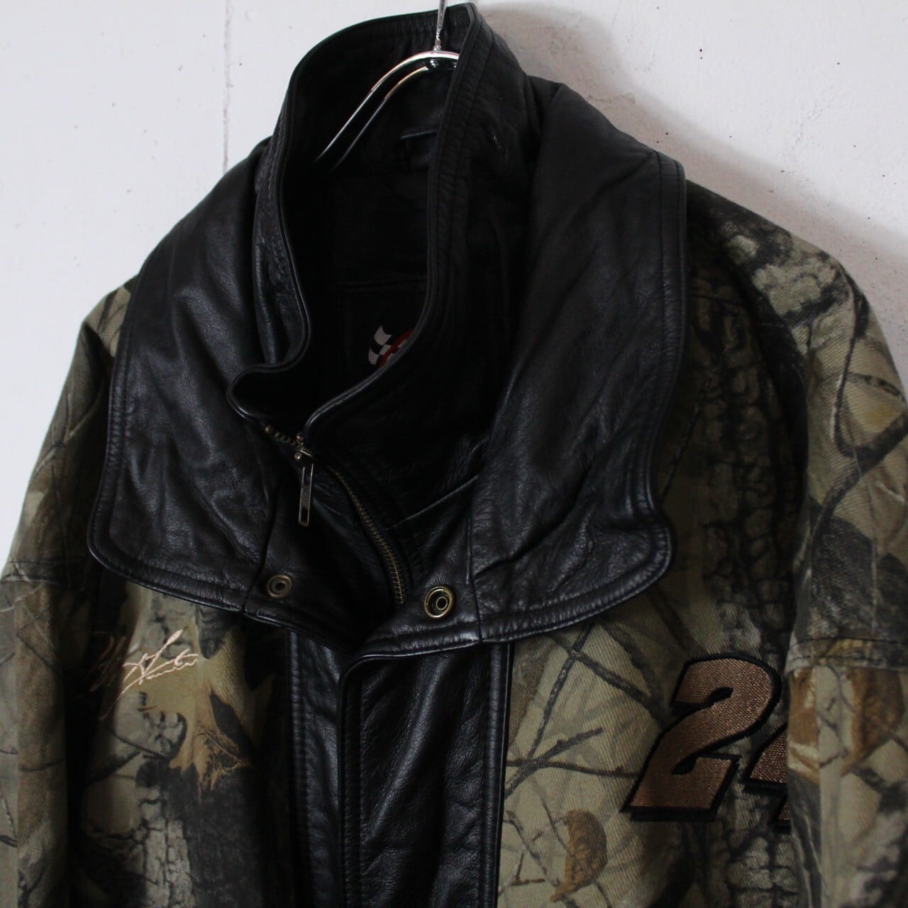 ハリのあるブラックレザー×リアルツリーカモが配されたコットンツイルで切り替えを施したレザージャケット。