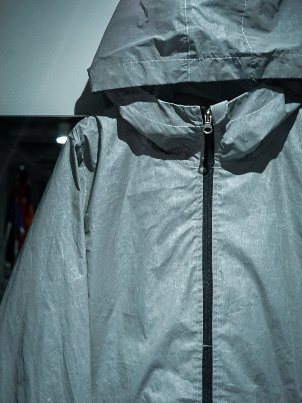 光の反射でソリッドなルックスへと変化する、シェルにリフレクター素材を使用したジップアップフーディジャケット。