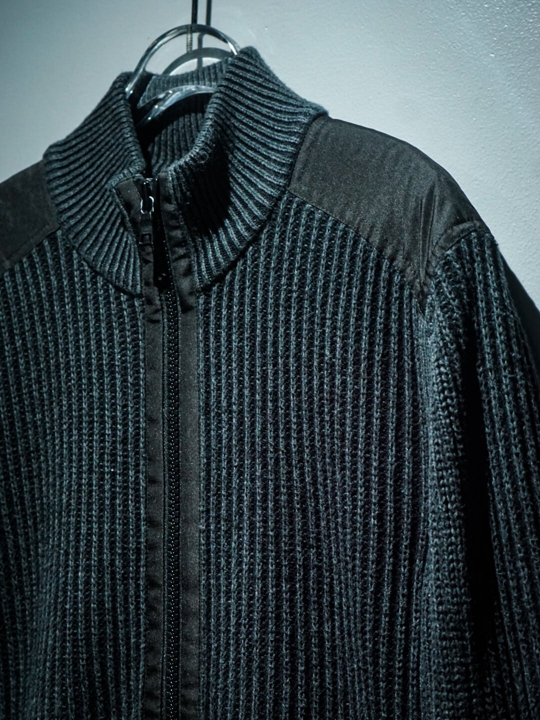 丈夫なコットン生地をベースに、肩部分はハリのある素材で切り替えられ、絶妙な奥行きを表現したドライバーズ型のジップアップニット。