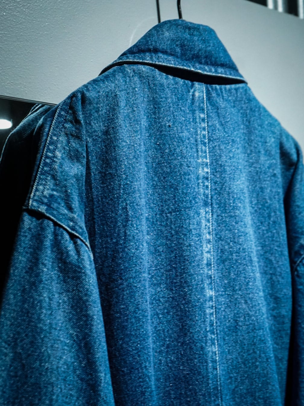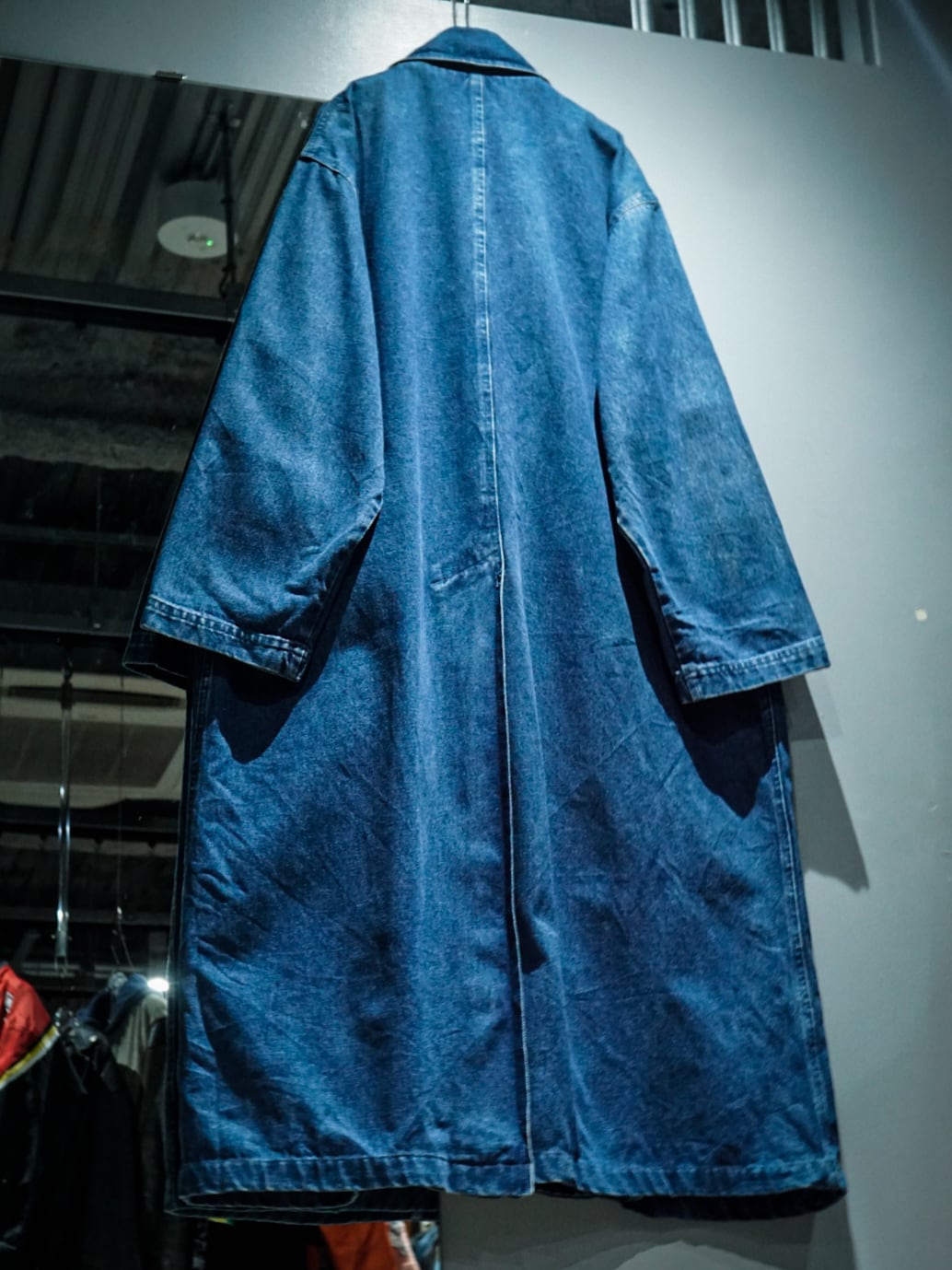 コシのある上質なインディゴブルーのデニムを用いて、稀有なロングコートに仕上げられた逸品。