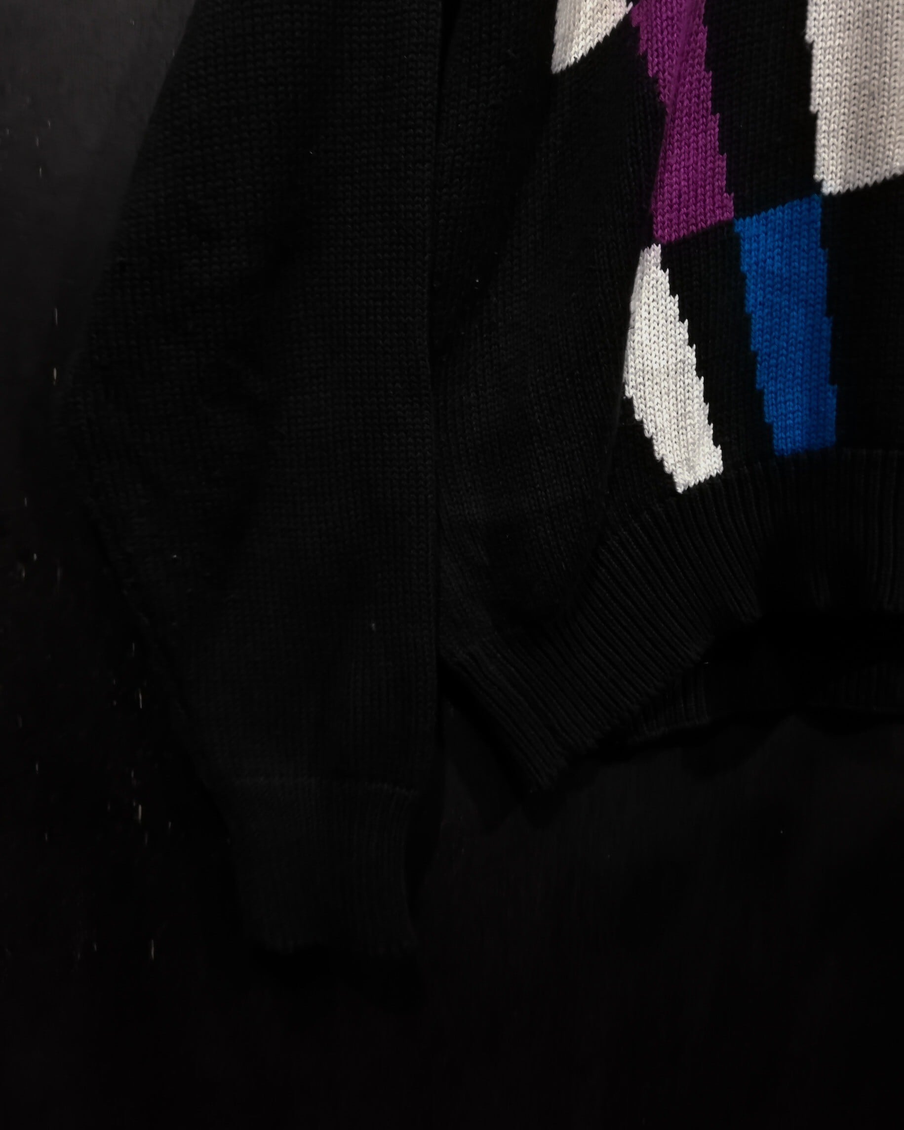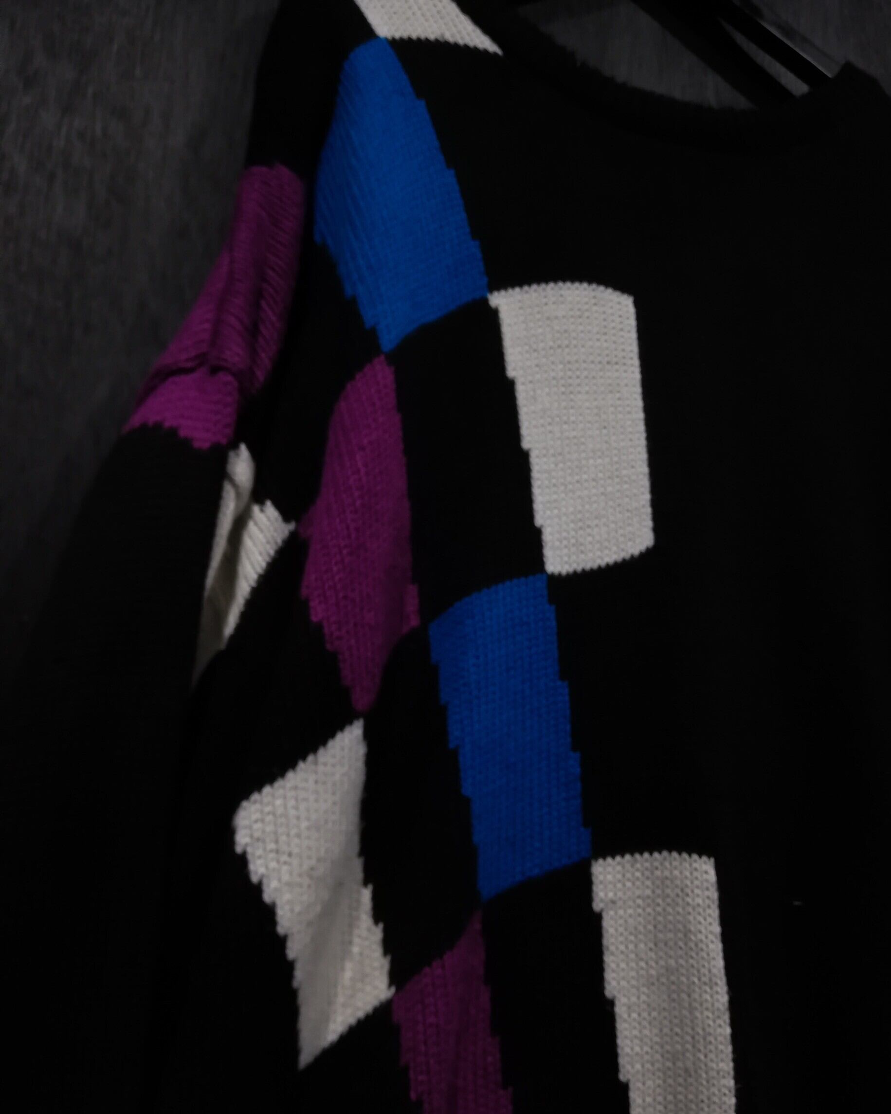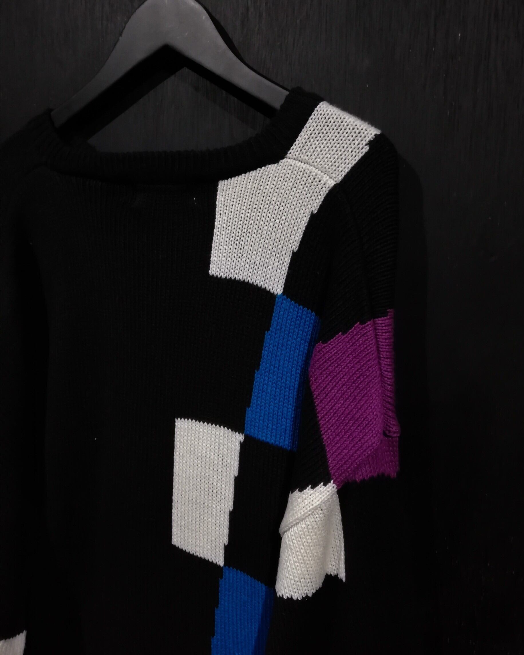 ブラックのボディをベースに、青、白、紫のブロックチェック、右腕には同色でラインを切り替えたプルオーバーニット。
