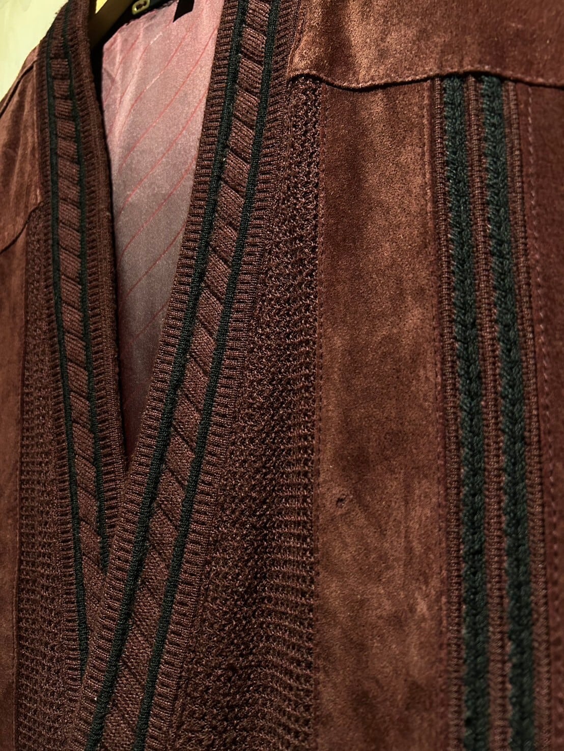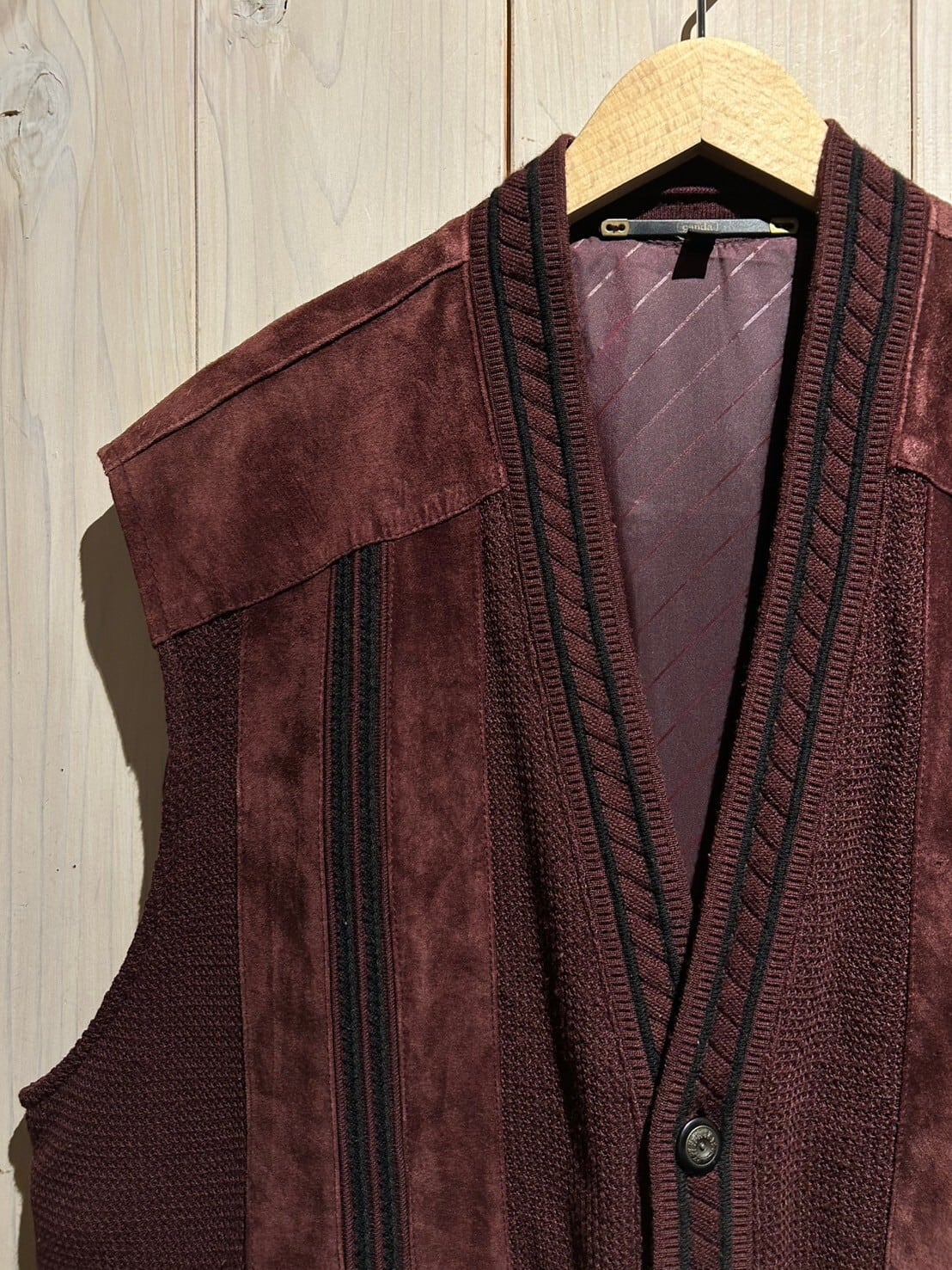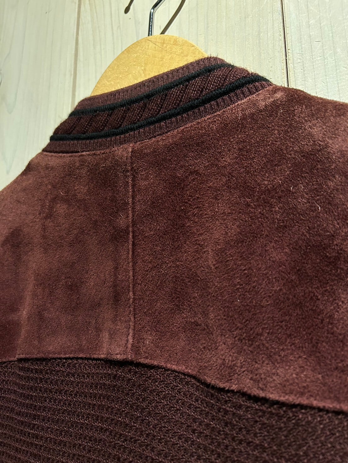 年間通して様々なレイヤードスタイルを楽しめ、実店舗でも大量展開、大好評頂いておりますベストアイテムより、スエードの切り替え仕様が光る逸品をご紹介致します。
