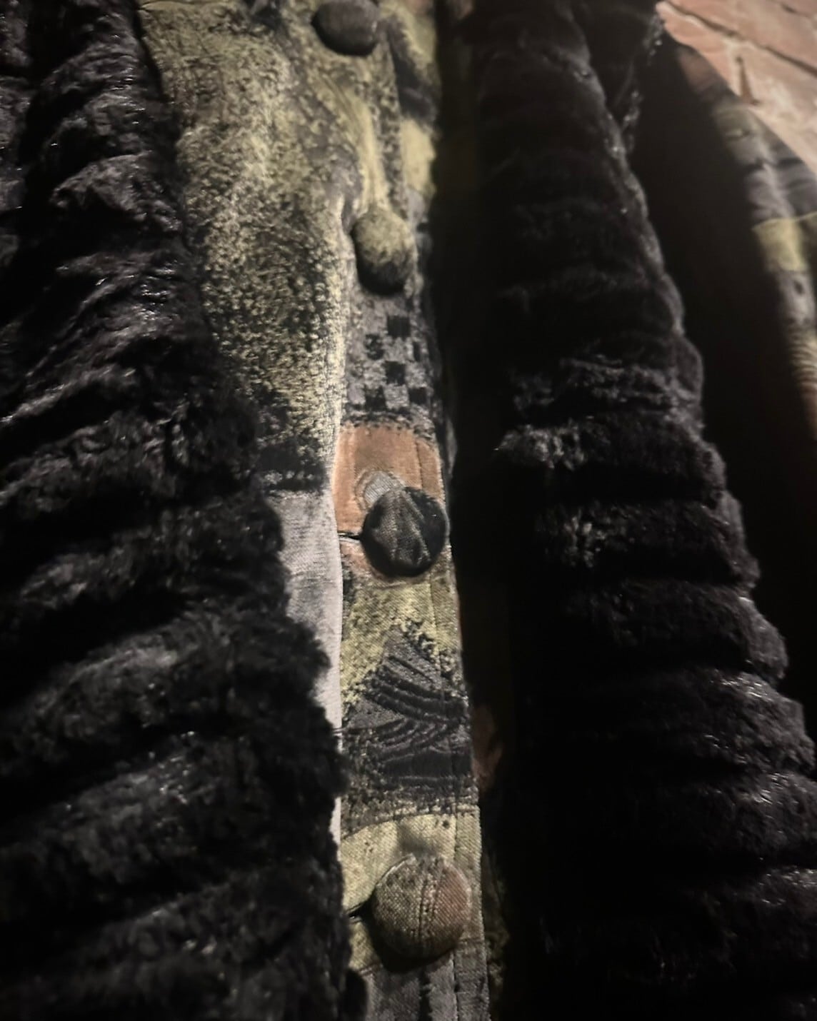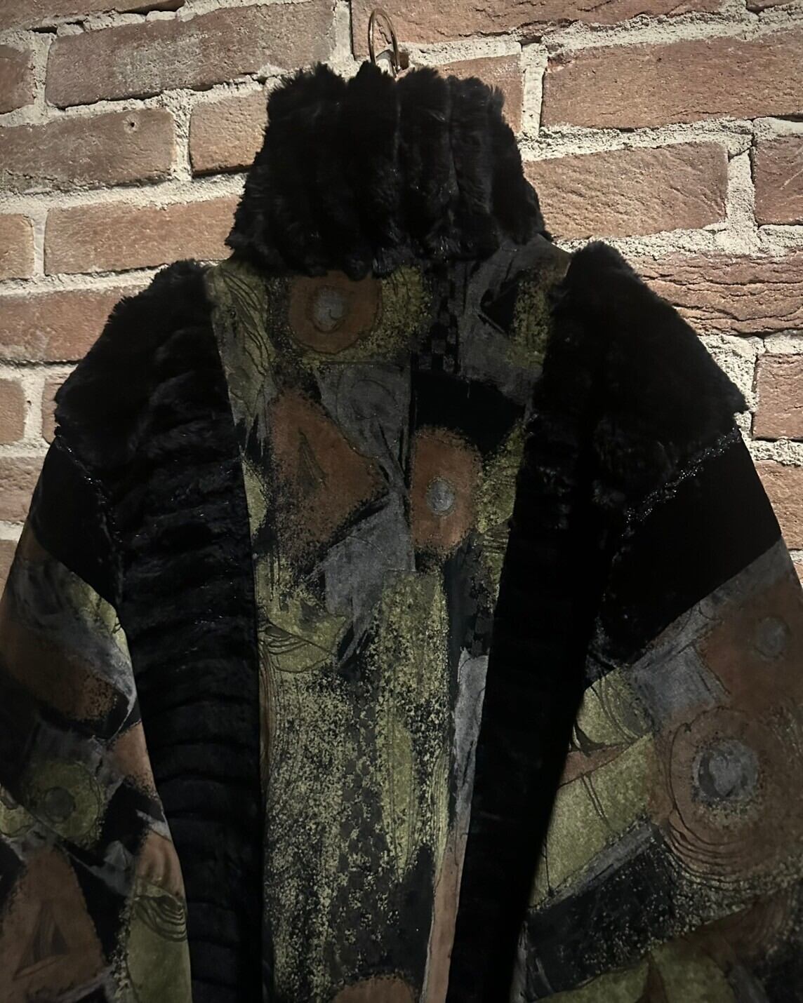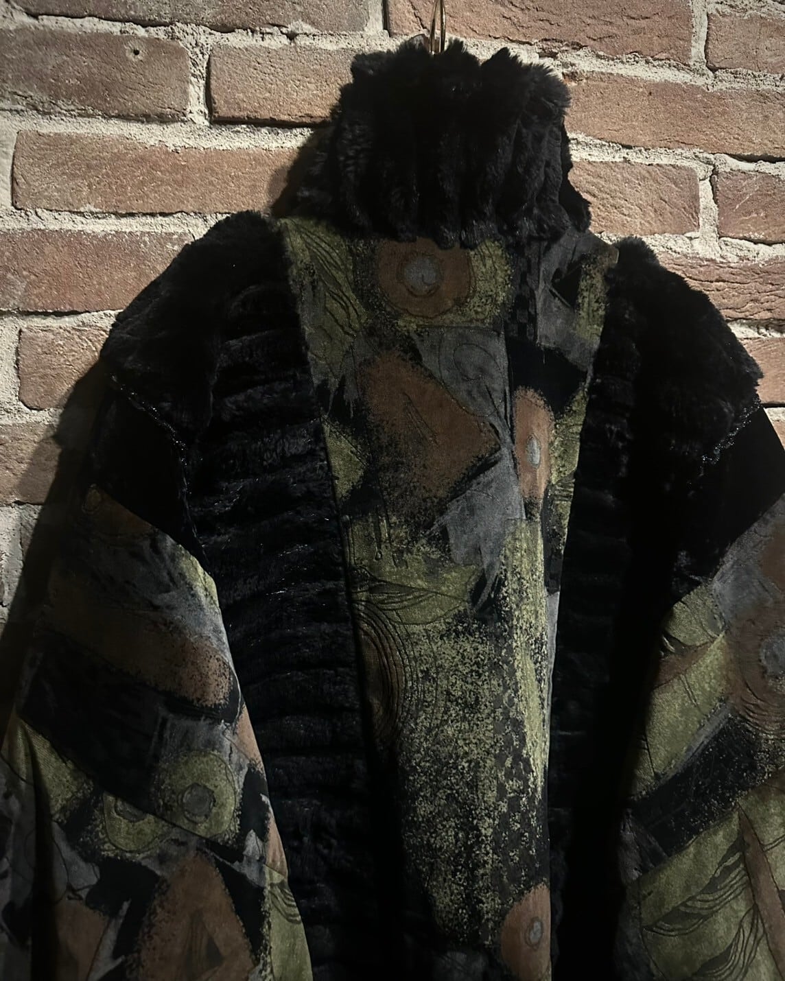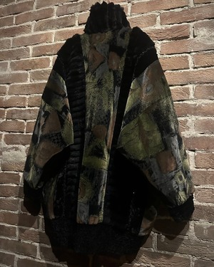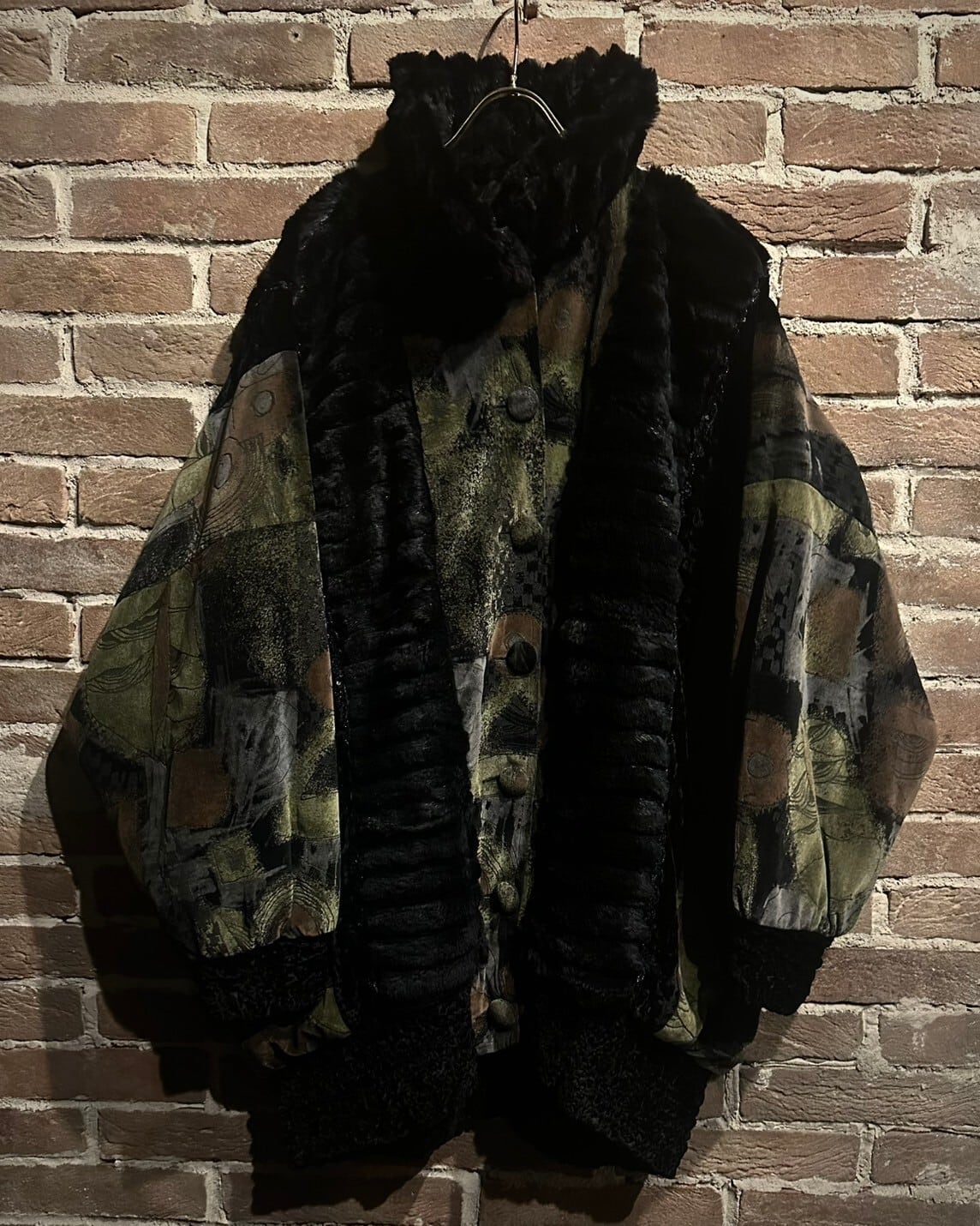 抽象的なアート柄を載せたベロアのボディをベースに、毛並みの美しいブラックのフェイクファーを切り替えた、当店らしい雰囲気を纏った1着。