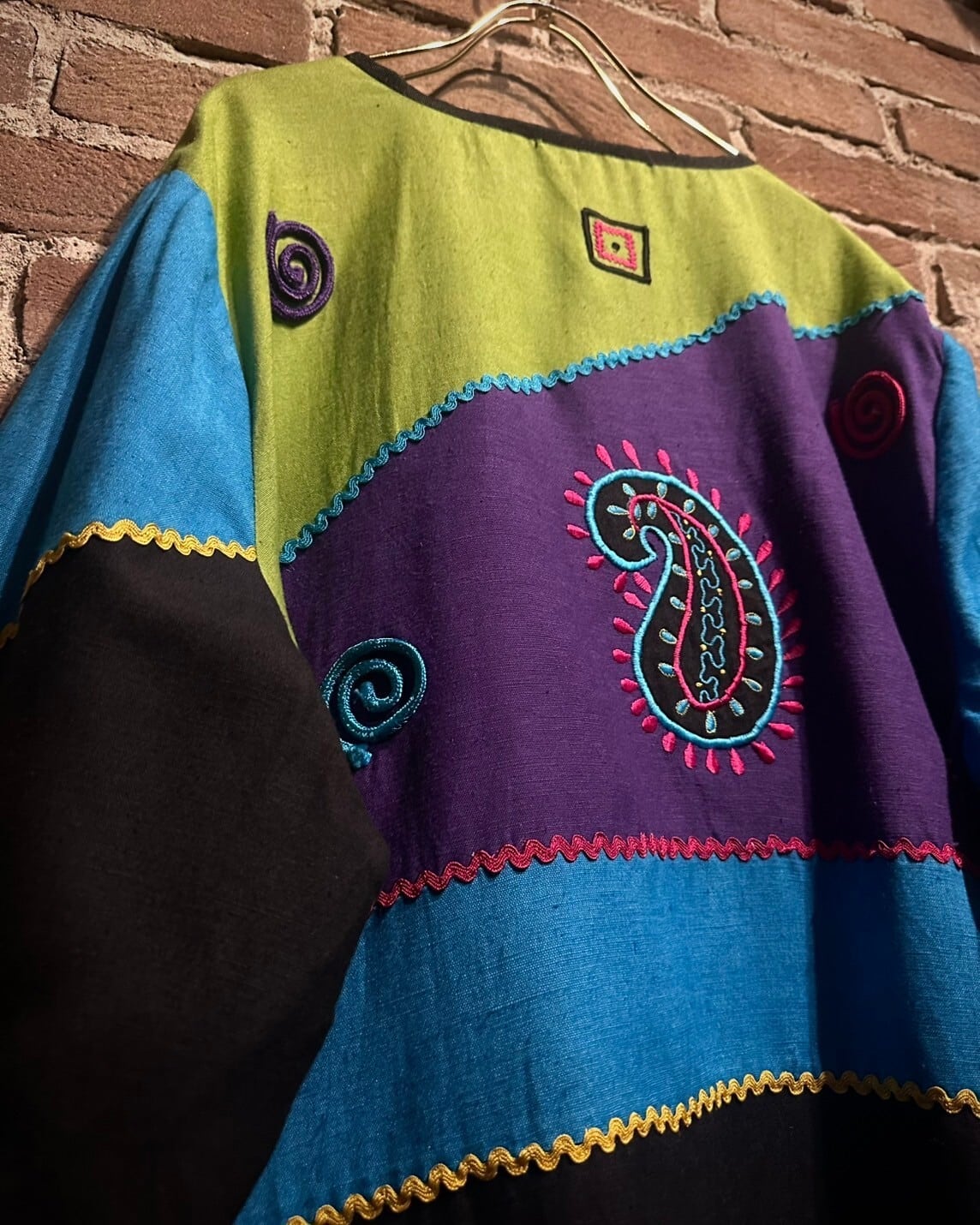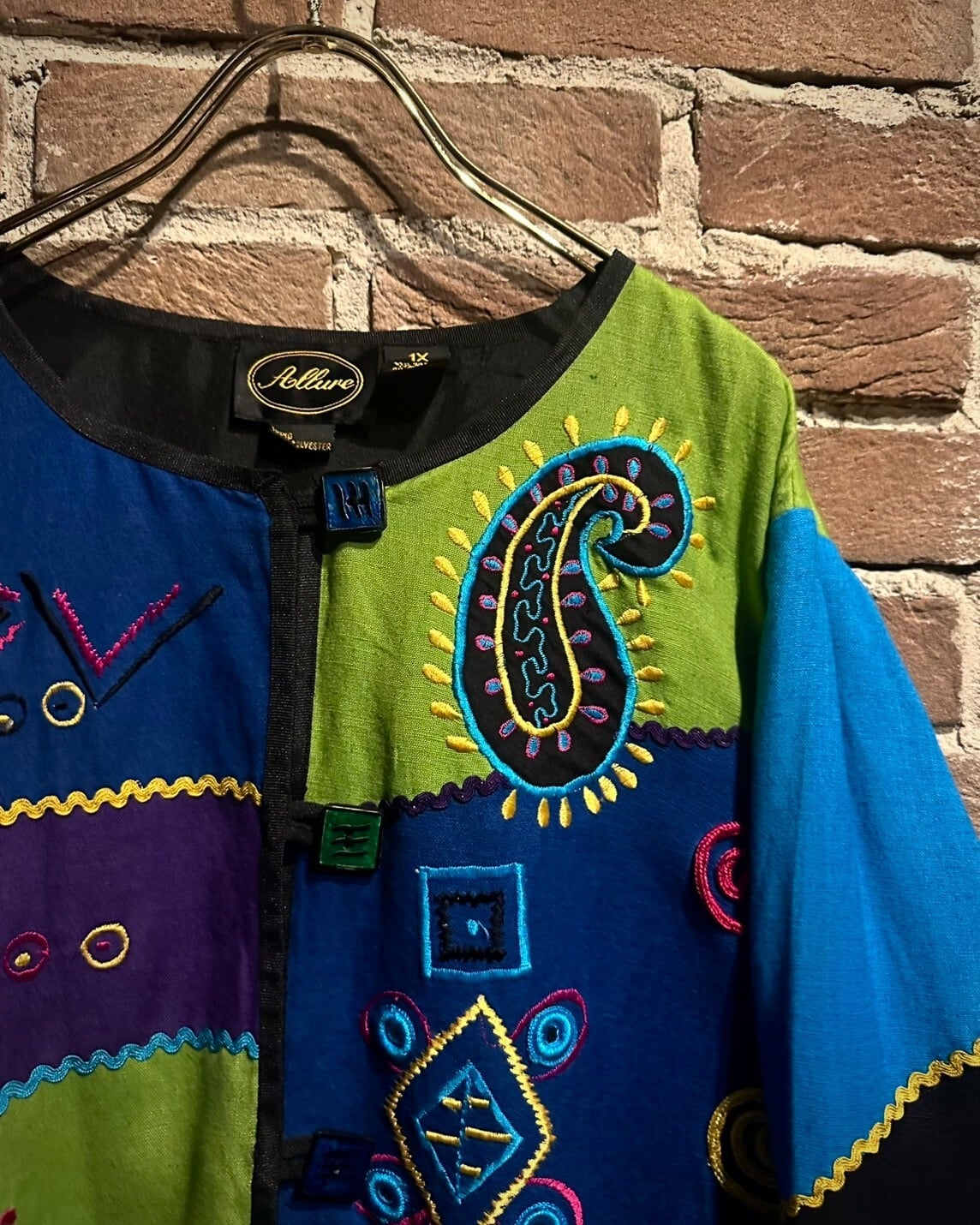 コットン、レーヨン、リネンを混紡したボディをベースに、ペイズリー、アート風のデザインを刺繍で刻んだジャケット。