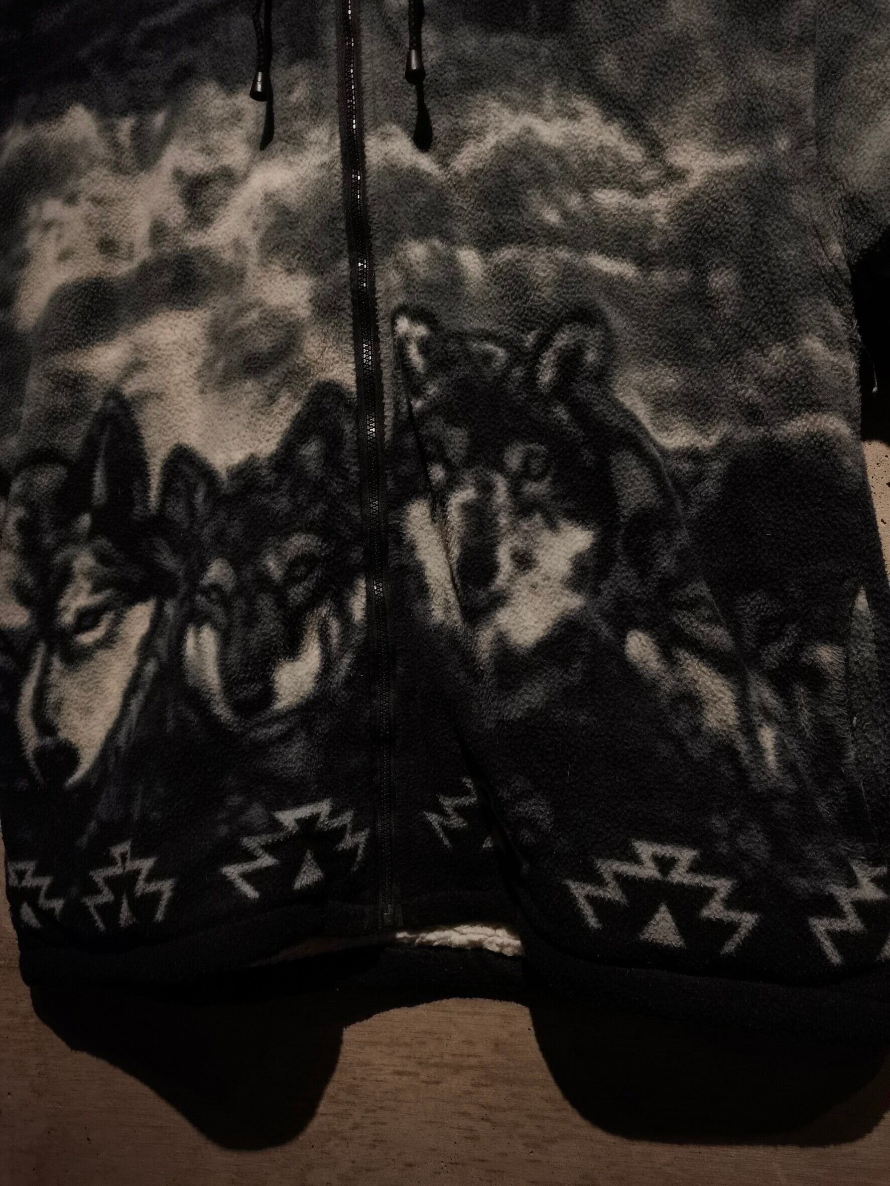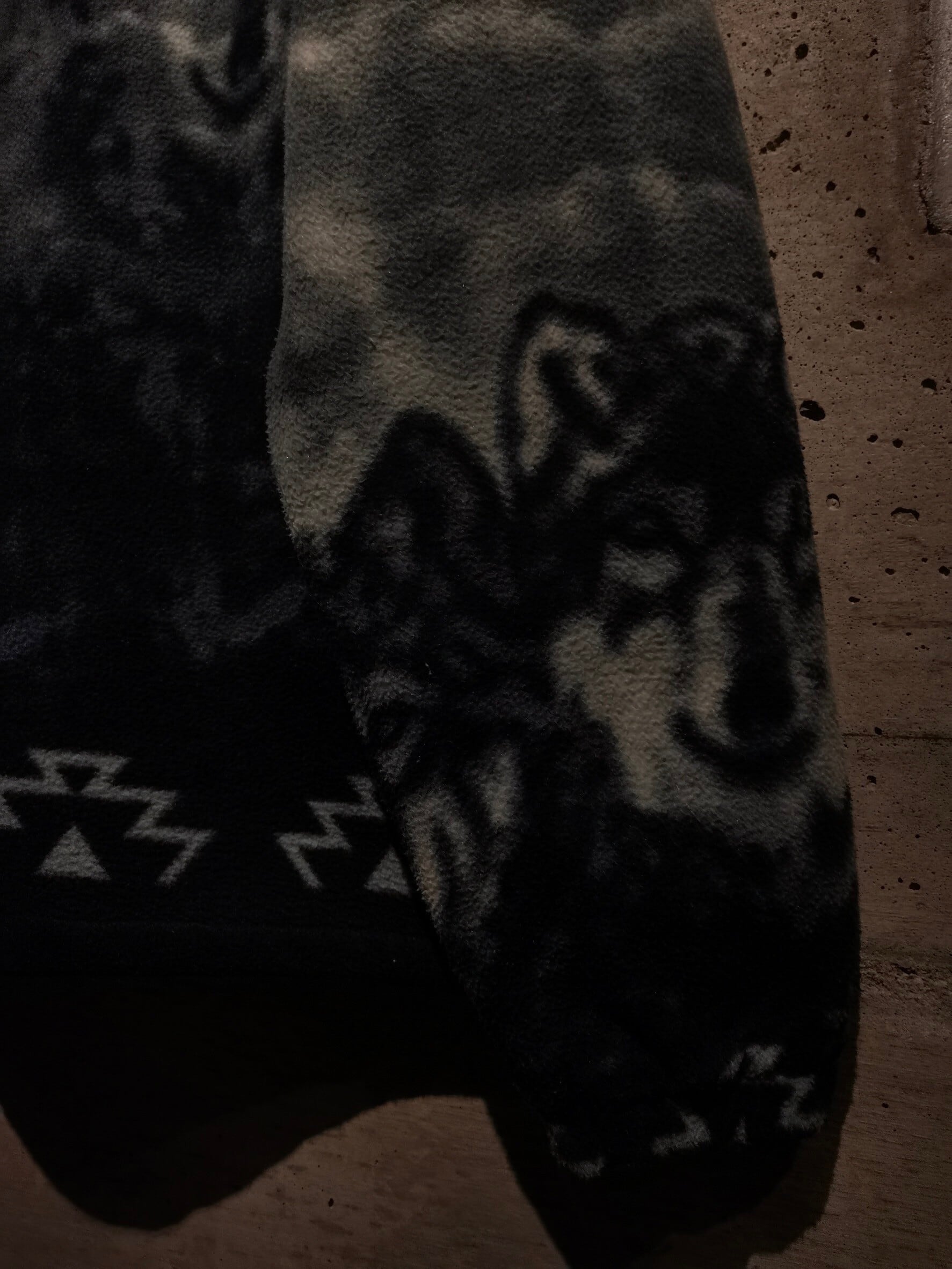 フワッと心地の良い軽く柔らかな毛足のボディに、フロント、バック、そしてアームまでにもオオカミを配した全方位抜かりのないフリースジャケットの逸品。