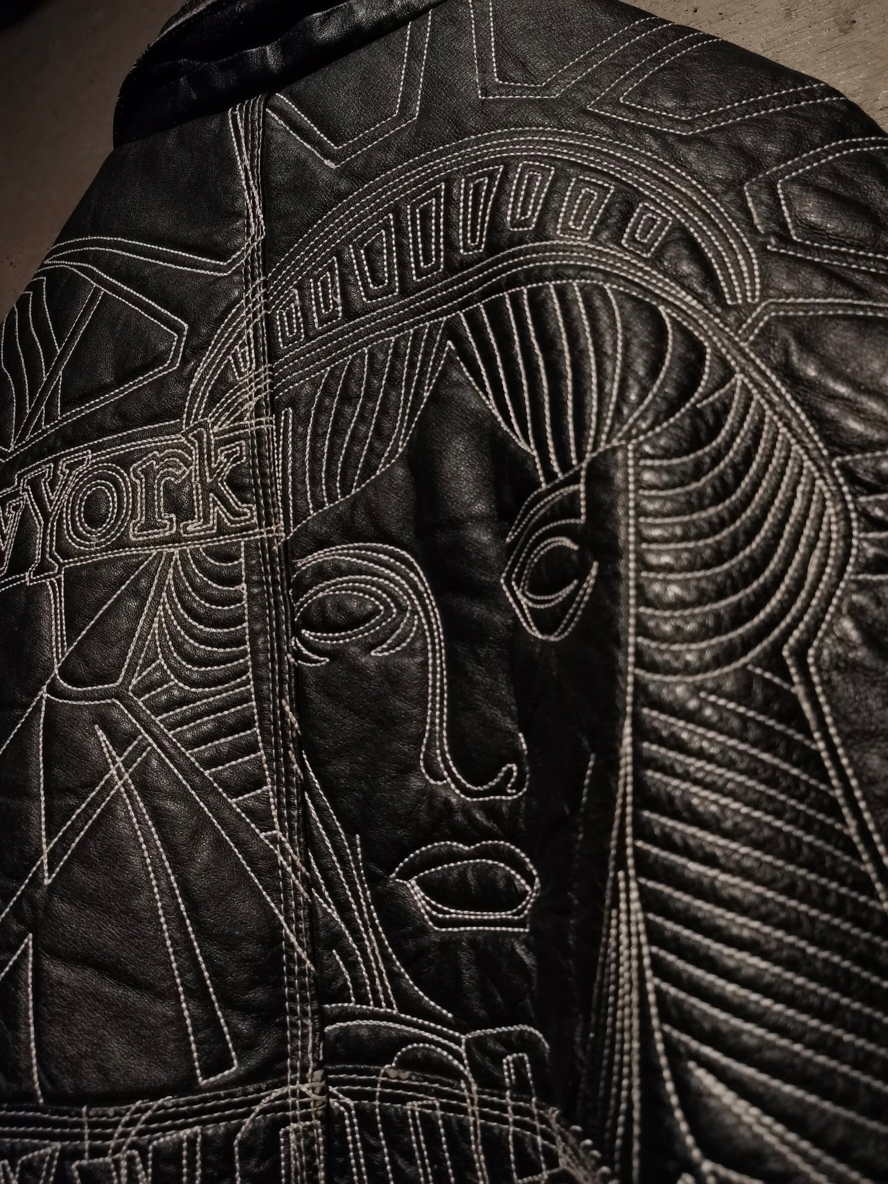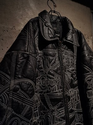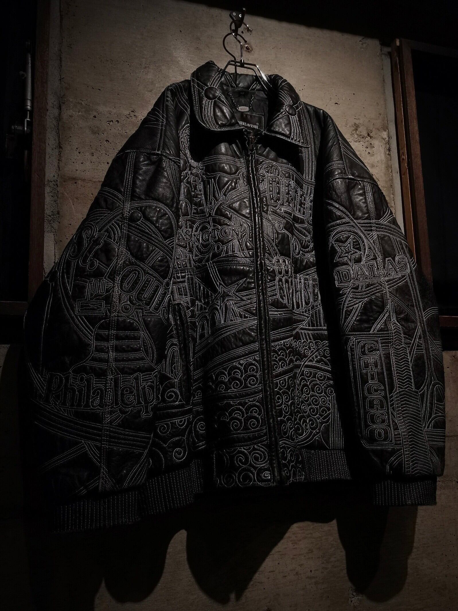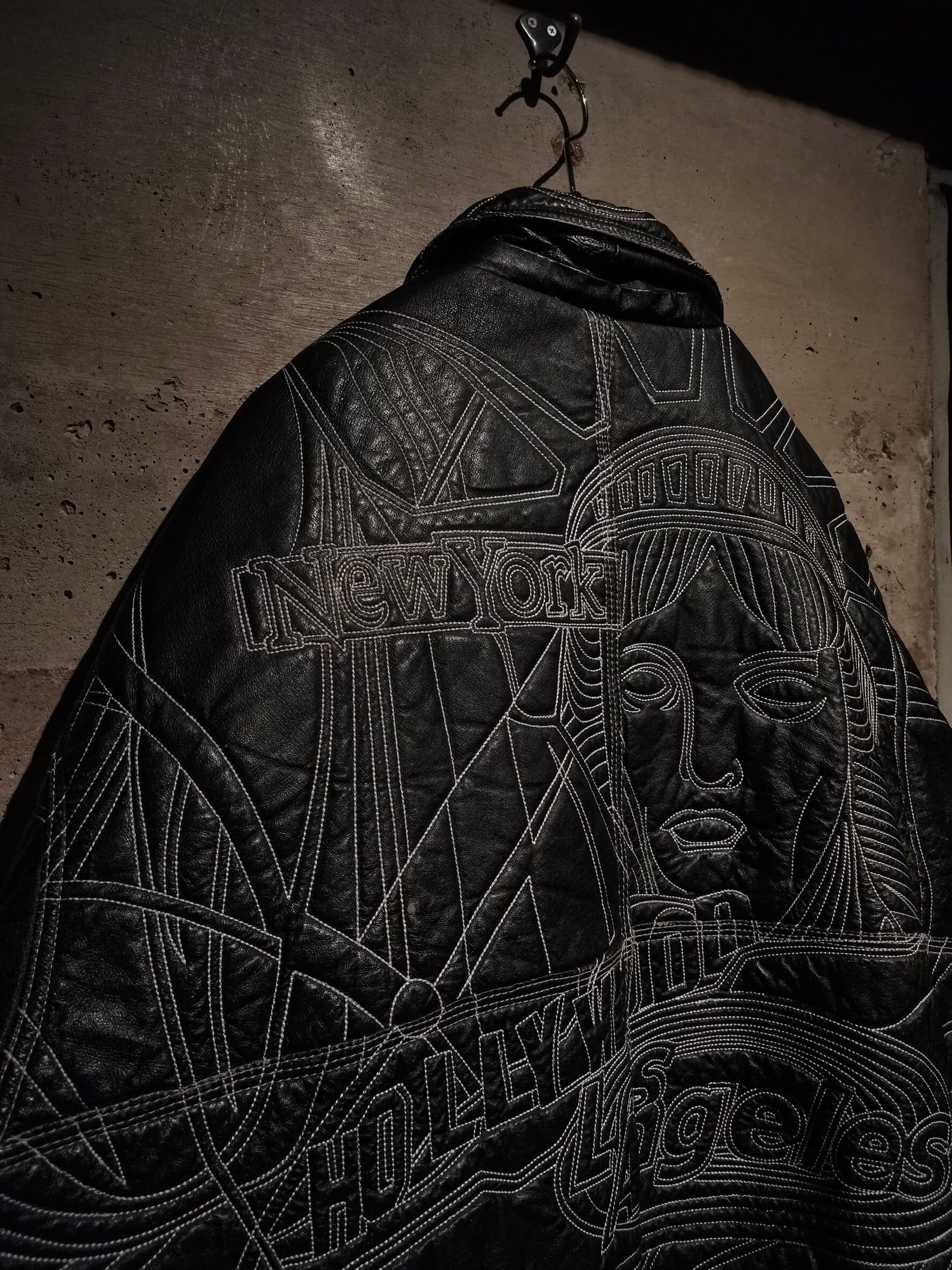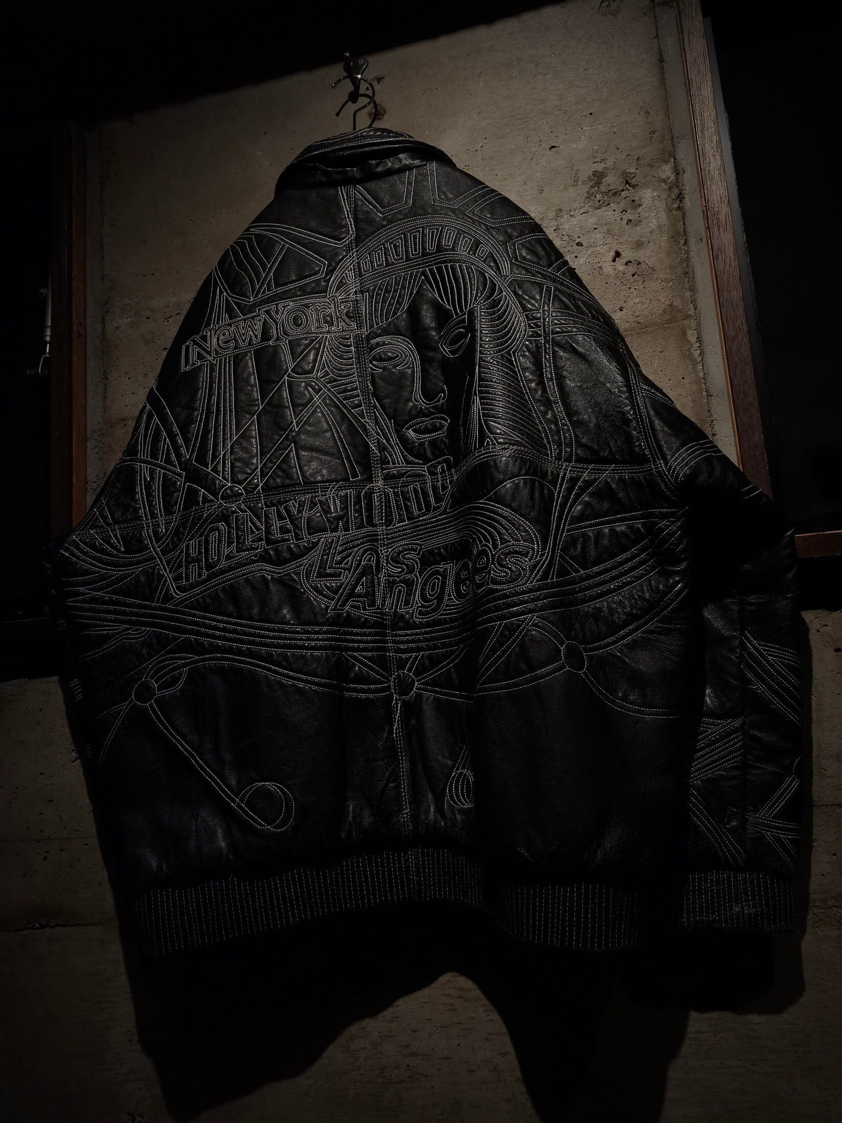 上質な鈍い光沢を放つブラックのレザーに、巧みなステッチワークによって、アメリカの様々な土地のデザインを施した超スペシャルなジャケット。