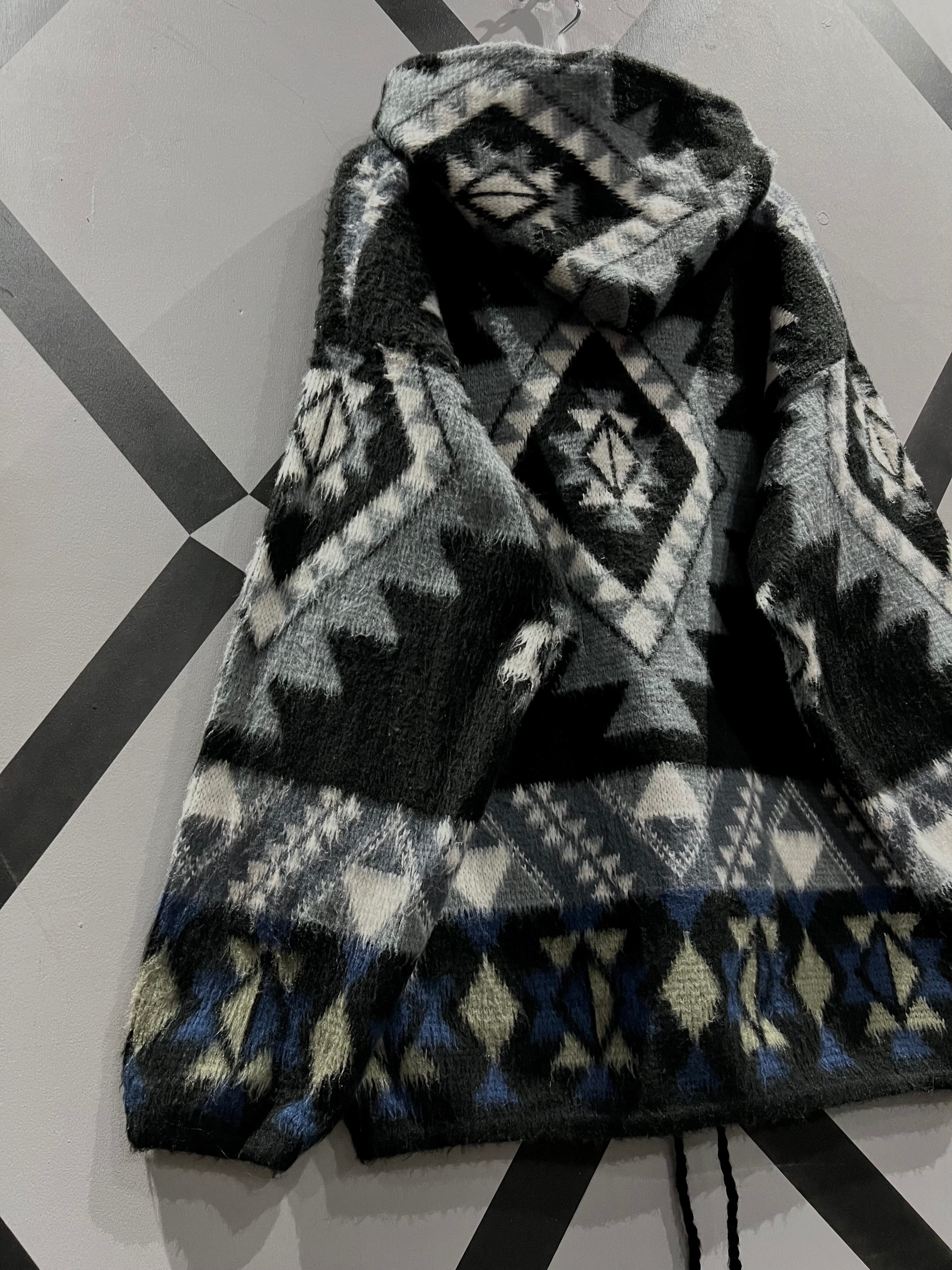 ふわっと柔らかい素材のボディ全体に、ネイティブ柄を配した1着。モノトーンベースで纏めつつ、裾周りはグレーと青を組み込んだ柄を混ぜることでデザインに奥行きを生み出しています。