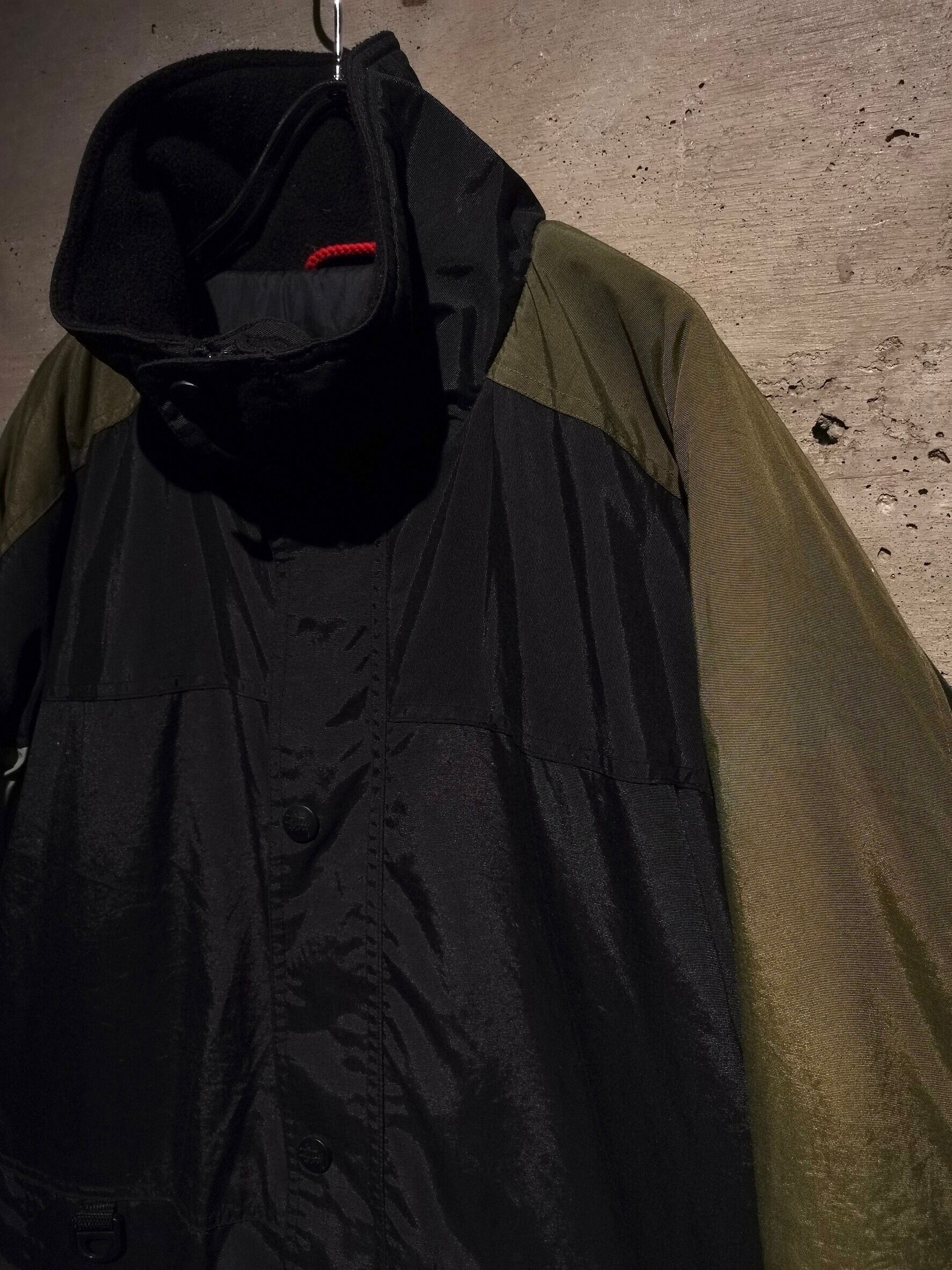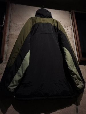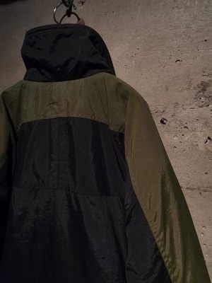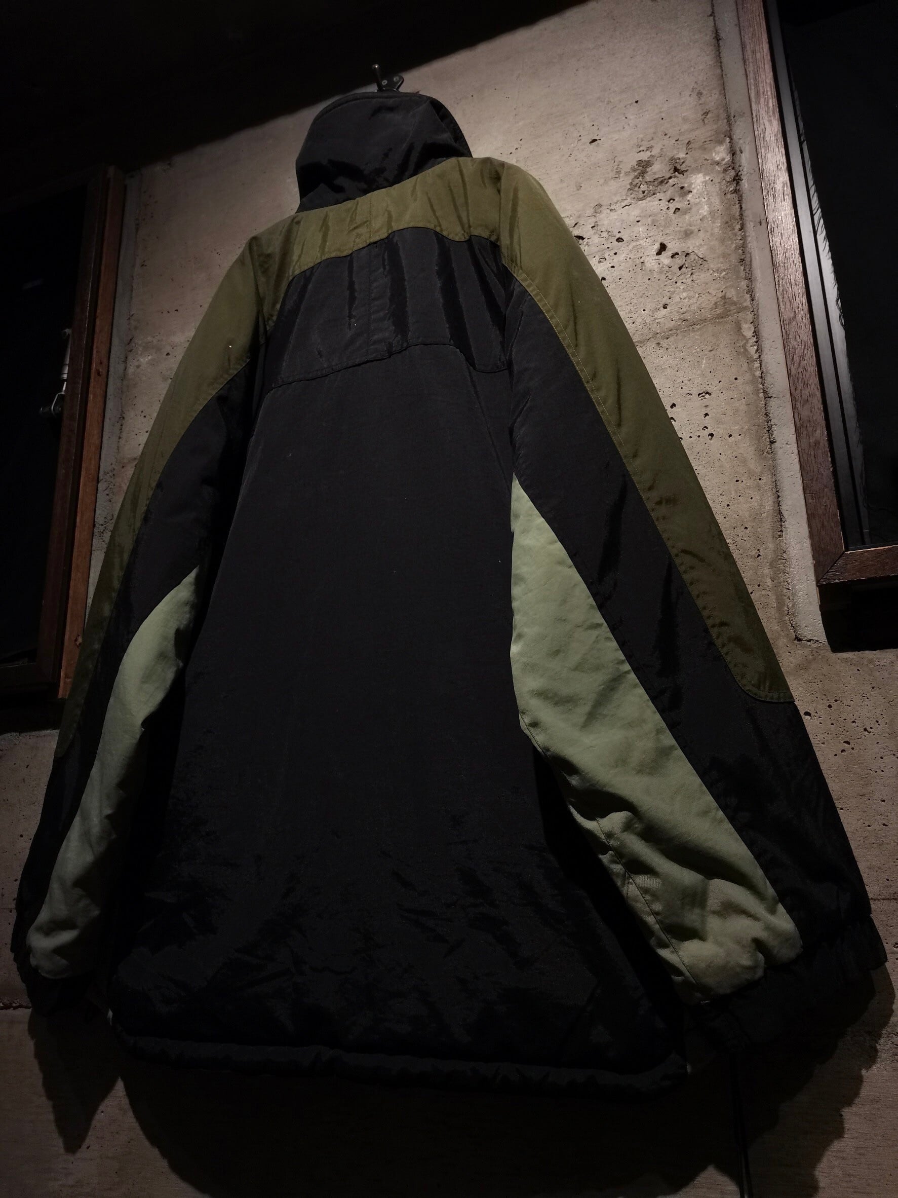 パリッとした黒のナイロン素材をボディのベースに、アームをカーキ×シルバーで切り替えたナイロンパデットジャケット。