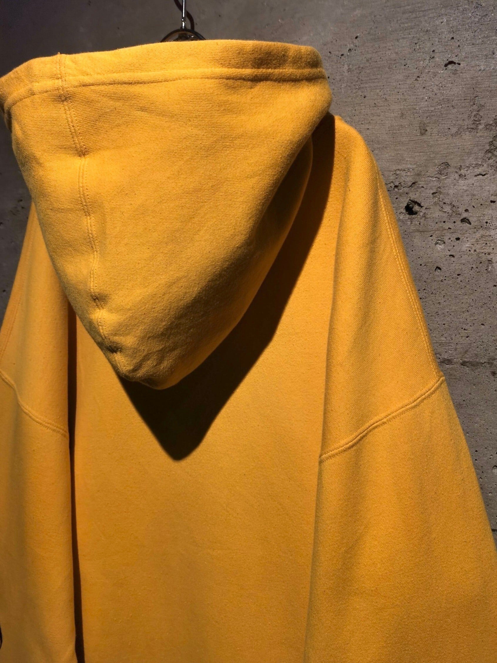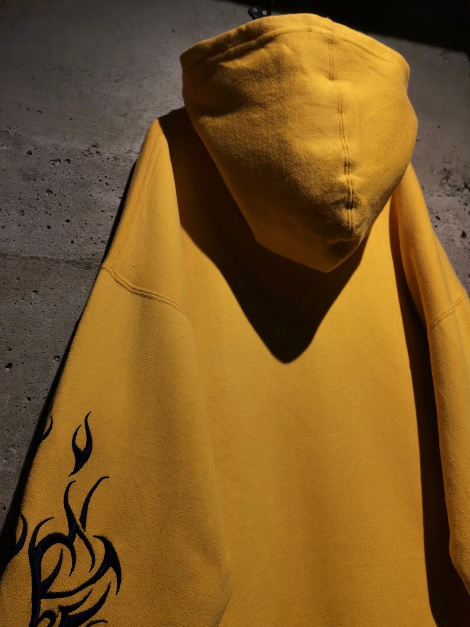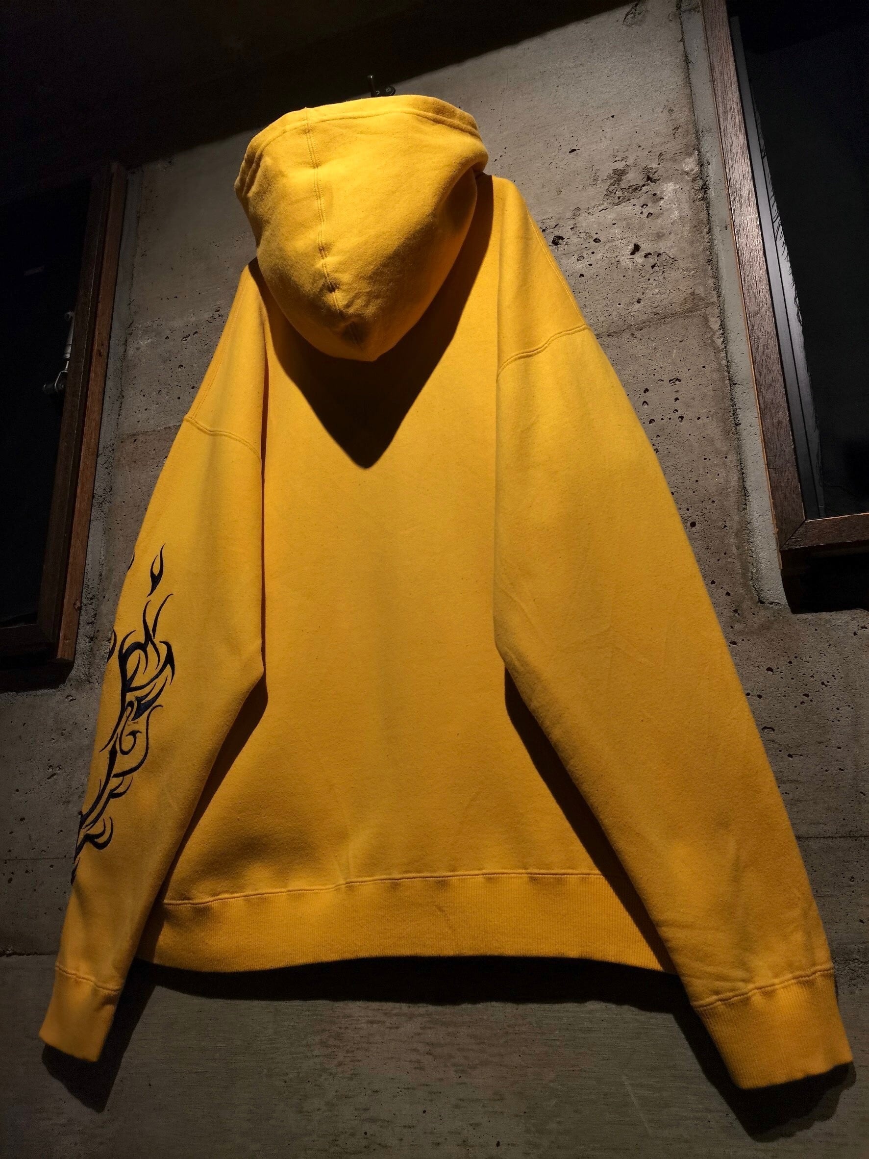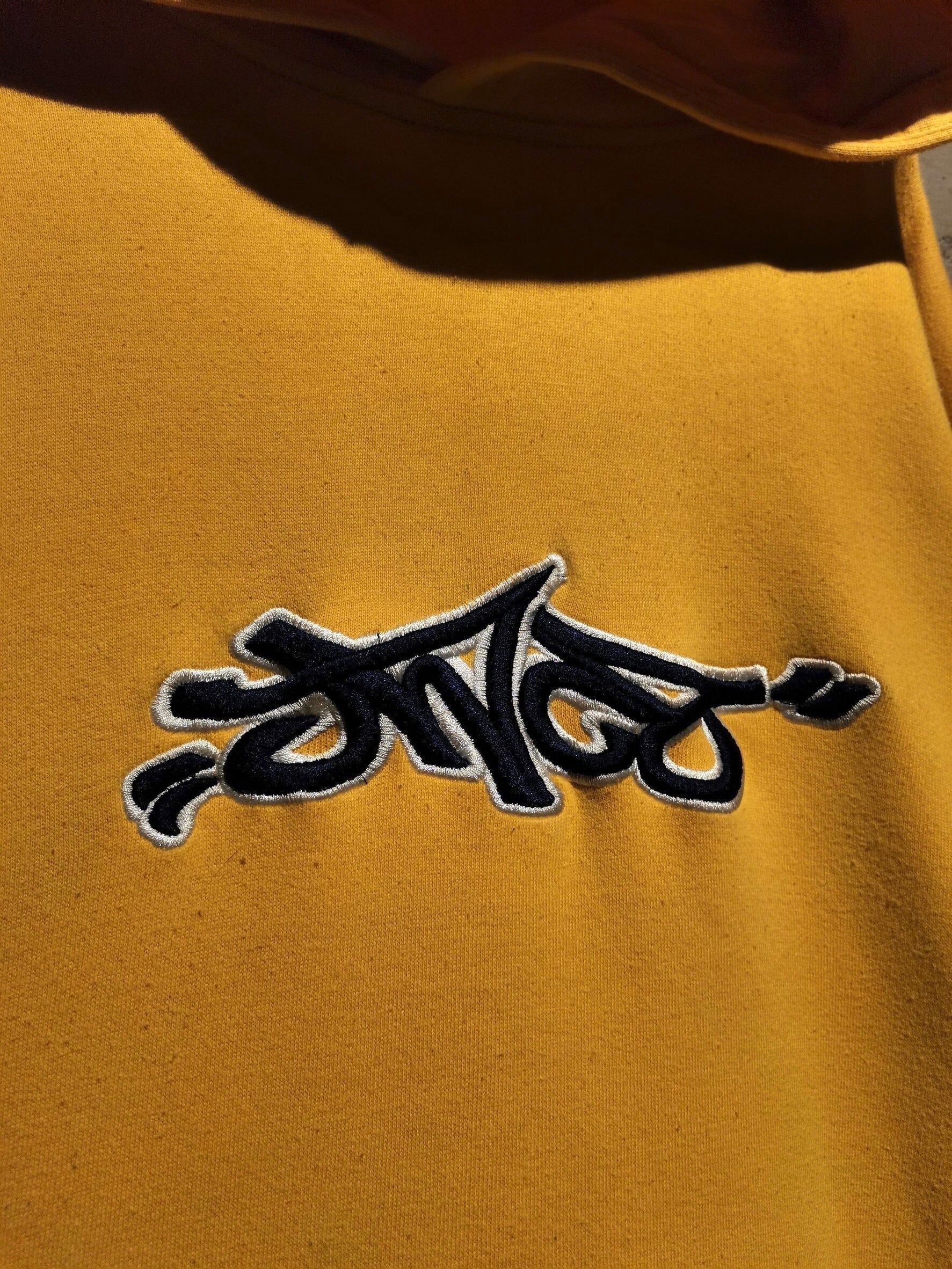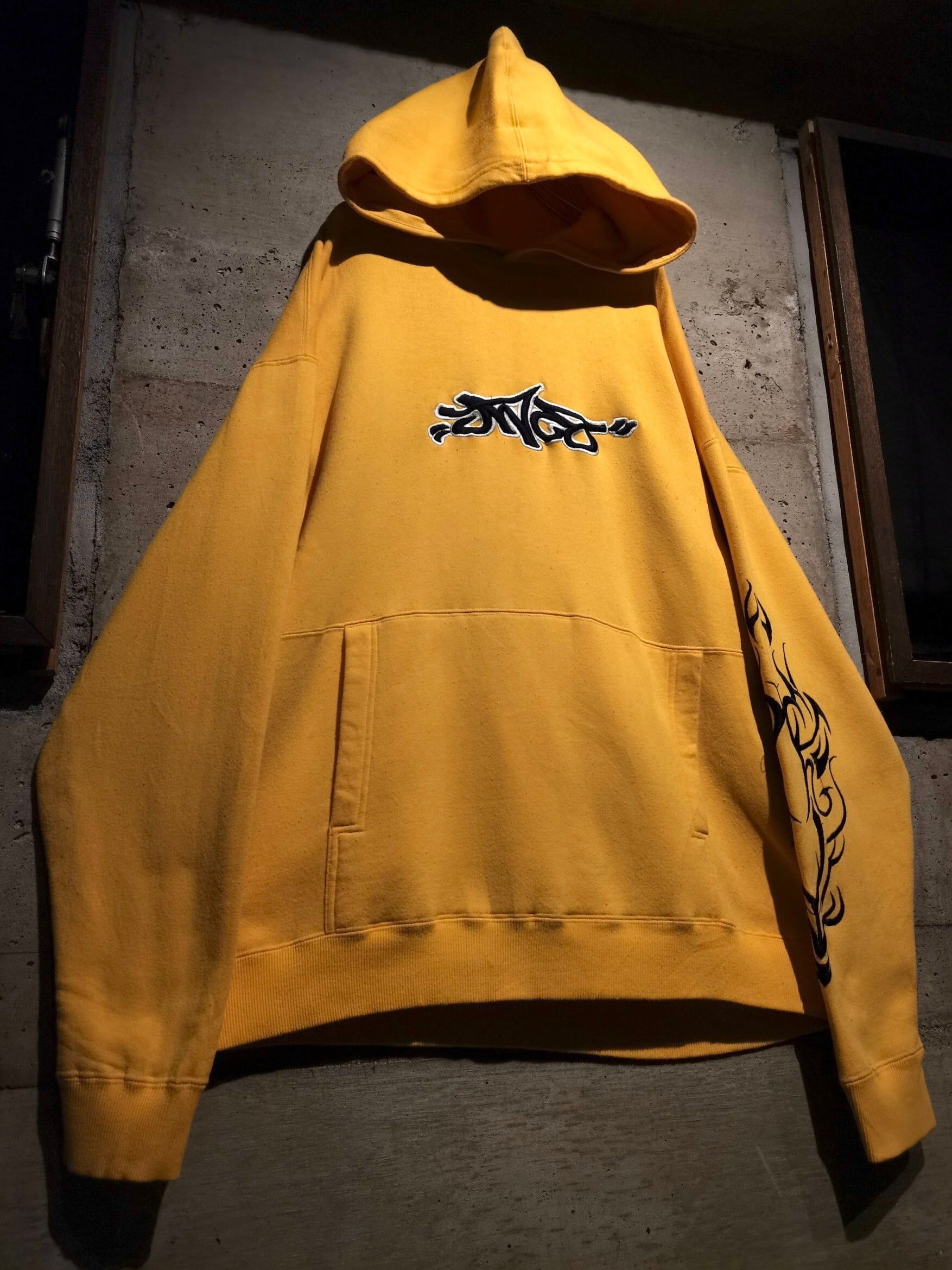鮮やかなイエローのボディに、ネイビーのブランドロゴ、トライバルな刺繍を刻んだフーディ。