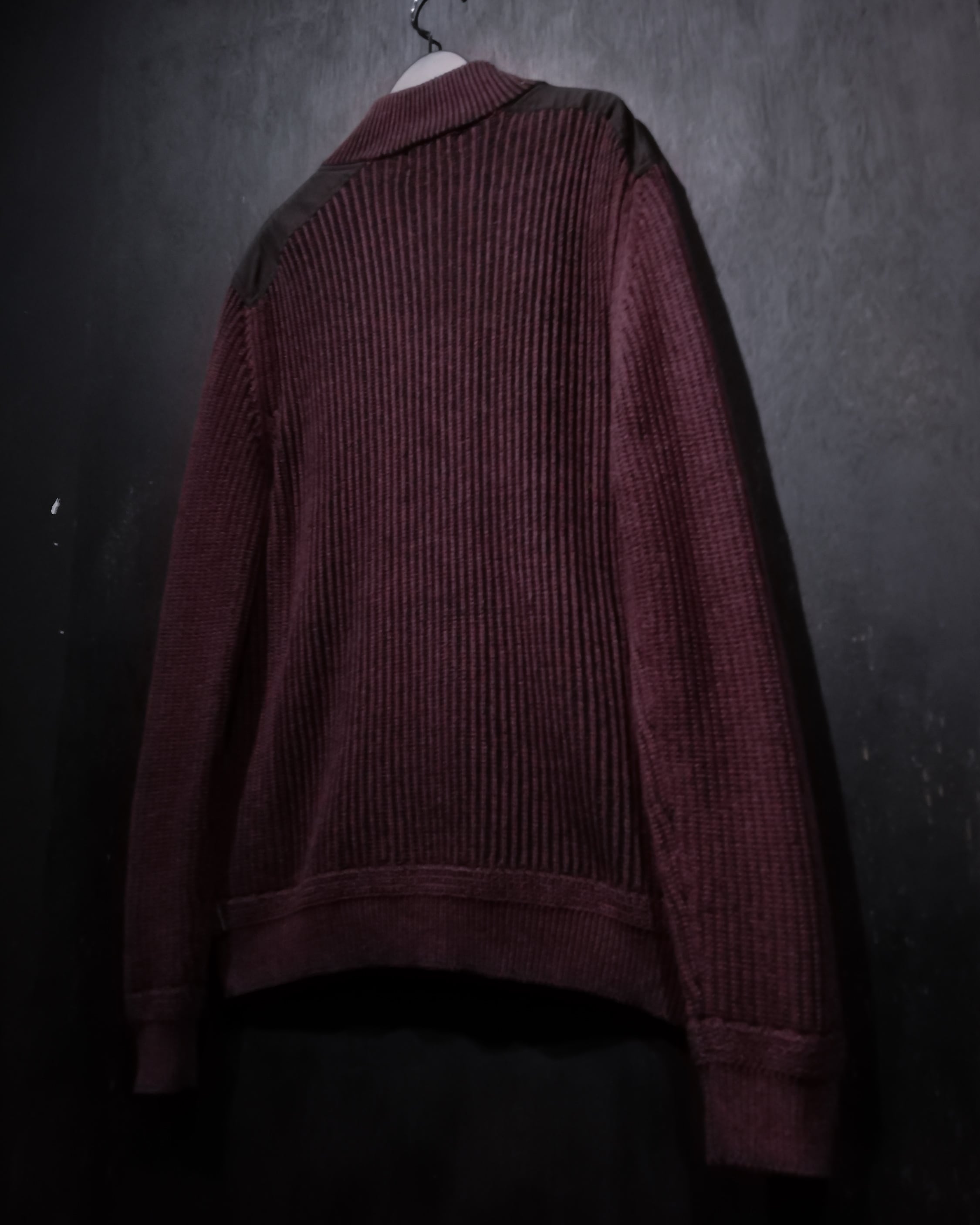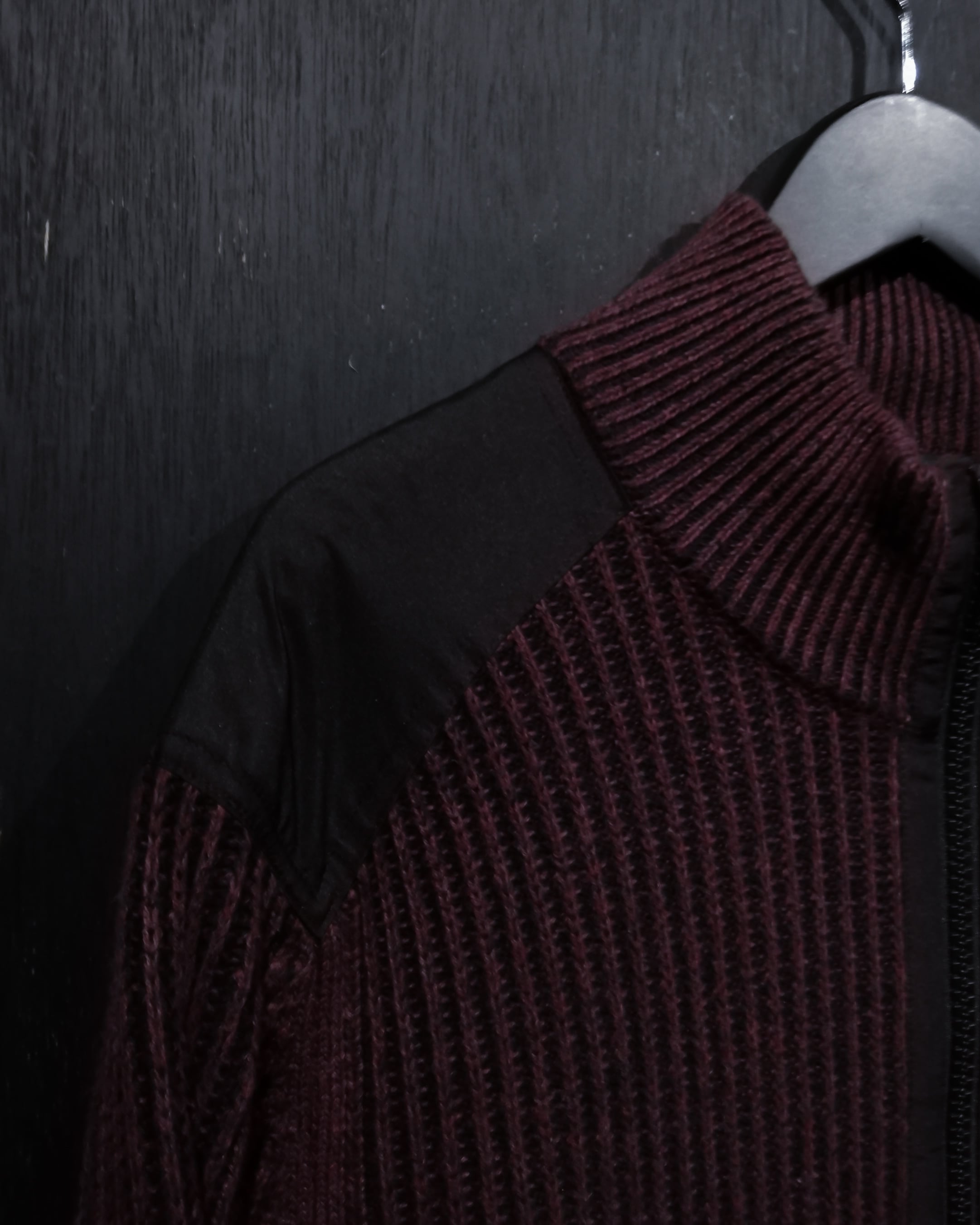 濃いワインレッドの丈夫なコットン生地をベースに、肩部分はハリのある素材で切り替えられ、絶妙な奥行きを表現したドライバーズ型のジップアップニット。