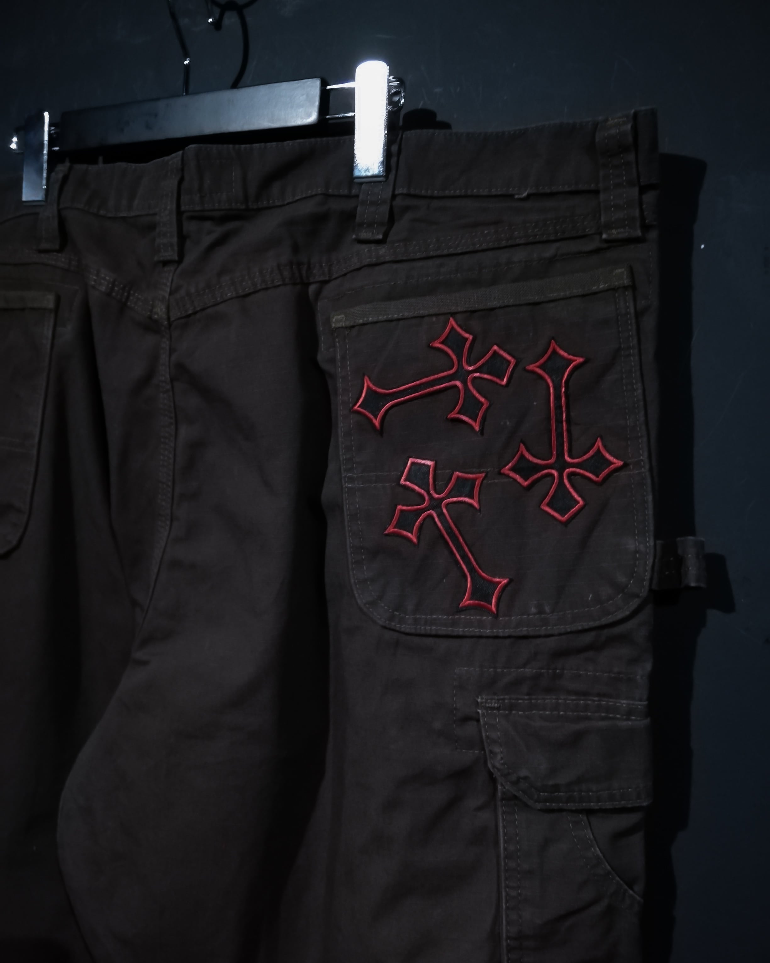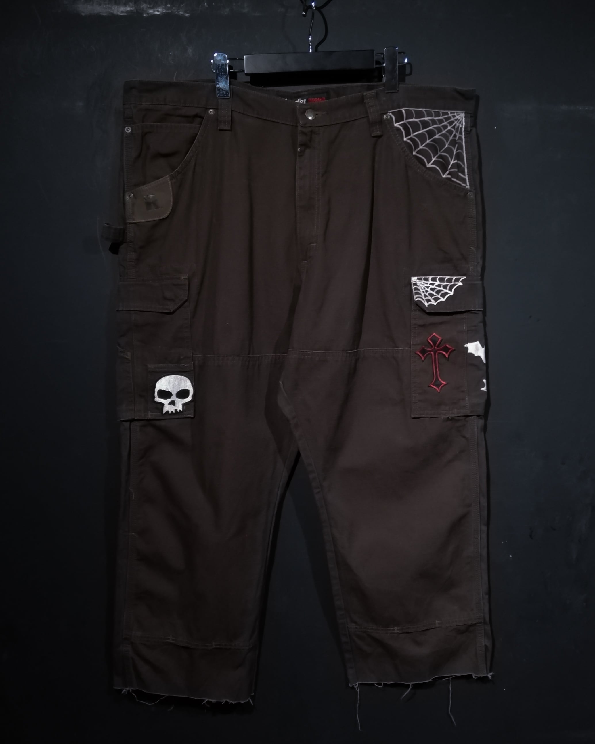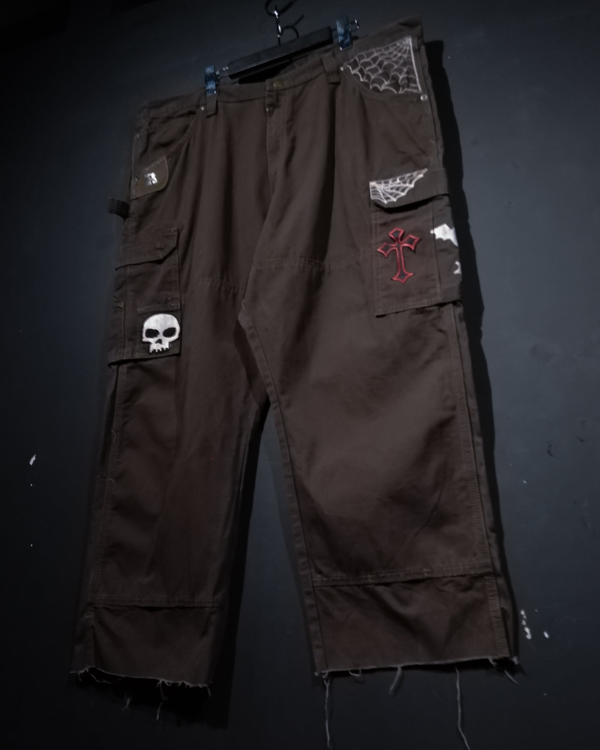 タフなブラウンのリップストップ生地をベースに、随所に蜘蛛の糸やコウモリのペイント、クロスやドクロのワッペンデザインを載せた、全所有者の思想が乗りに乗った1本。