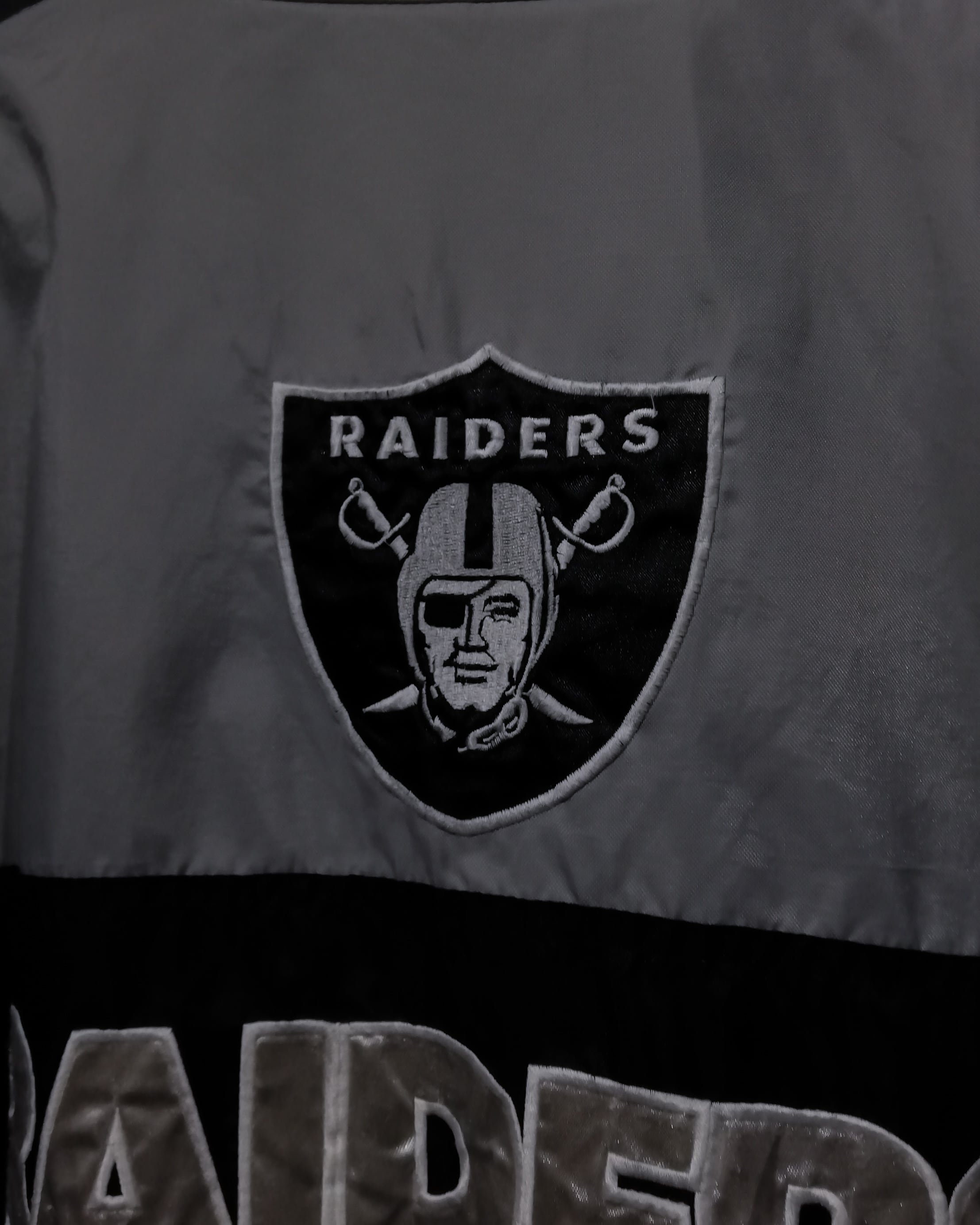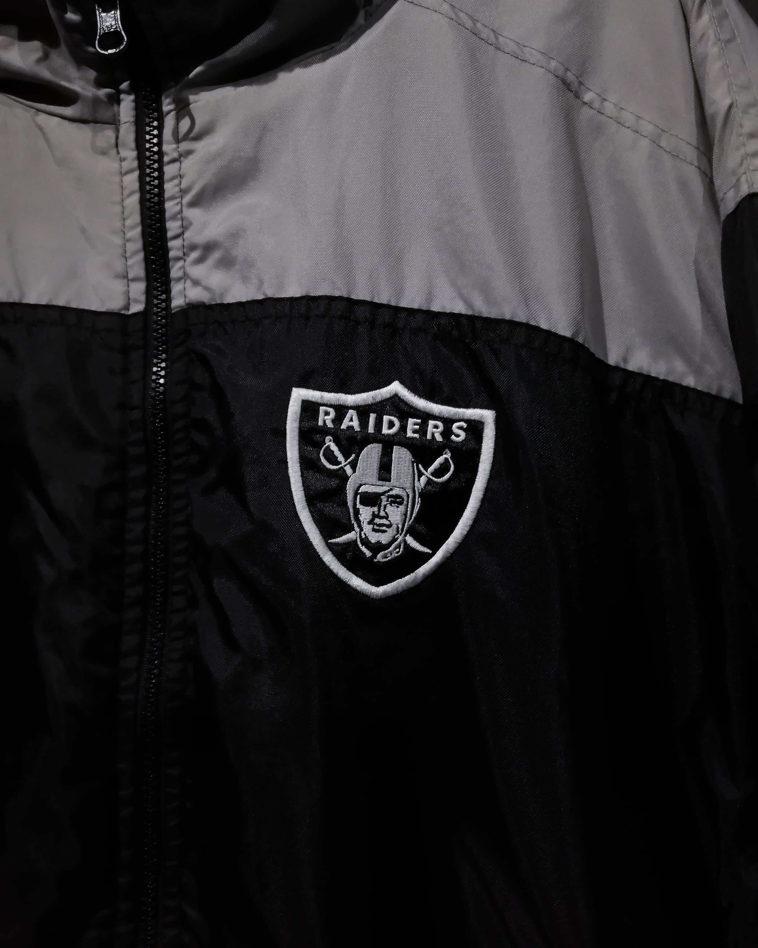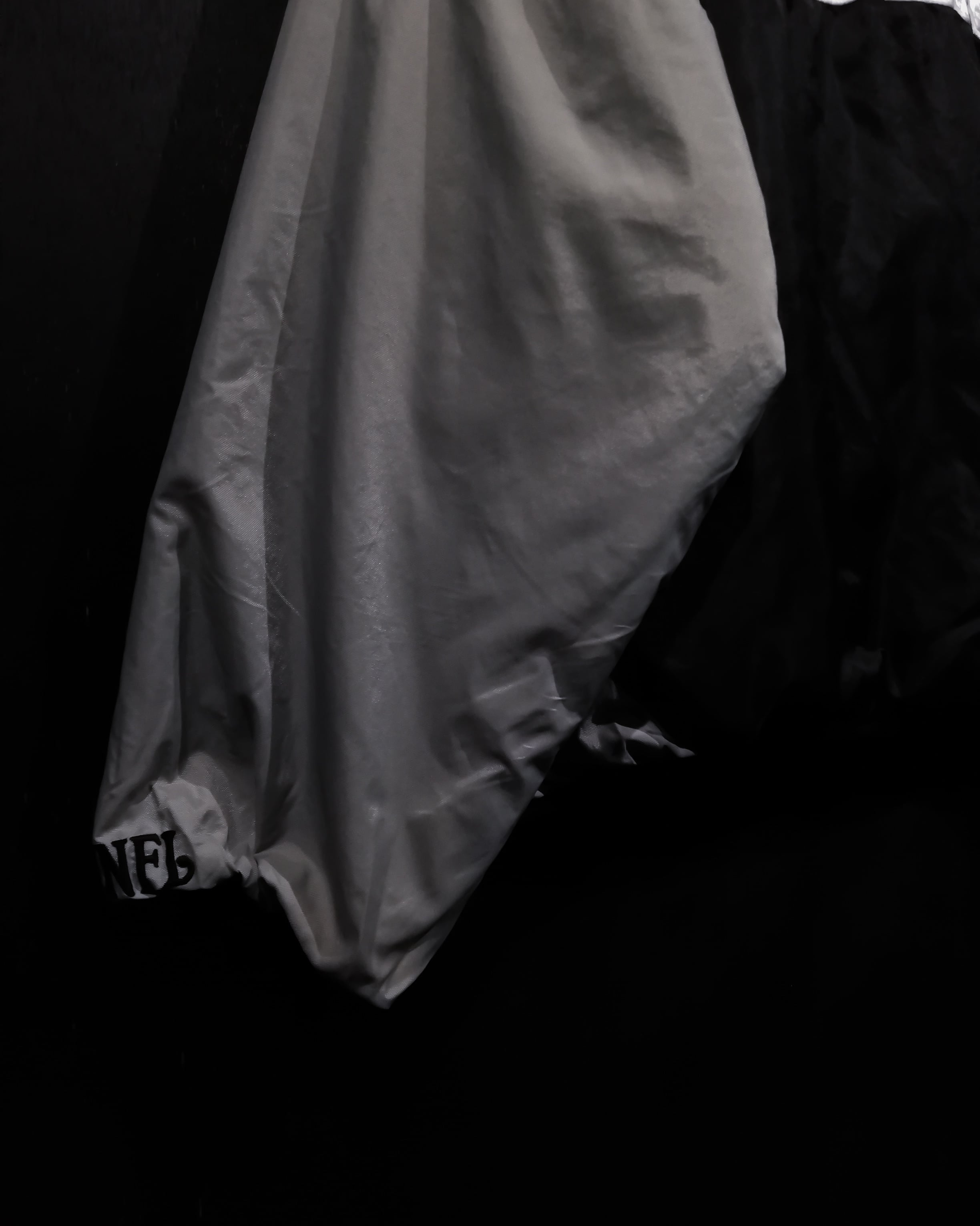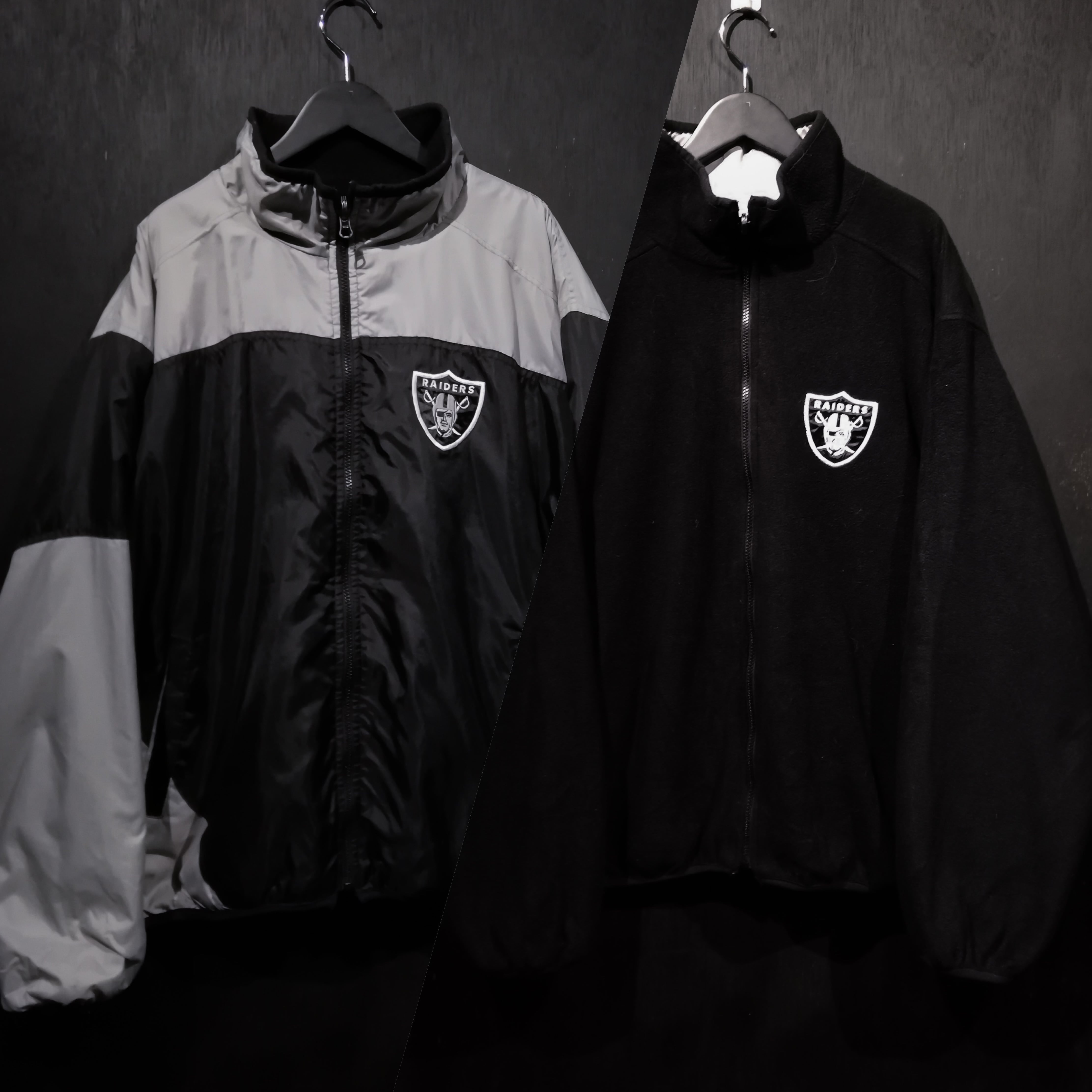 ブラックベースのフリースボディに左胸にはレイダースを象徴するロゴ刺繍をON。ガバッと裏返すとナイロン素材で、チームカラーである黒とシルバーを切り替えたボディに、フロントとバックにロゴ刺繍、バックに"RAIDERS"の文字を施した両面汎用性の高いジャケット。