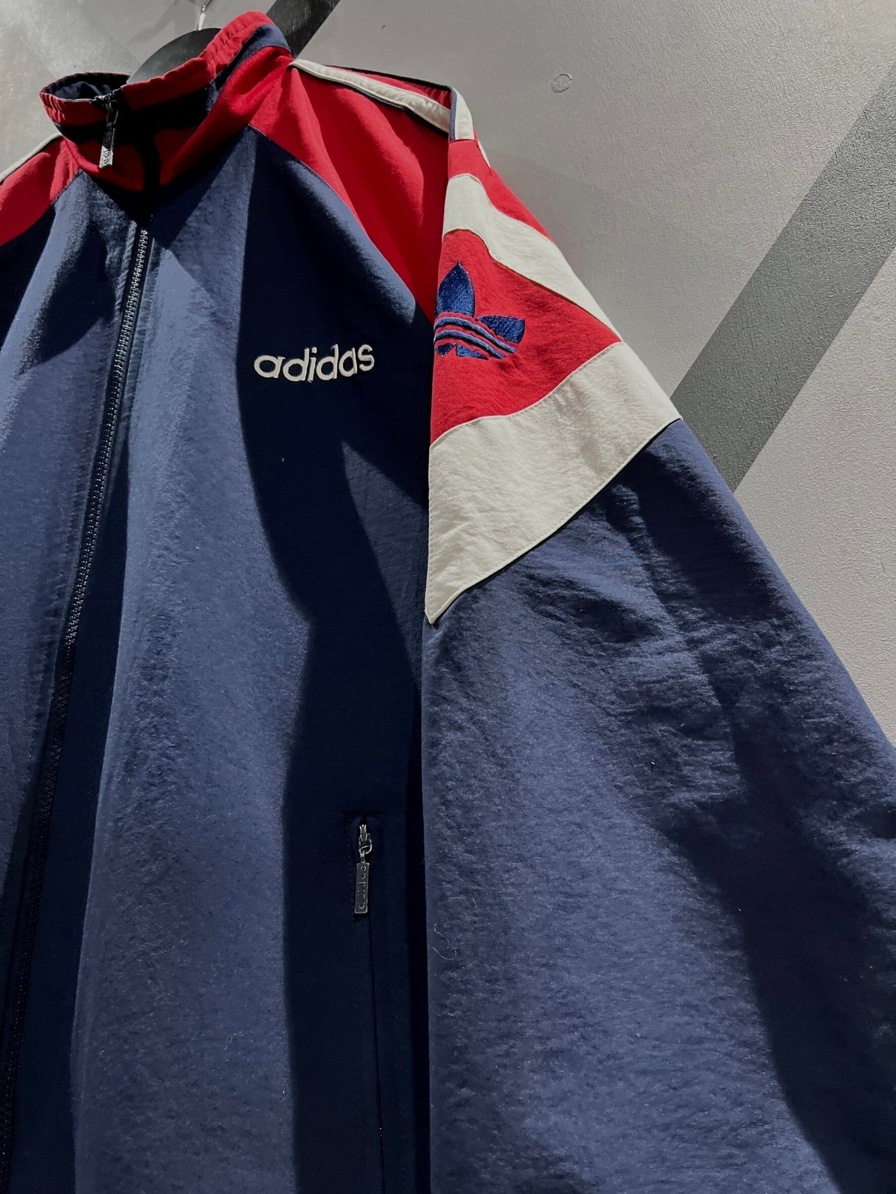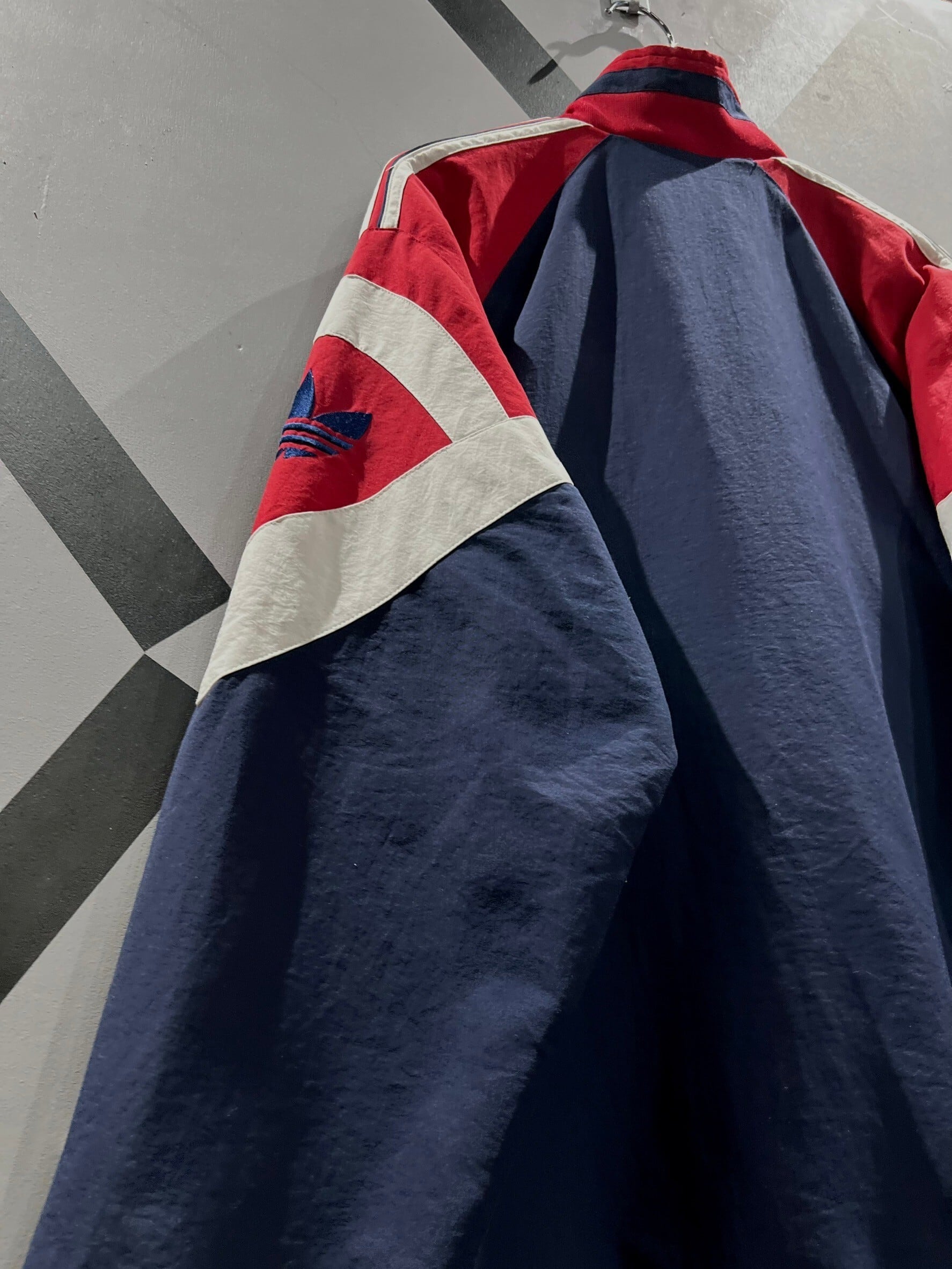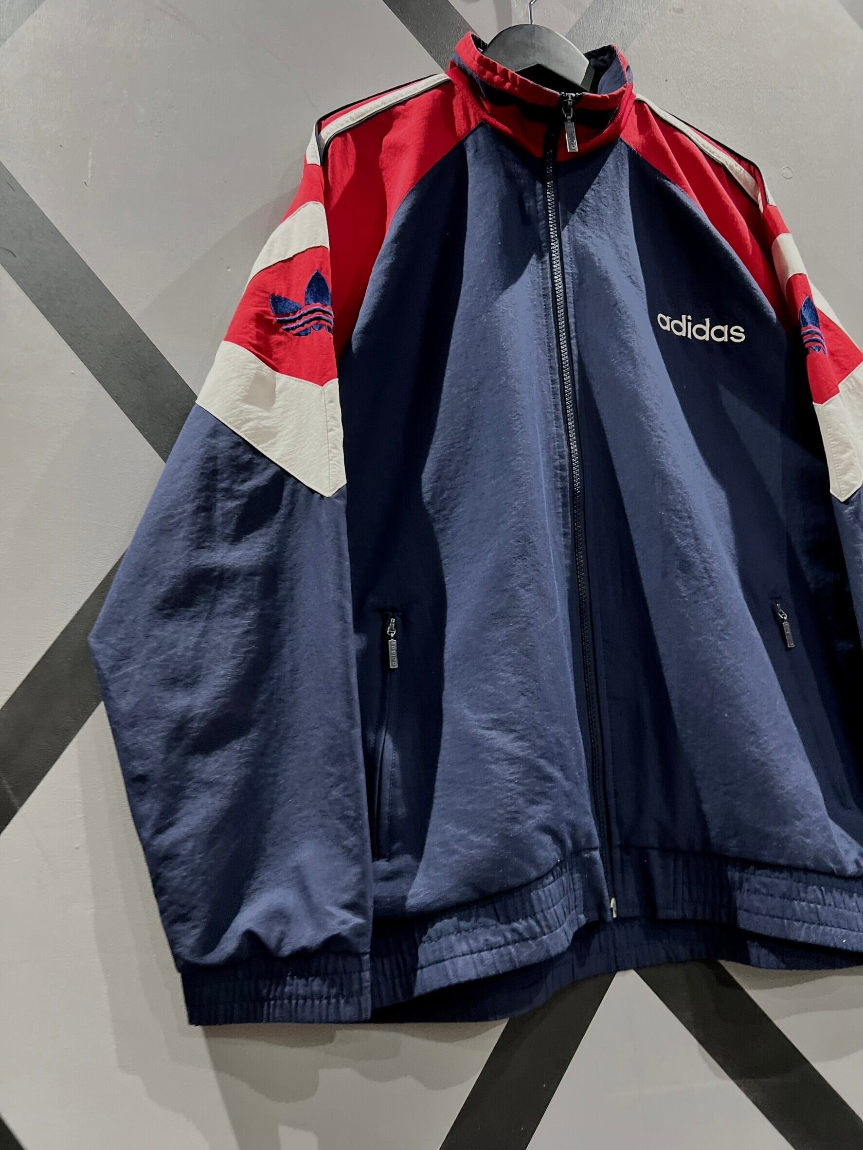 ネイビーをベースに、赤×ホワイトで仕上げられた、この年代らしいスポーティながらレトロな配色がイケてるヴィンテージアディダスのナイロントラックジャケット。肩にはこのブランドのアイデンティティでもある3ストライプスに、アームにはトレフォイルロゴを刺繍でON。