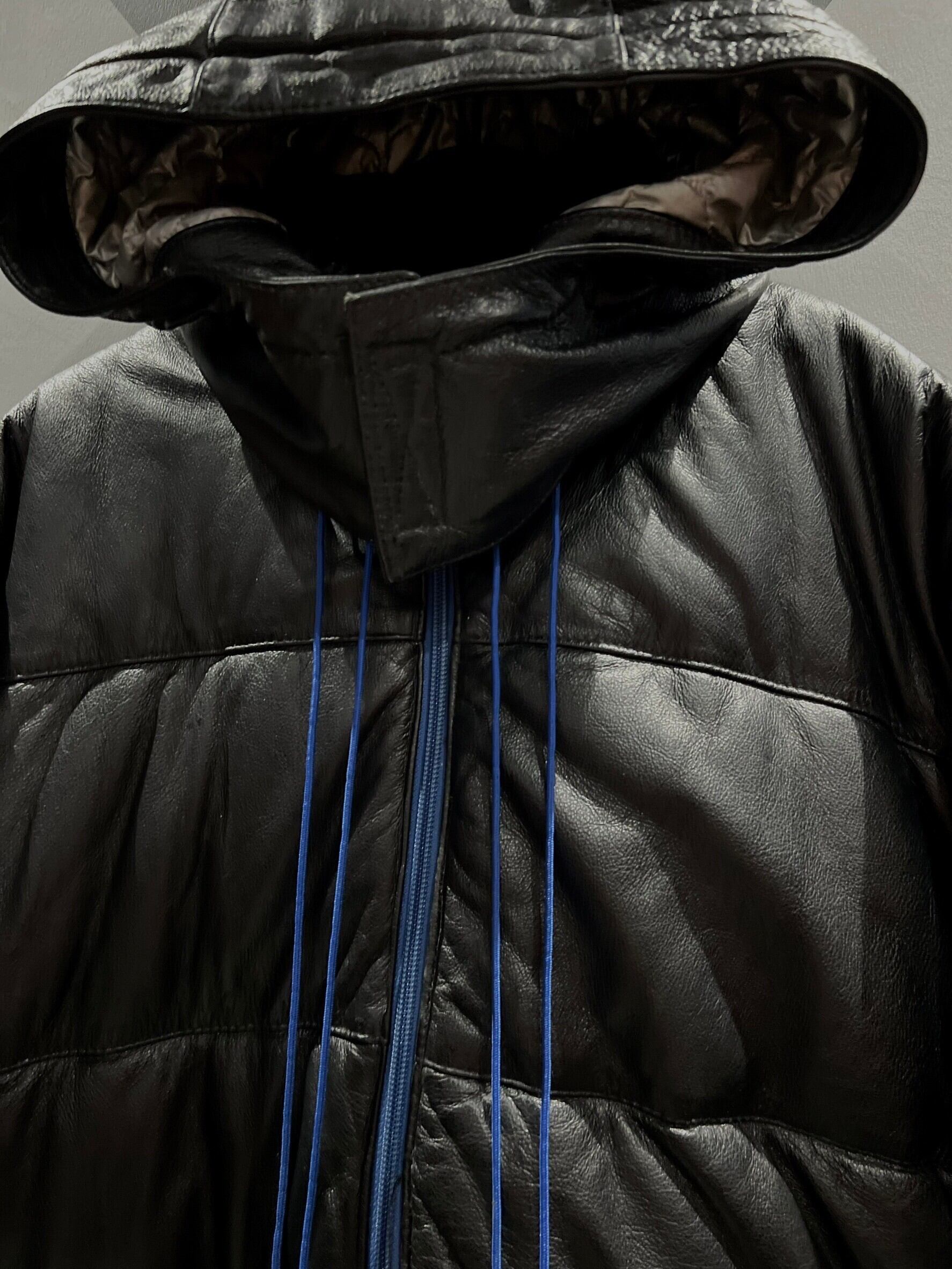 このブランドならでのハリのある上質なブラックレザーを用いたボディに、ダウンをパンパンに詰め込んだダウンジャケット。