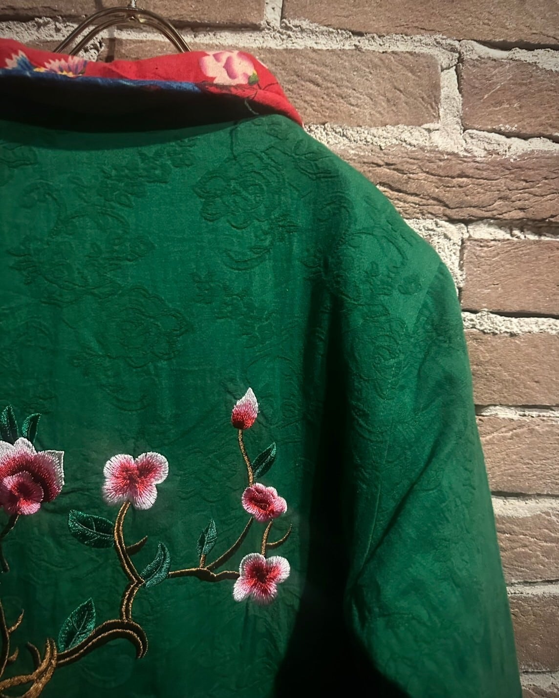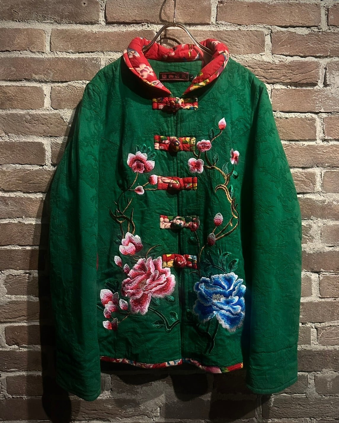 鮮やかなグリーンのボディに、緻密で繊細な刺繍で非常〜に美しい花の刺繍を刻んだチャイナジャケット。