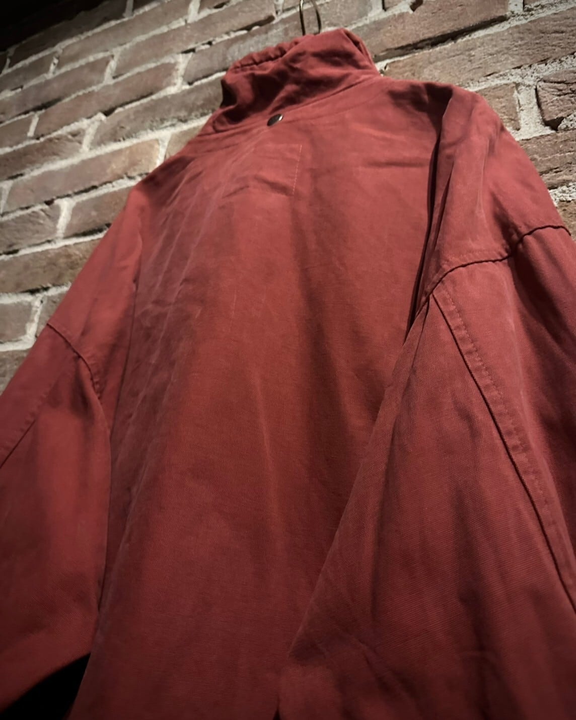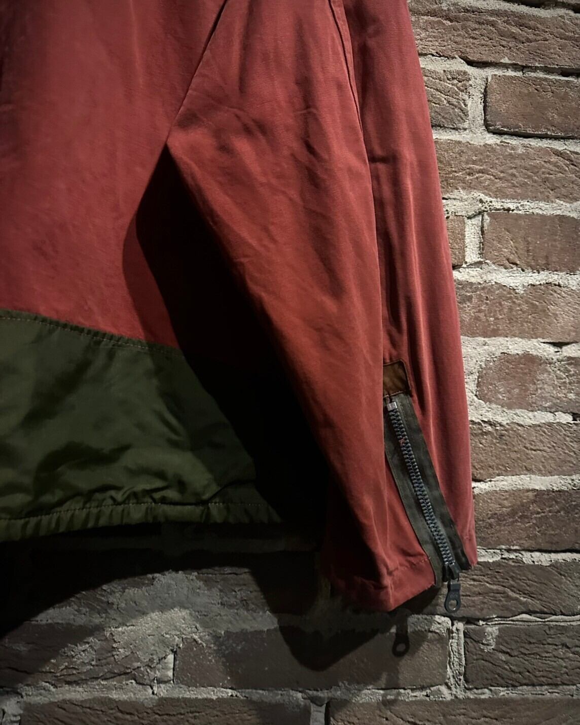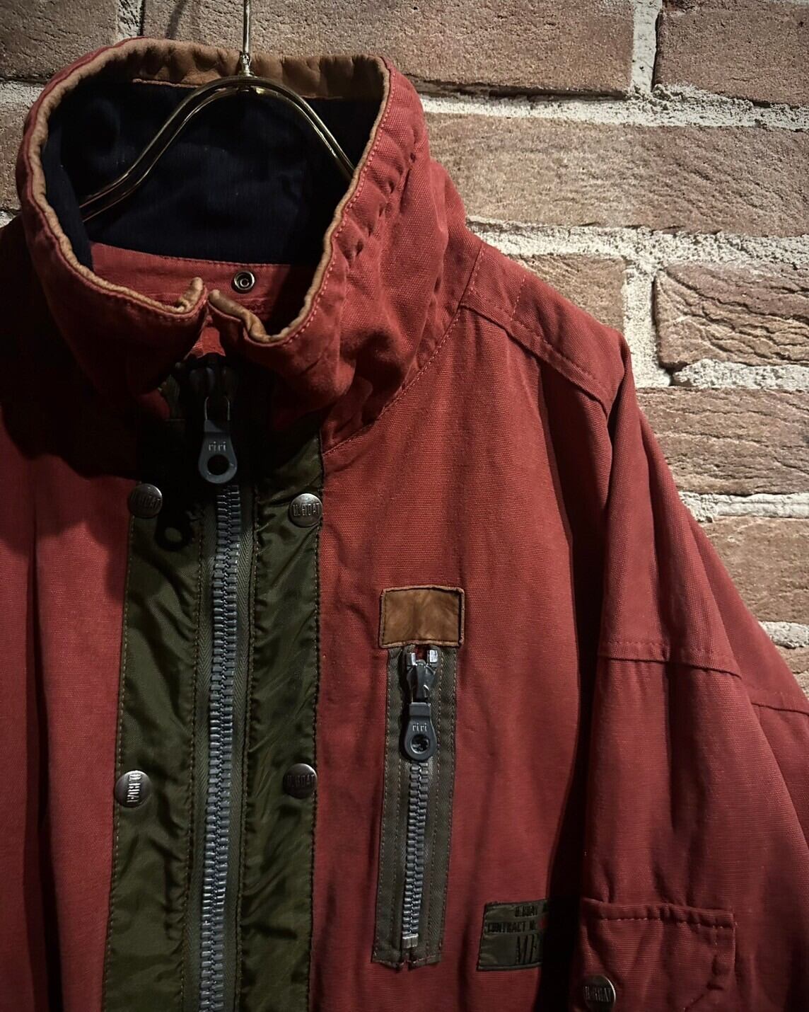 フロントのジップや鈍い光沢を放つボタンもデザインのアクセントになりつつ、カーキの光沢のある素材の切り替えで立体感を演出。かなり拘りの見えるデザインに服好きの心がくすぐられます。