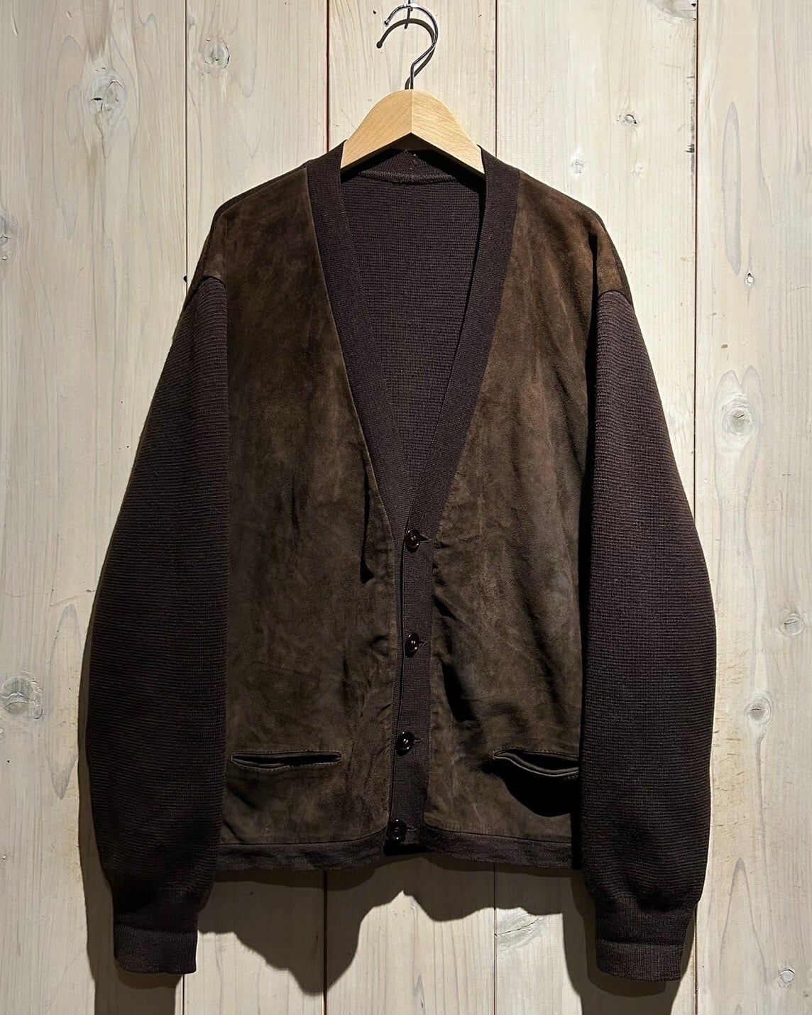 ニットカーディガンに大胆にスエードレザーを切り替えた稀有な1着。異素材を巧みに組み合わせ1枚に纏め上げたカーディガンのスペシャルな逸品です。