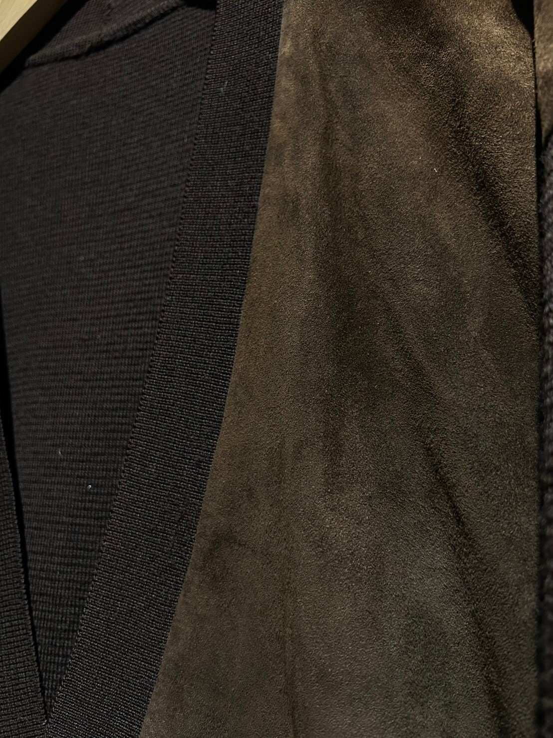 ニットの質感と、スエードレザーの掛け合わせがデザインにコントラストを演出。ダークトーンで纏め上げた配色ながらも、素材間で奥行きのあるデザインを生み出した、秀逸なデザインが素晴らしい1着。
