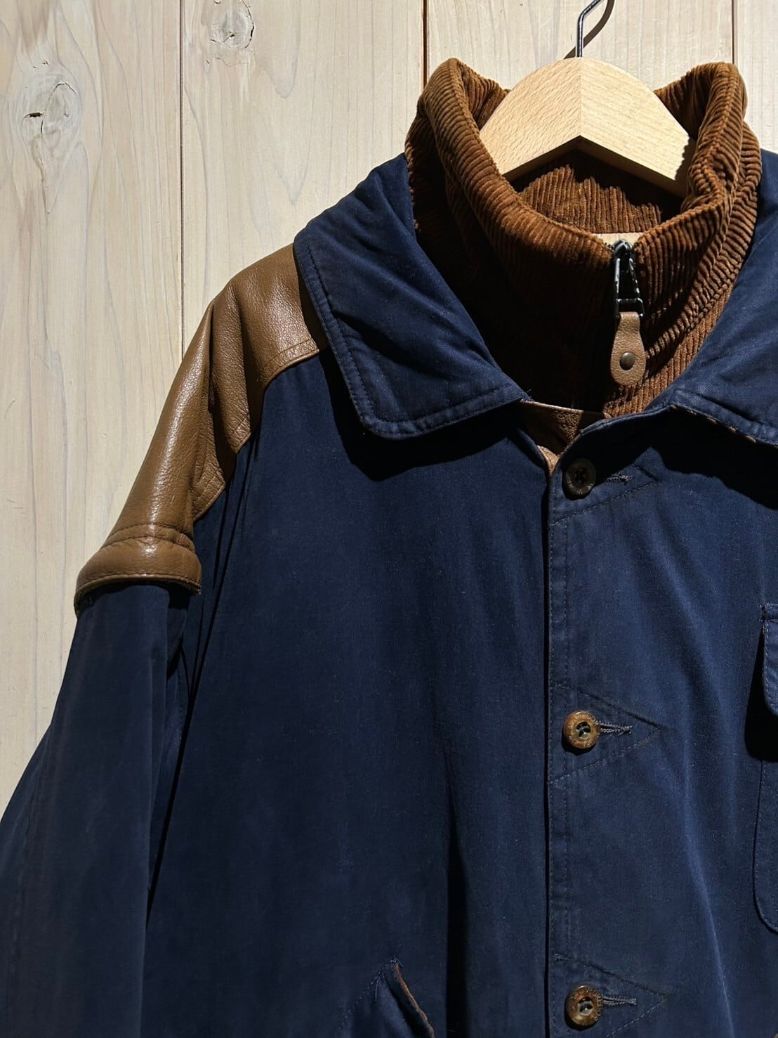 インディゴブルーのボディをベースに、ハリのあるブラウンのレザーを切り替え。更に首元にはコーデュロイを用いてレイヤード風のデザインに仕上げ、ポケットを配したりとギミック盛り沢山のジャケット。