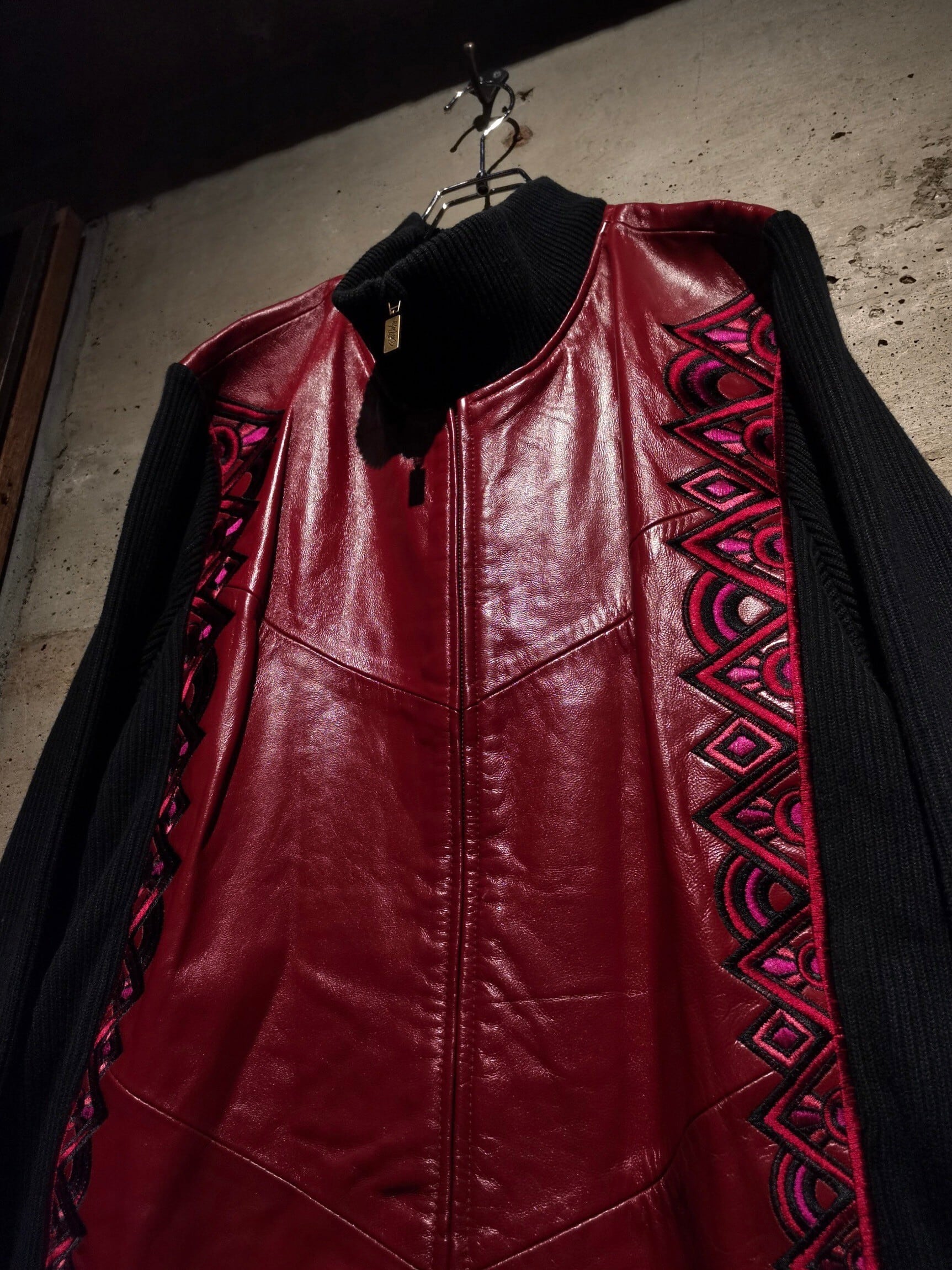 伸縮性のあるブラックのリブニットをボディのベースとして使用し、ハリ、艶のある上質な赤のレザーで身頃を切り替え。その上からこのブランドならではの繊細かつアーティスティックなフレーバーを漂わせる刺繍を刻み込んだ、スペシャルなドライバーズニット。