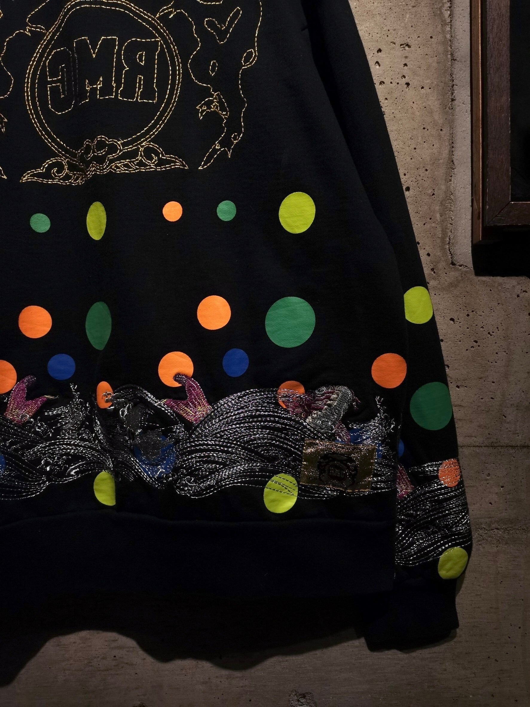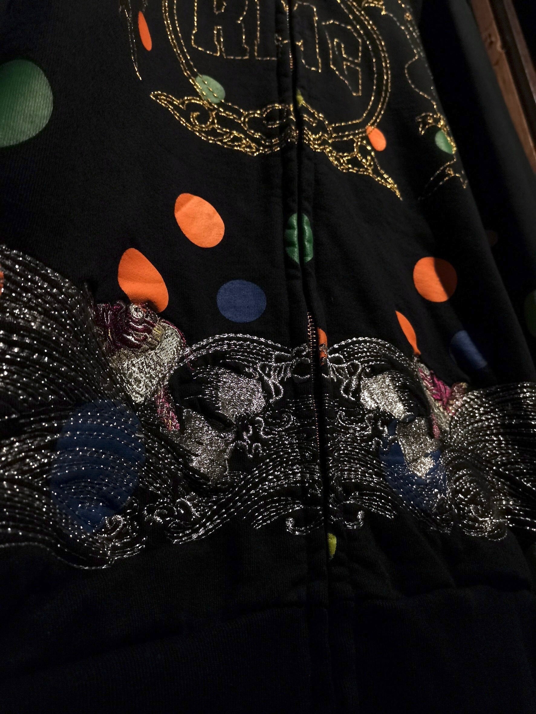 ヘビーオンスのブラックボディに、刺繍やプリントによって全体にデザインを載せた1着。