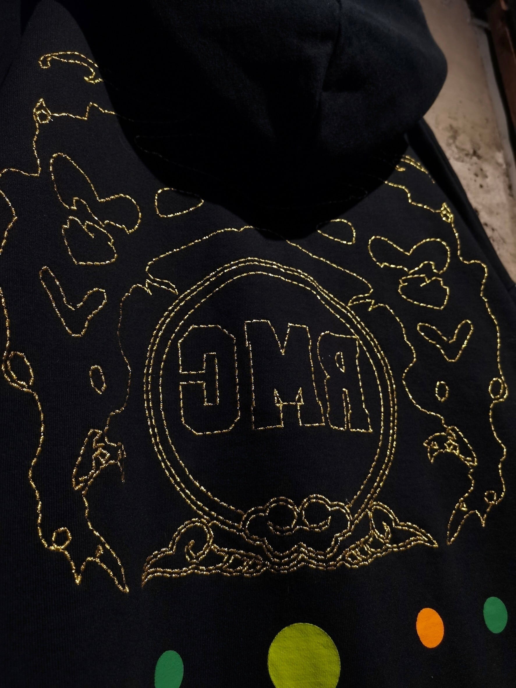 ゴールドのステッチで映し出したブランドロゴに、マルチカラーのドット柄のプリント。シルバーのステッチ×刺繍によって表現された波と鯉。