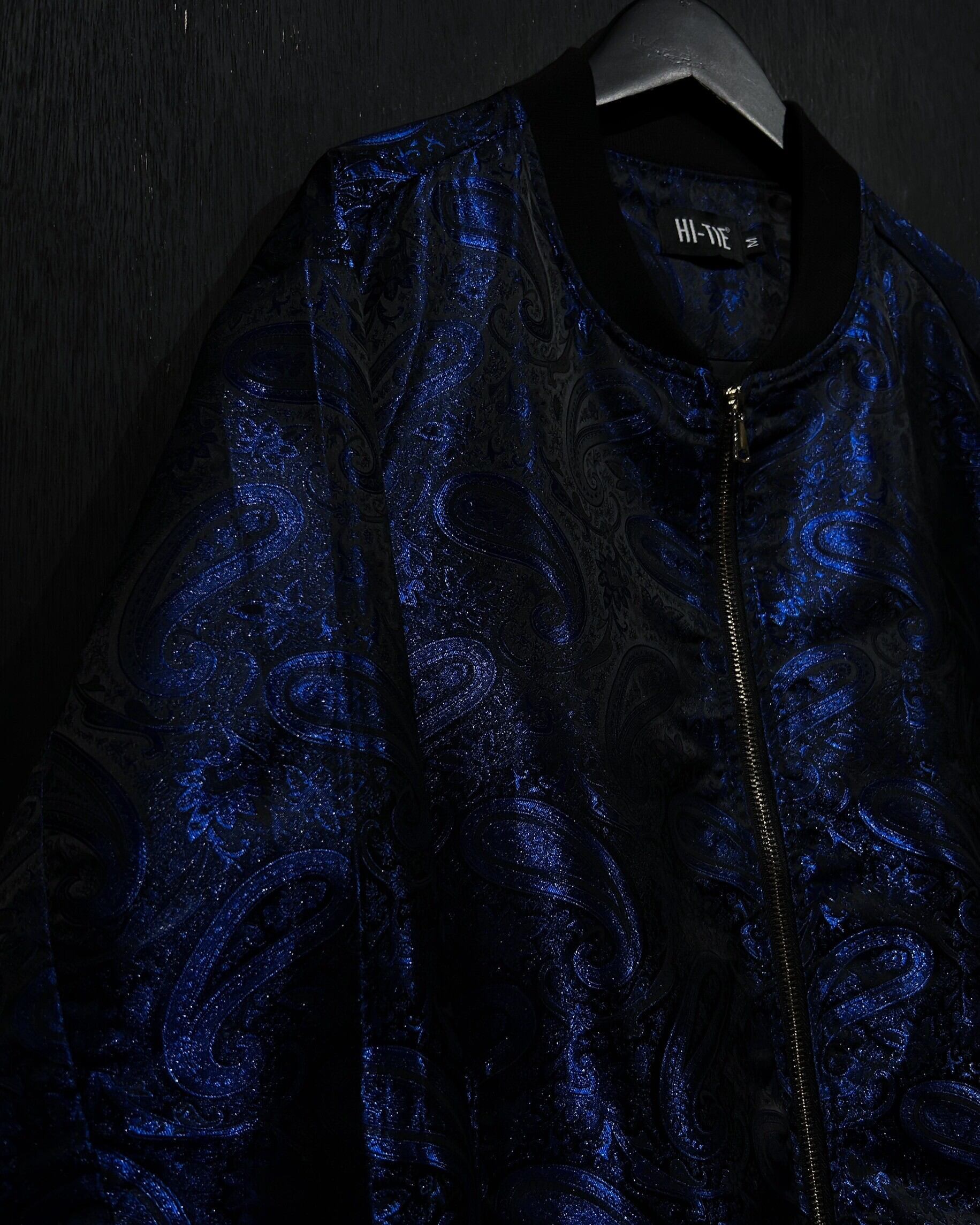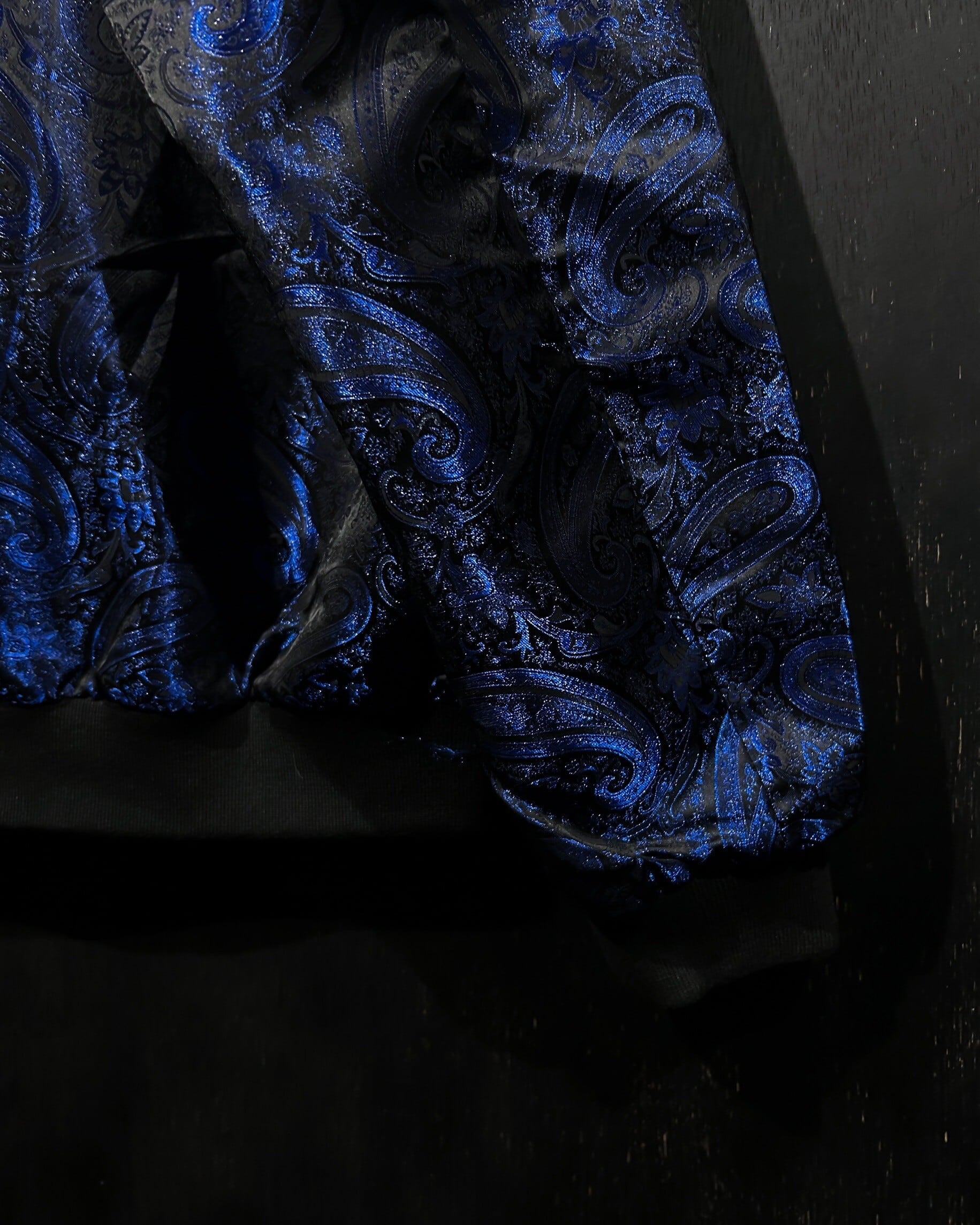 美しく光沢を放つ深いブラックのボディに、上質なジャガードの織りでペイズリー柄を載せたボンバージャケット。
