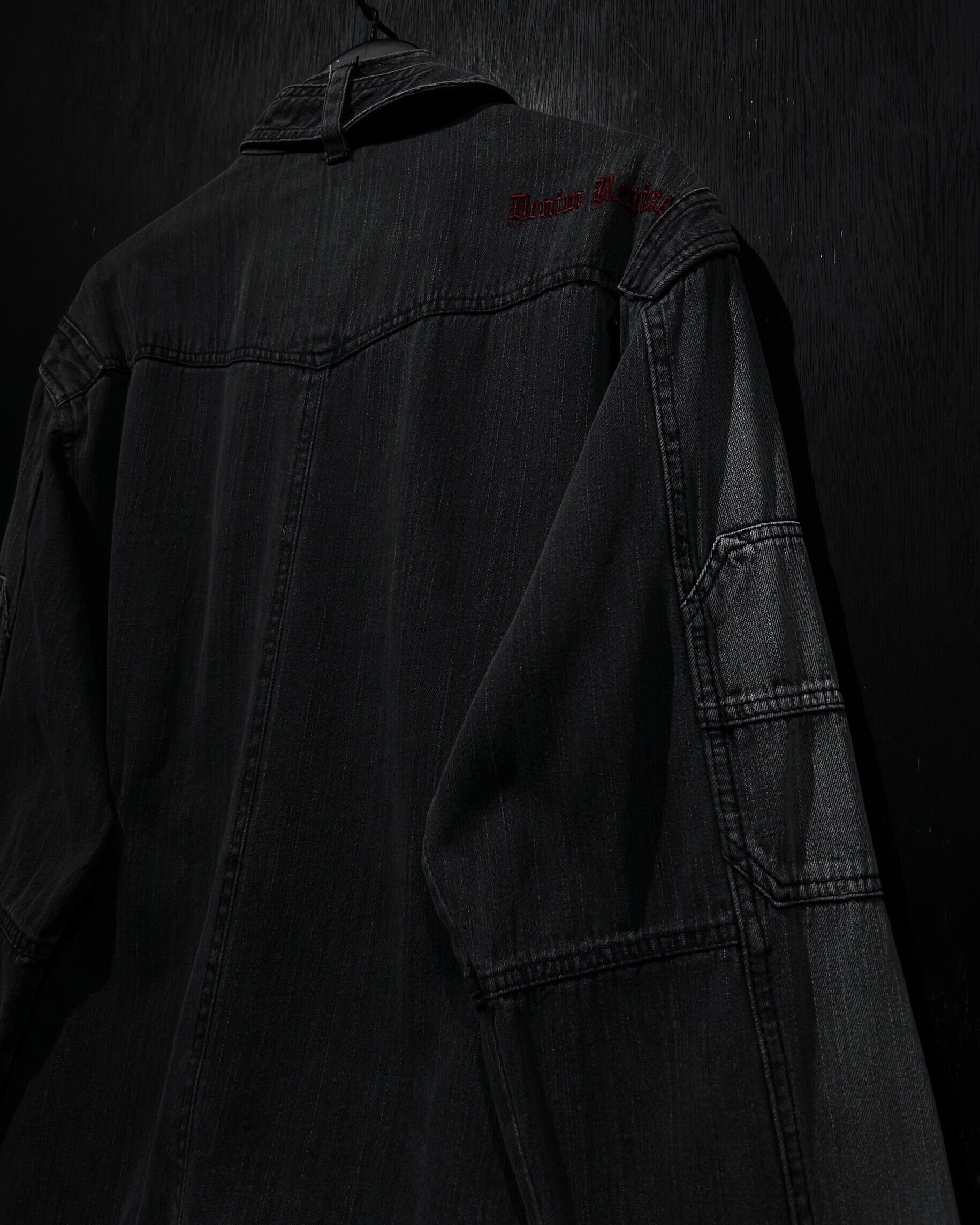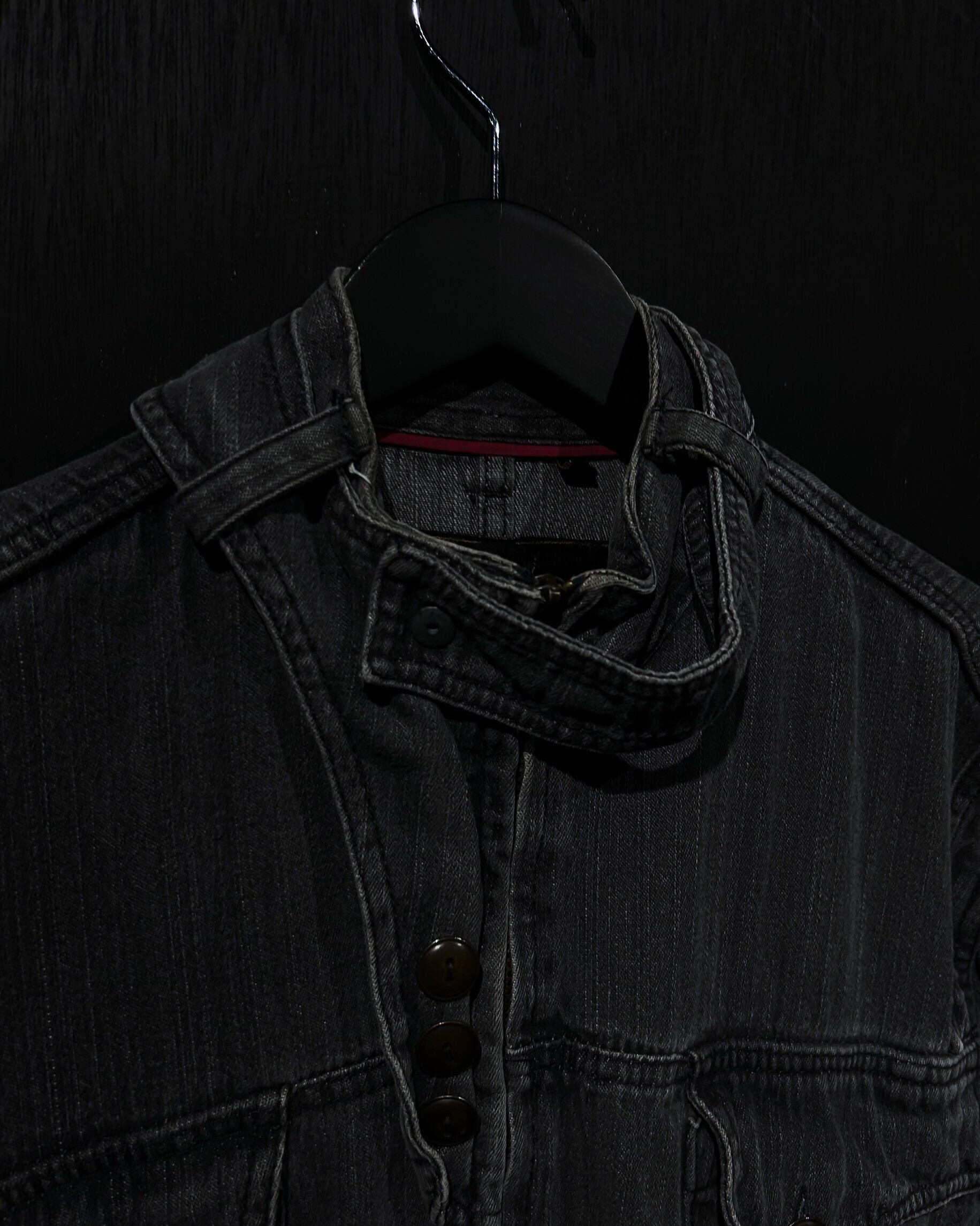 首元にはチンストラップを施し、ライダースの様な要素もMix。デニムならではの風合いは残しながらも、いわゆるデニムジャケットとは異なる存在感を放つデザイン性に富んだ素晴らしい仕上がりに。