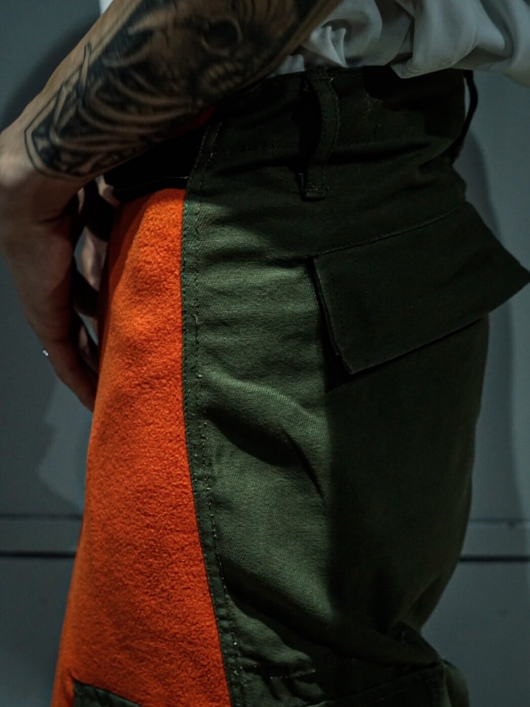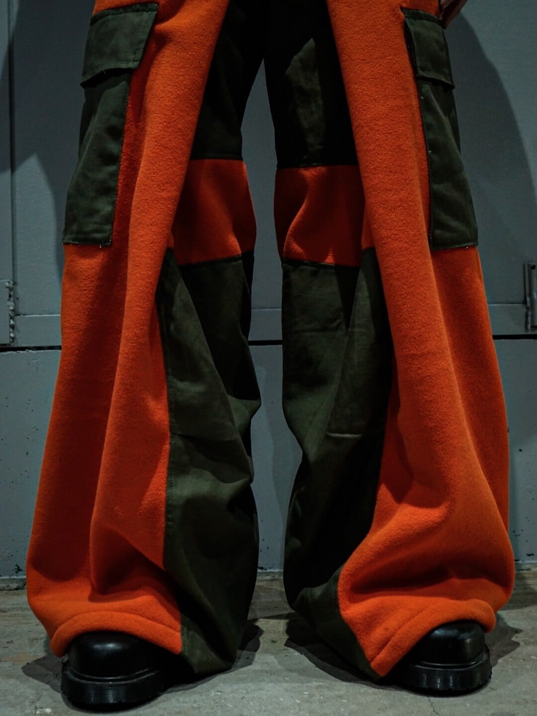 ミリタリーベースのカーゴパンツとフリース生地をドッキング。140cmを超えるウエスト部分を折り返し、立体的なレイブシルエットを生み出すリメイクの1着。