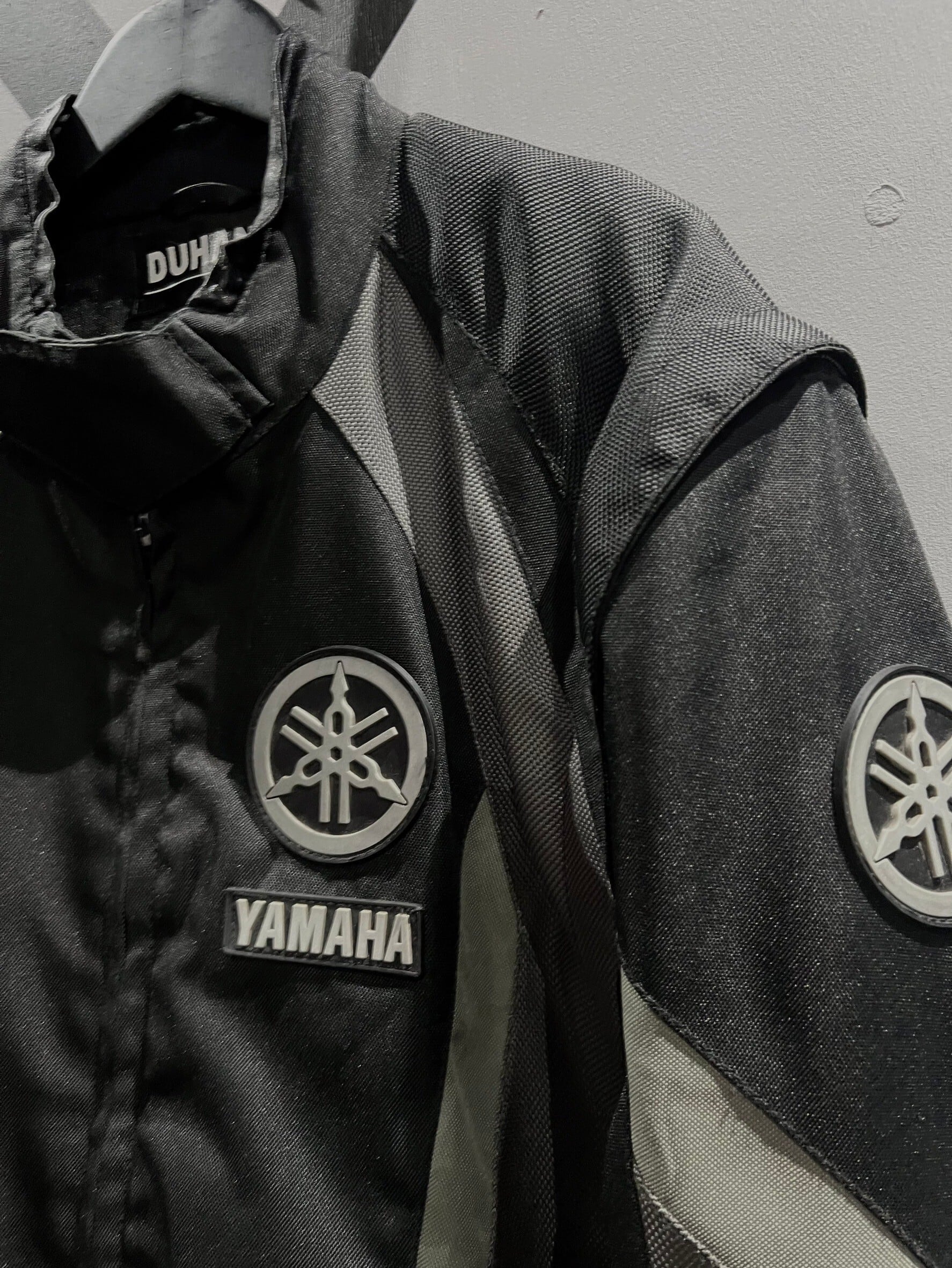 ブラックのナイロンボディをベースに、白とグレーのナイロンをテクニカルに切り替え、フロント、アーム、バックにはYAMAHAのロゴを刺繍やラバーパッチによって施した1着。