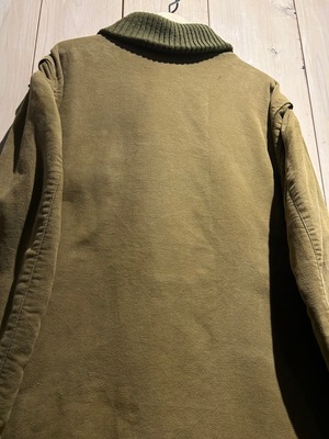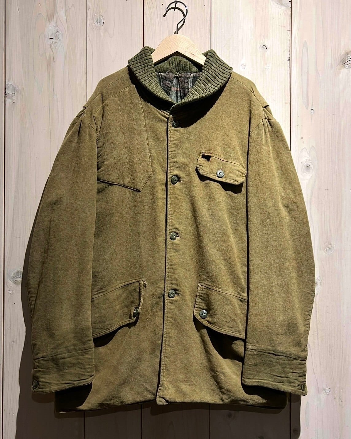 厚手でタフなモールスキンをベースとしたオリーブグリーンのボディに、首元をコーデュロイのショールカラーに切り替えたイタリア製のハンティングジャケット。