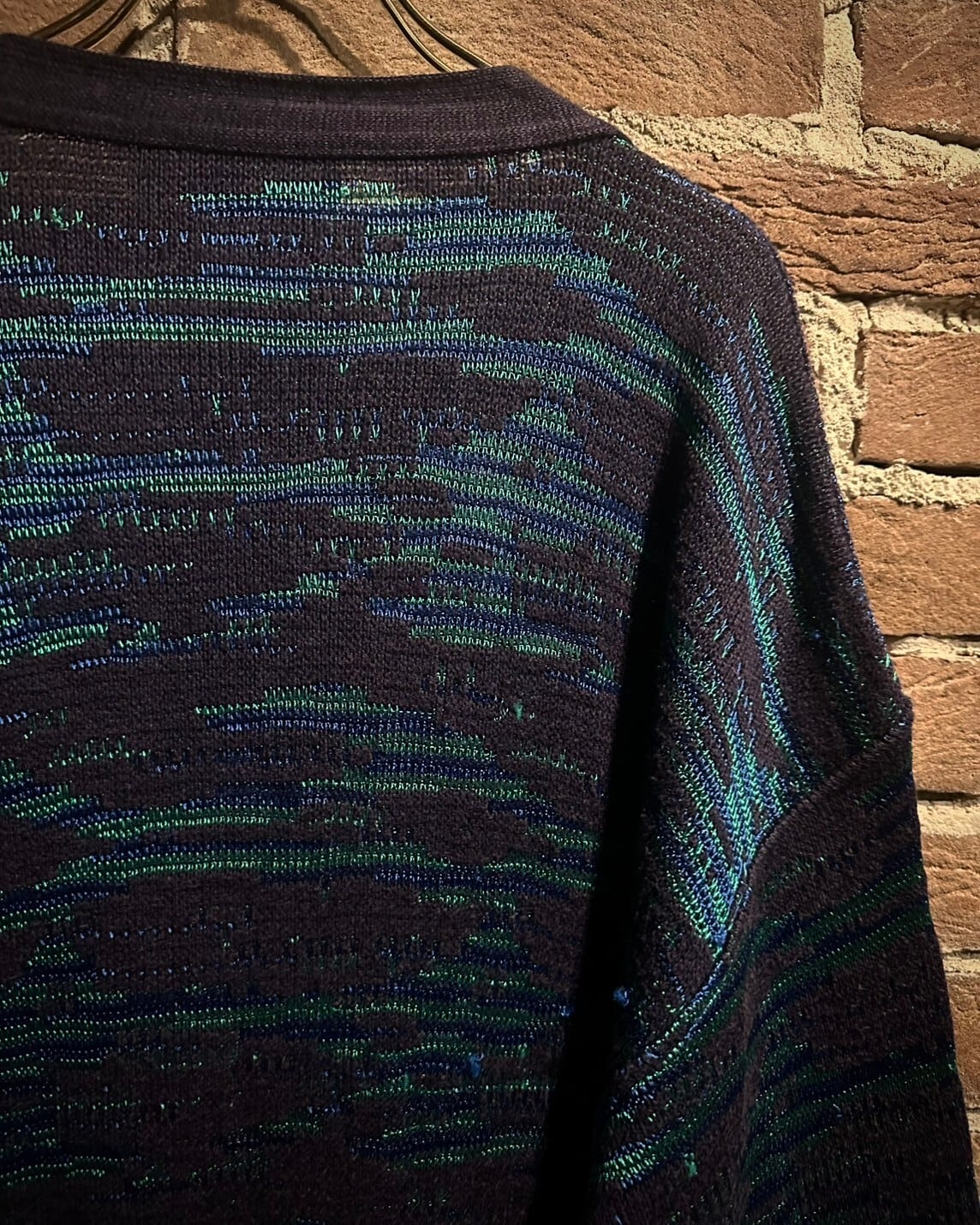 ブラックベースのボディに、光沢のある緑と青の糸で抽象的な柄模様を織り込んだユーロヴィンテージ、イタリーメイドのニットカーディガン。