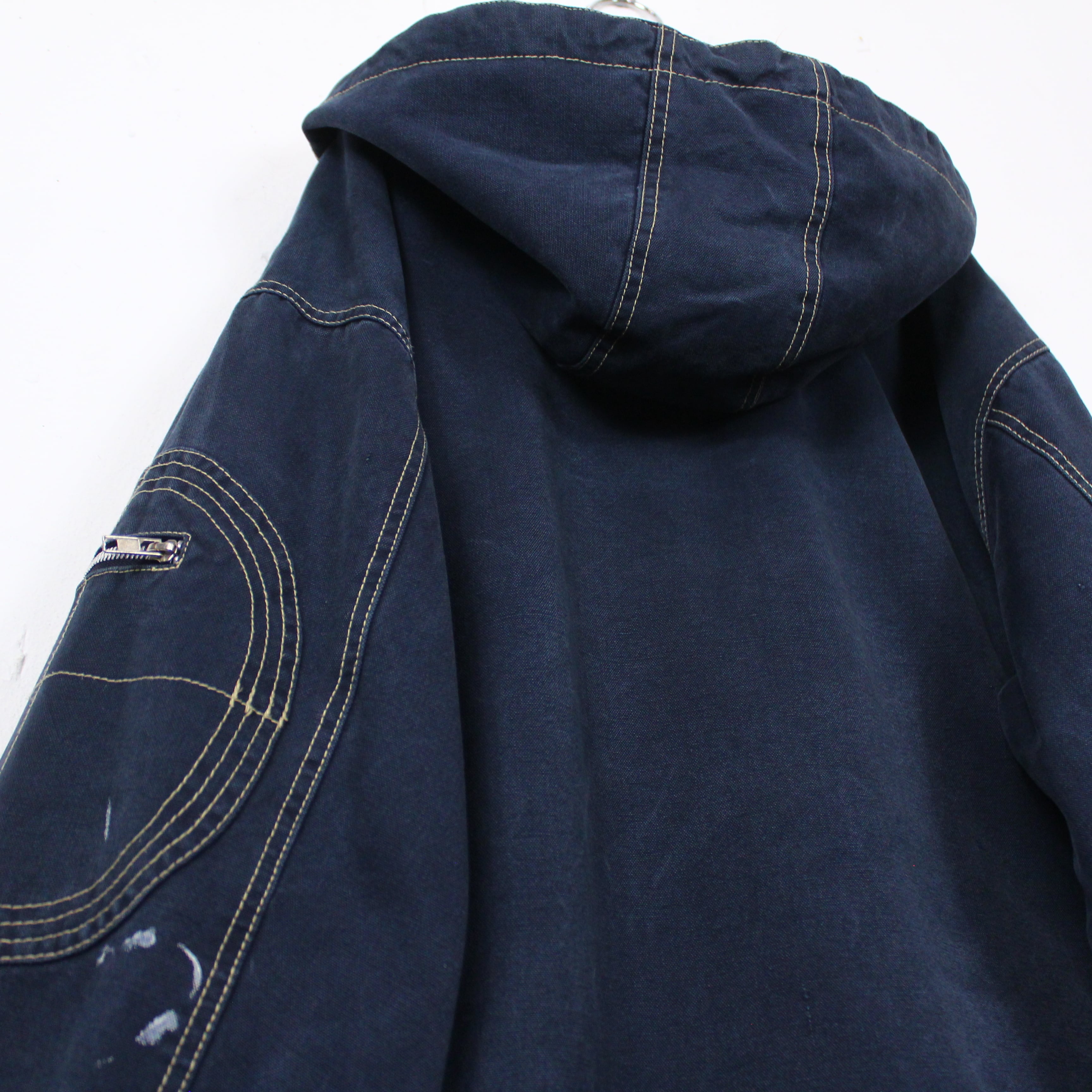 首元はハーフジップ、ハの字型のスラッシュポケット。アームにもジップポケットを施し、裾にはドローコードと機能性を高めるギミックの数々。全体的に走らされたステッチが立体感を演出しつつ、デザインのアクセントになっています。