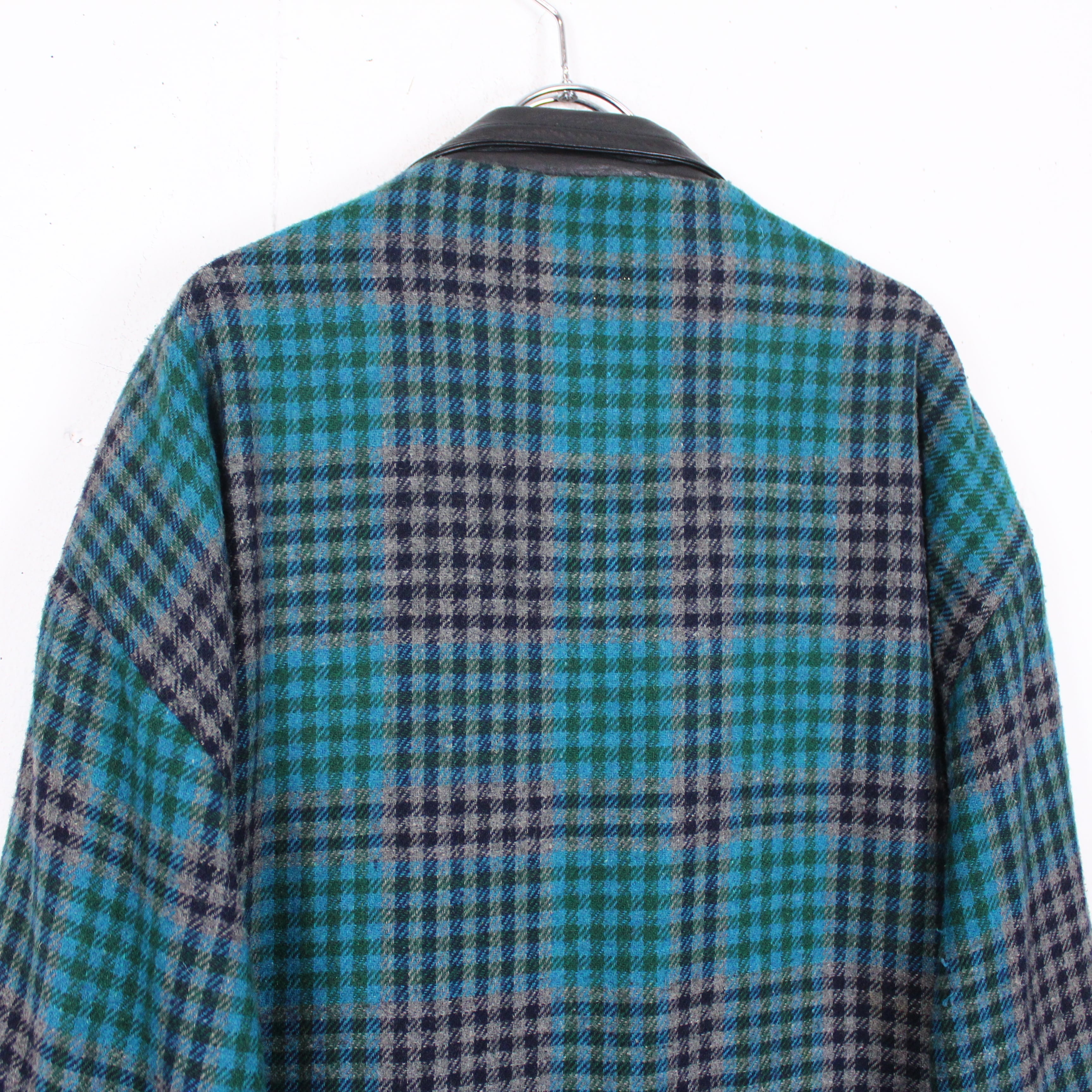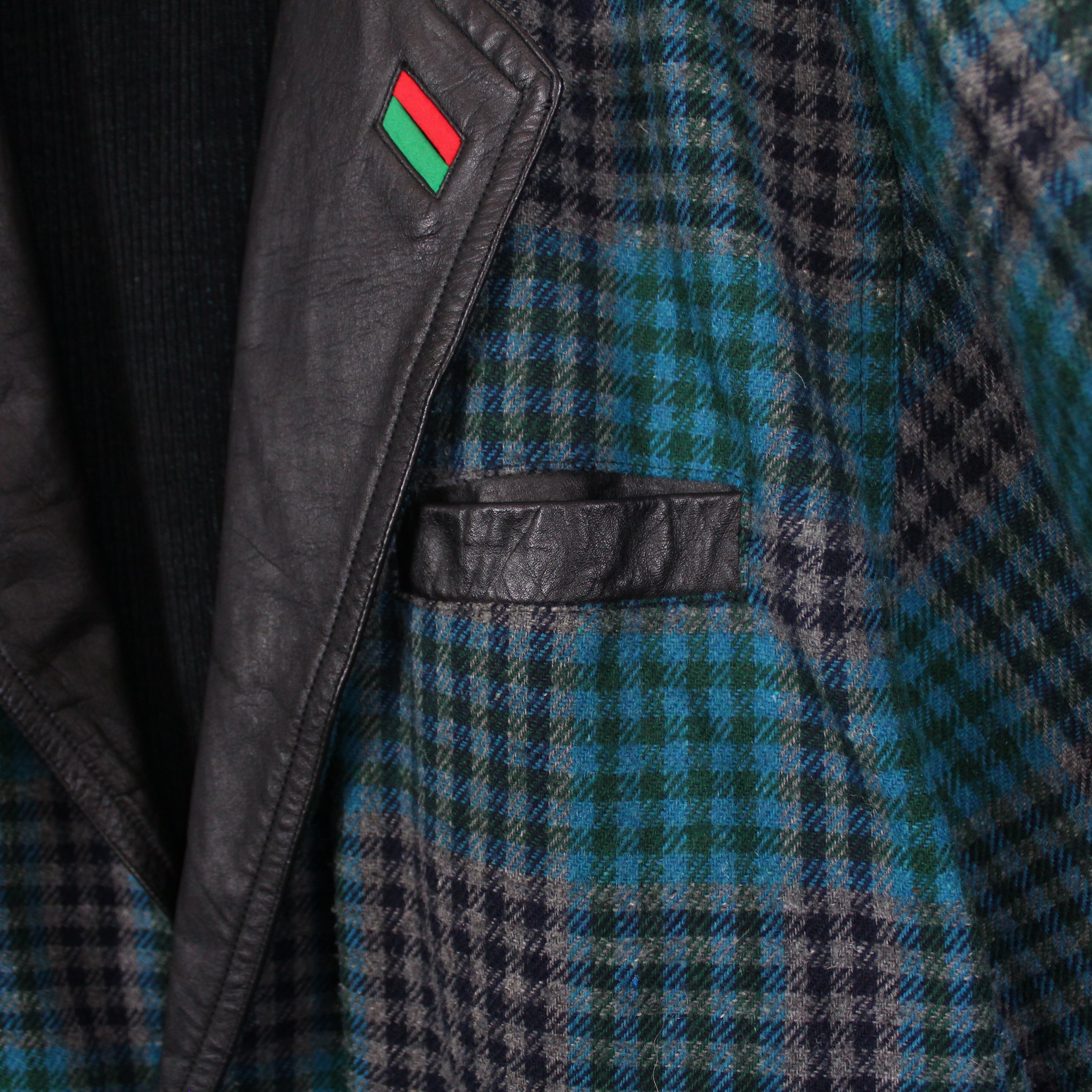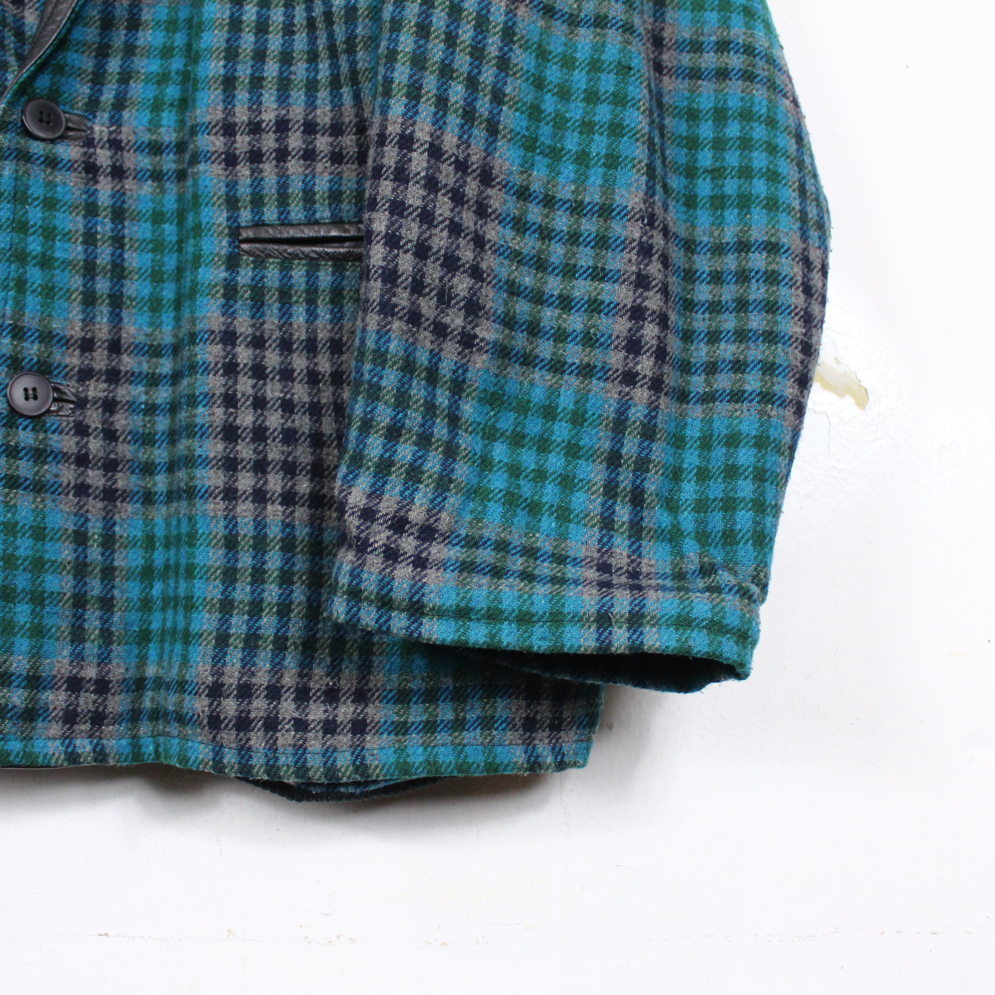 ターコイズブルーとグレーカラーの糸を用いてツイード生地に仕上げ、レザー調の生地をラペルとポケットなどに配ったヴィンテージらしいレトロさとモードな雰囲気を纏ったスペシャルな逸品。