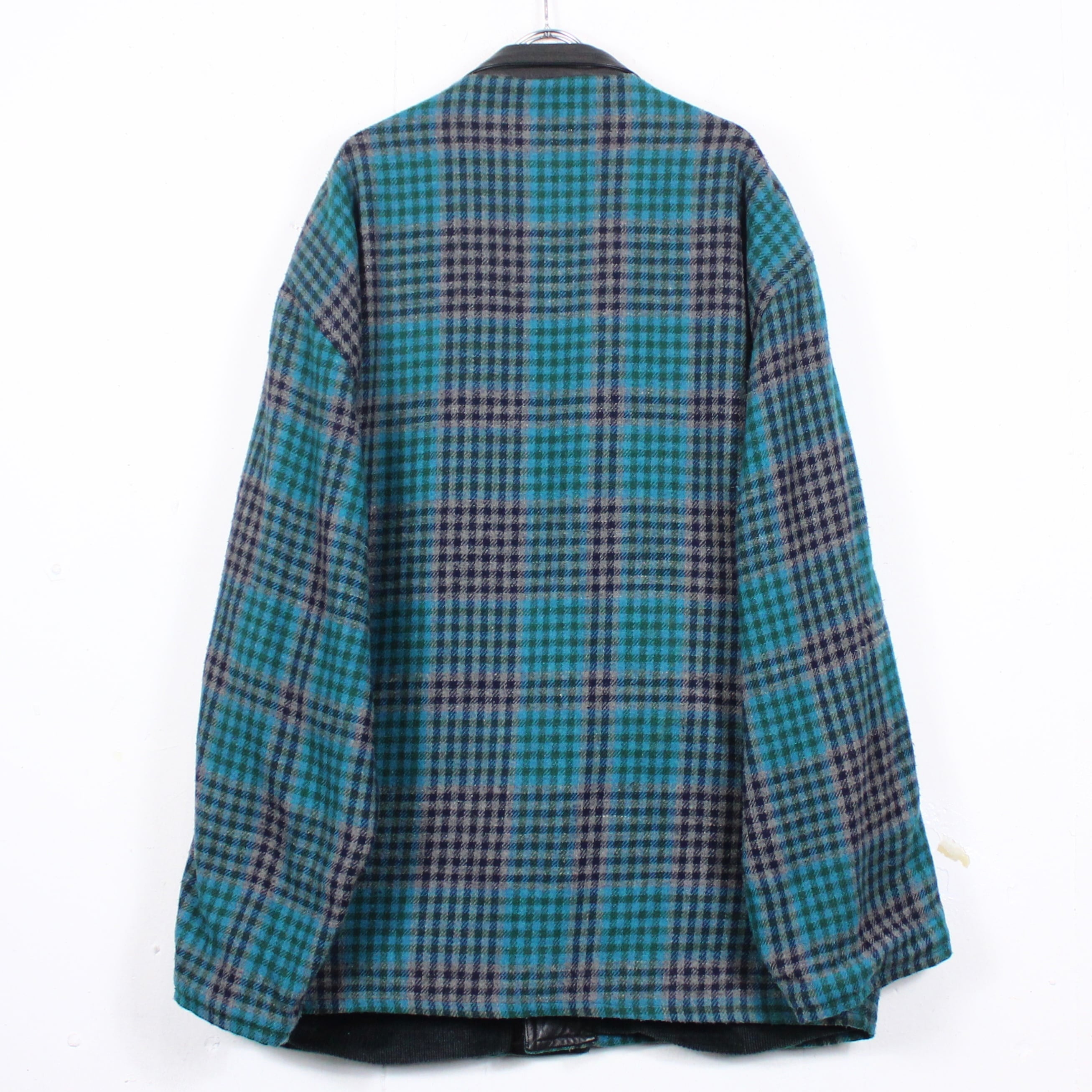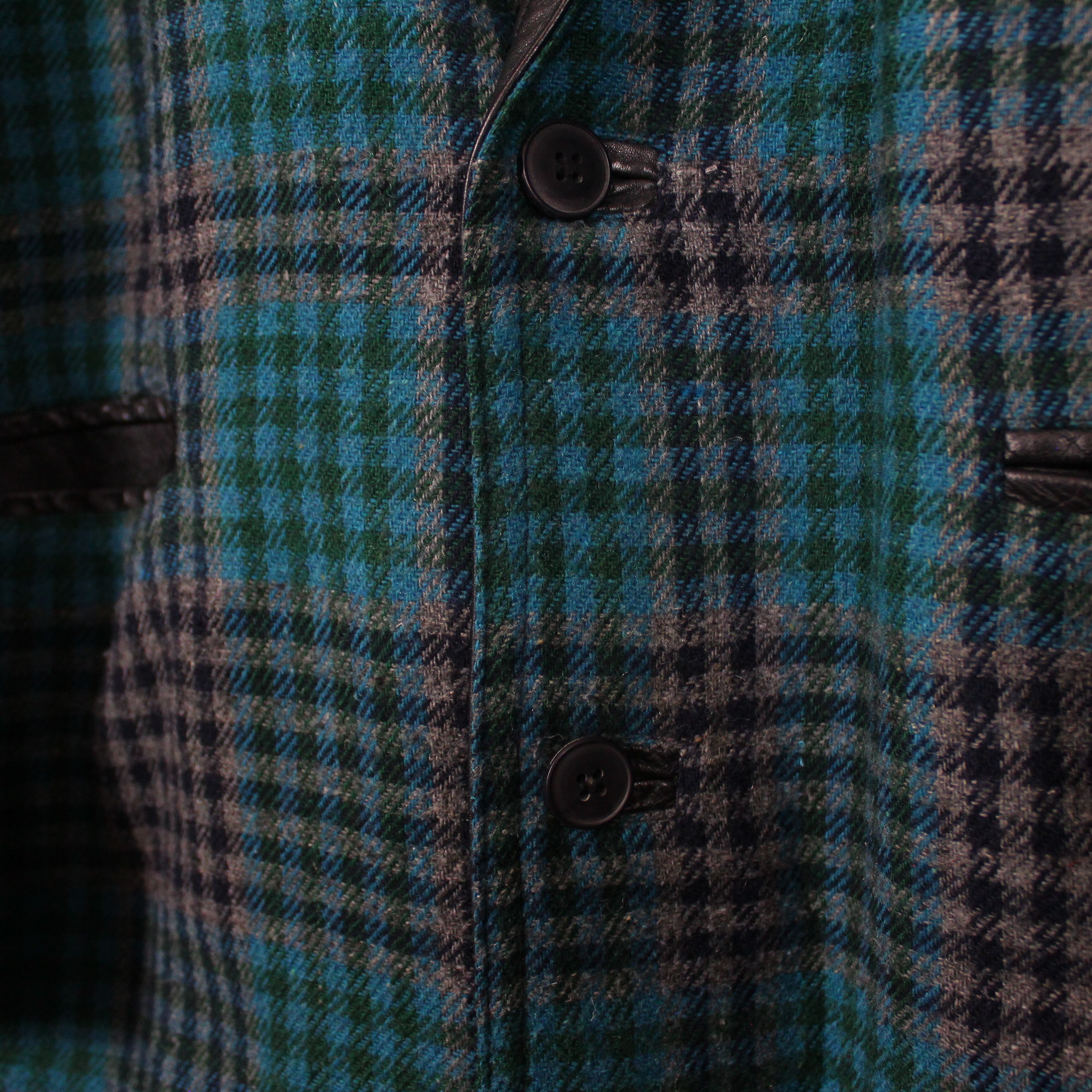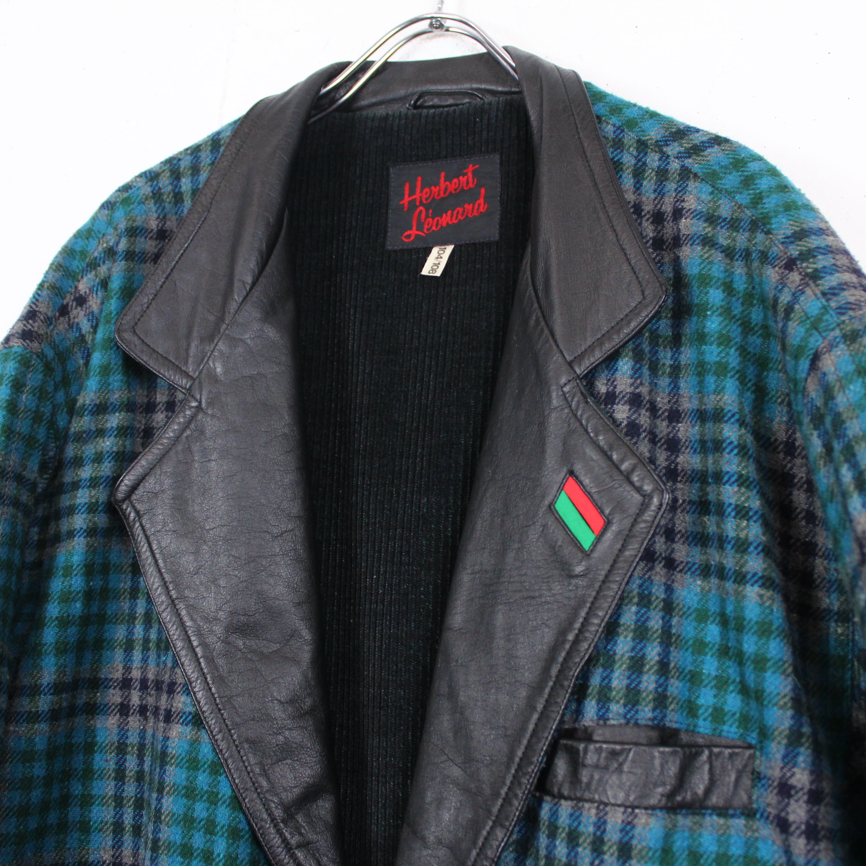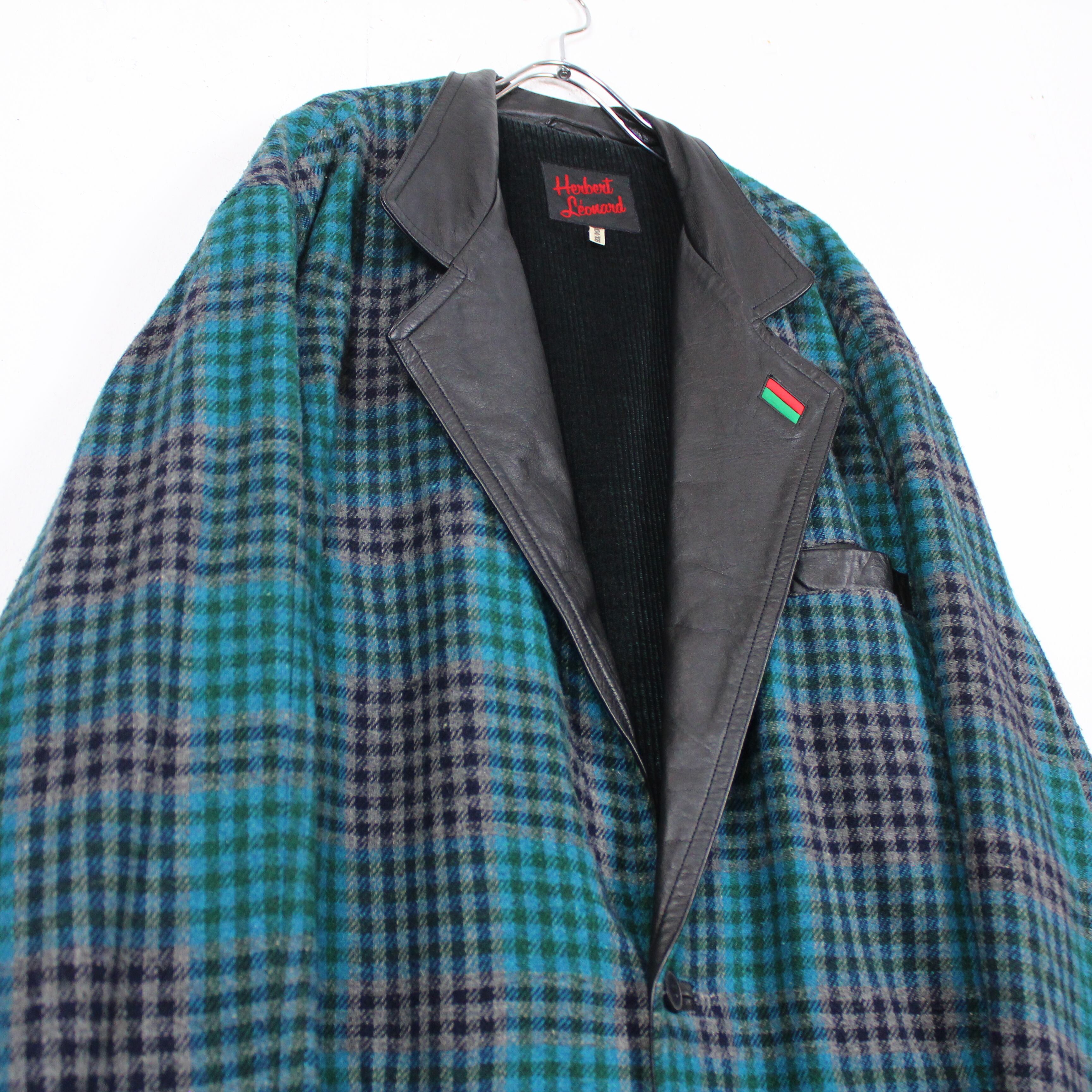 ターコイズブルーとグレーカラーの糸を用いてツイード生地に仕上げ、レザー調の生地をラペルとポケットなどに配ったヴィンテージらしいレトロさとモードな雰囲気を纏ったスペシャルな逸品。