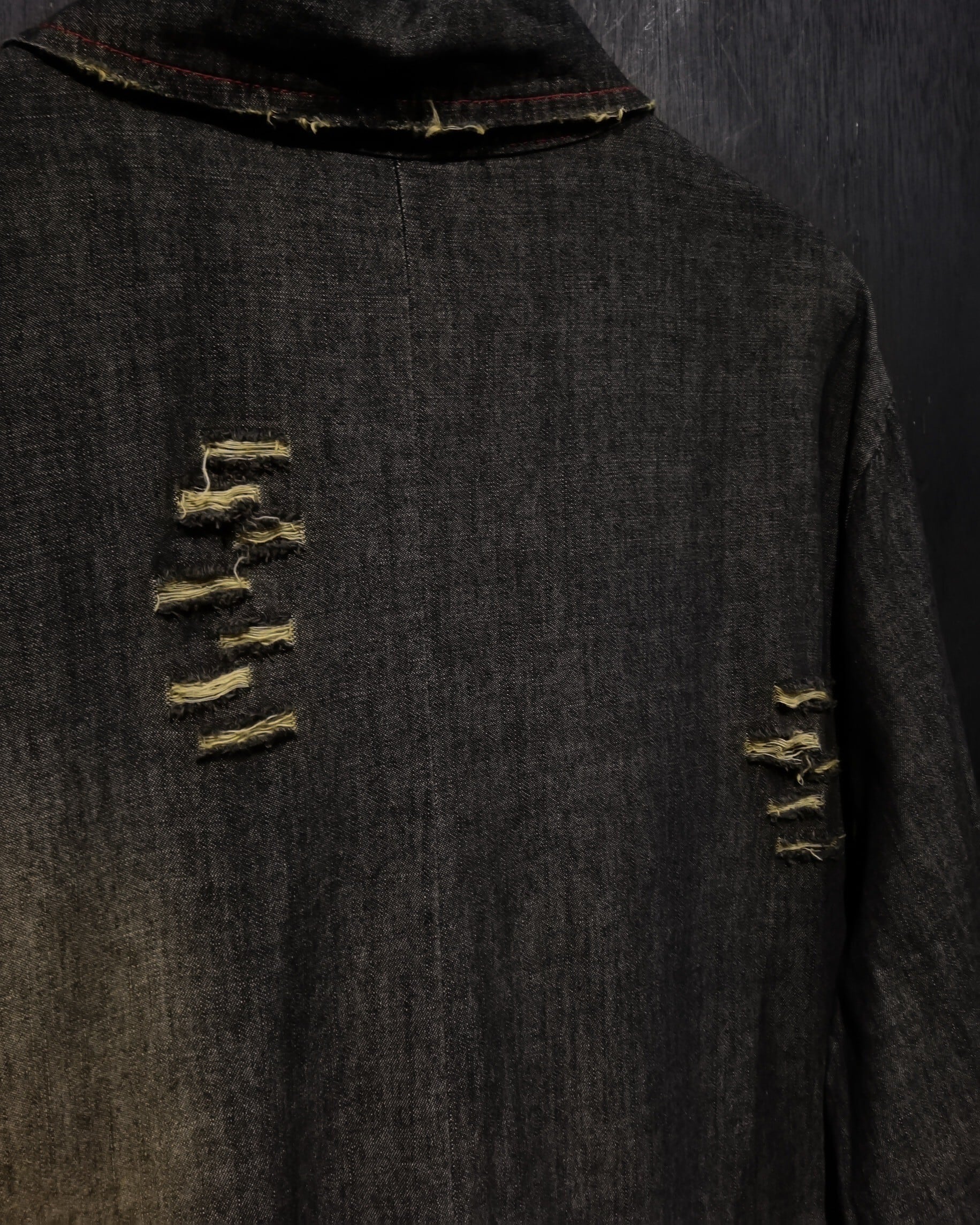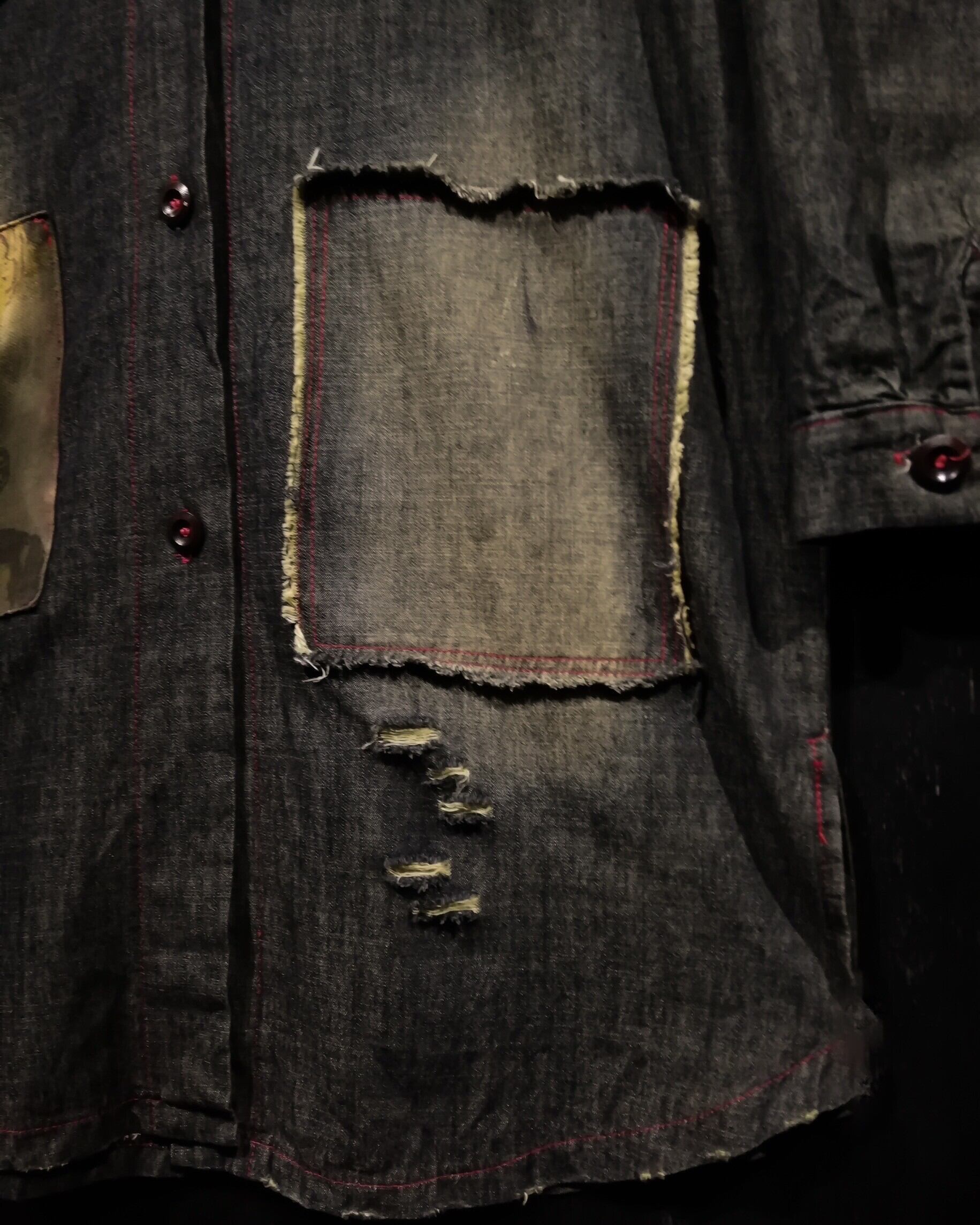 フェード感の良いライトなシャツ生地をベースに、エイジング加工、パッチを載せた、退廃感の漂う長袖ロングシャツ。
