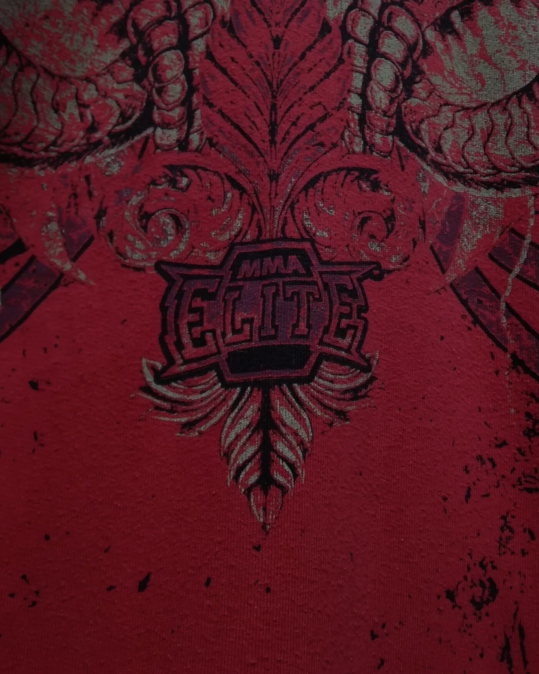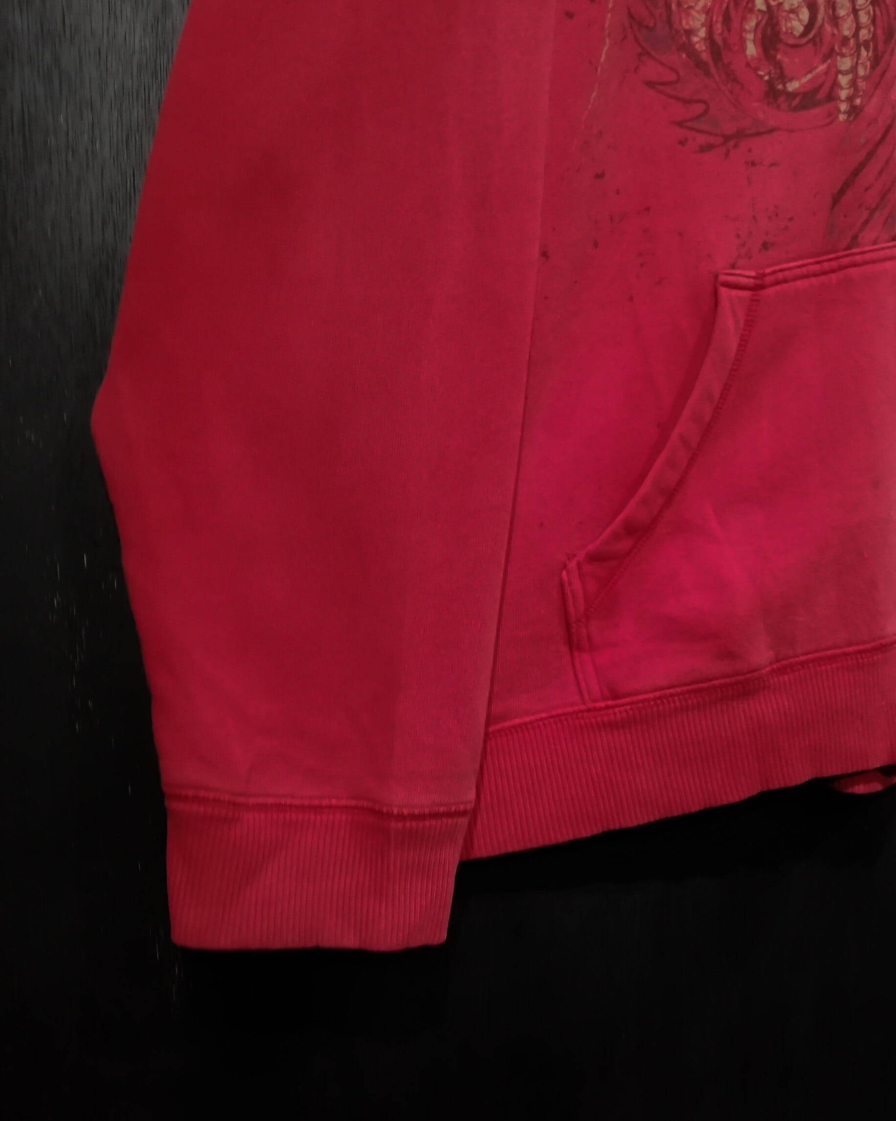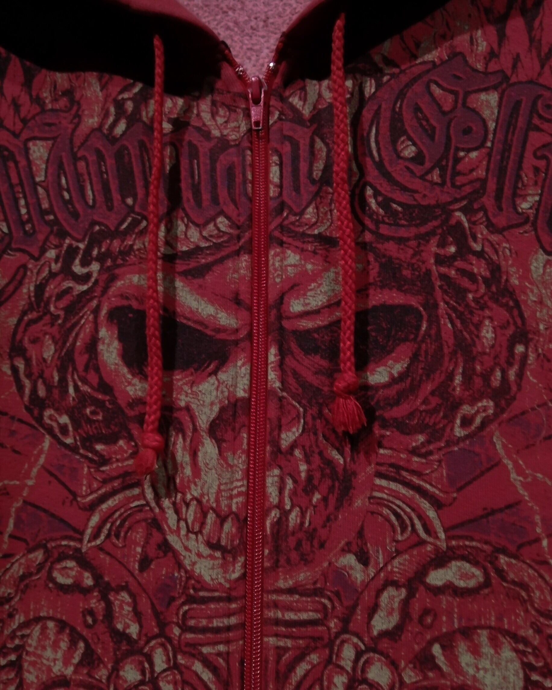 真紅のスウェット地のボディに、ダークかつゴシックな雰囲気漂うスカルを載せ、厨二心くすぐられるデザインをプリントしたジップアップフーディ。