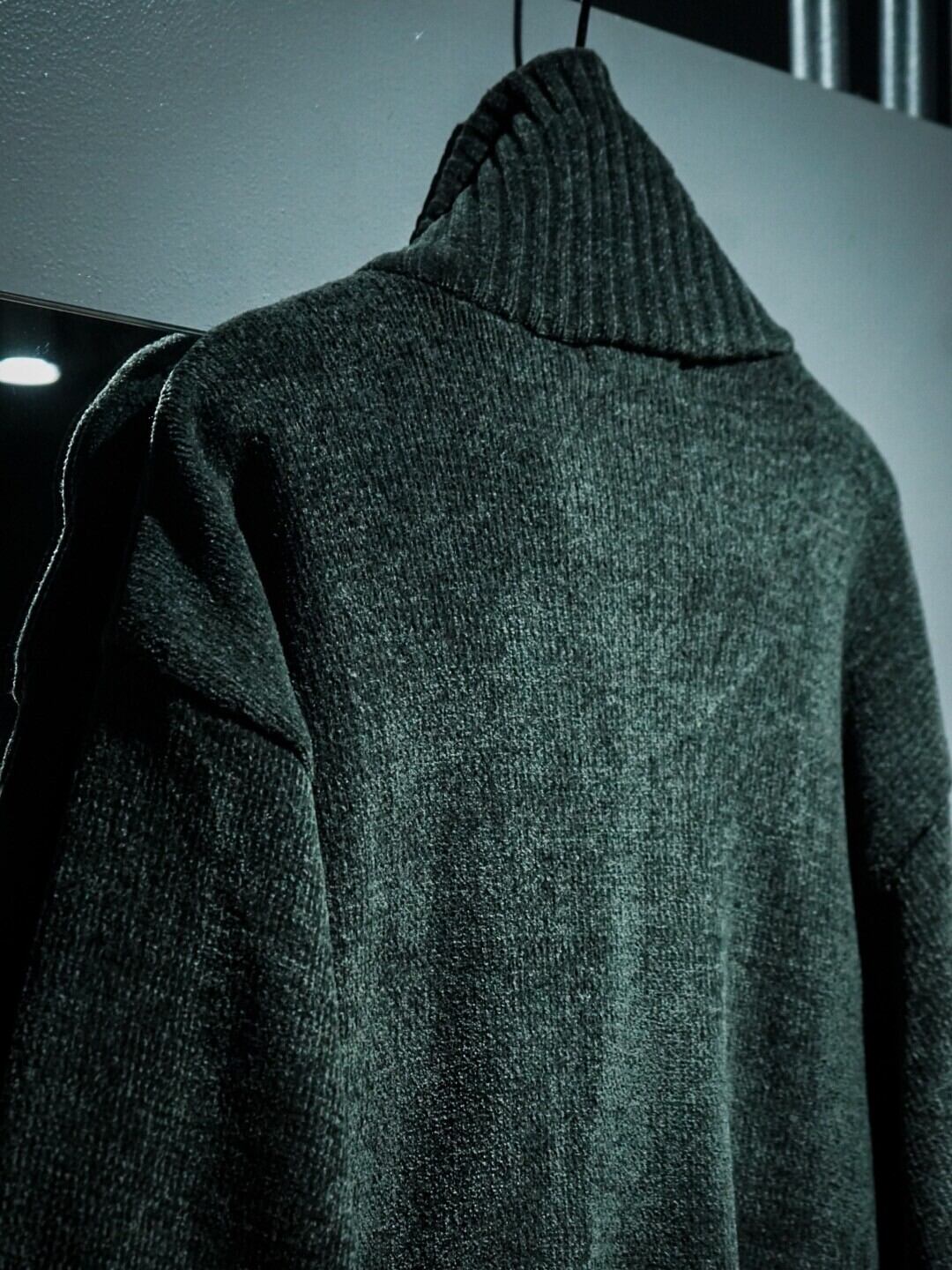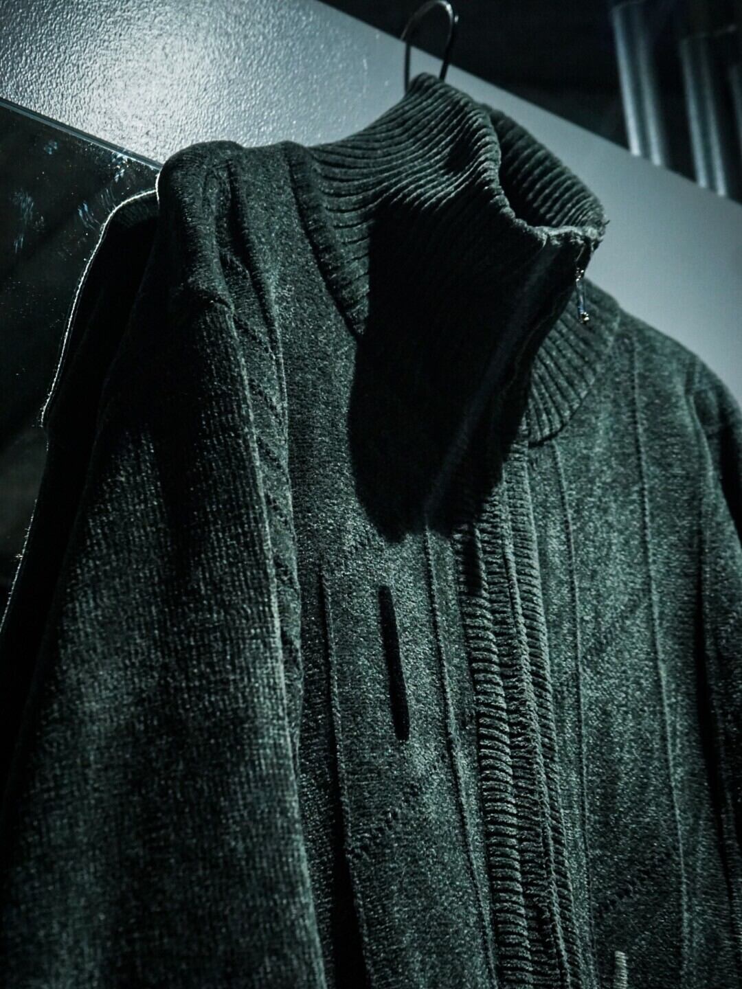 そんな中こちらはシェニール糸を用いており、ラグジュアルな表情に立体感を魅せる1着。繊細な光沢に、織り方を随所で変化させた緻密なニッティングが素晴らしい、、、
