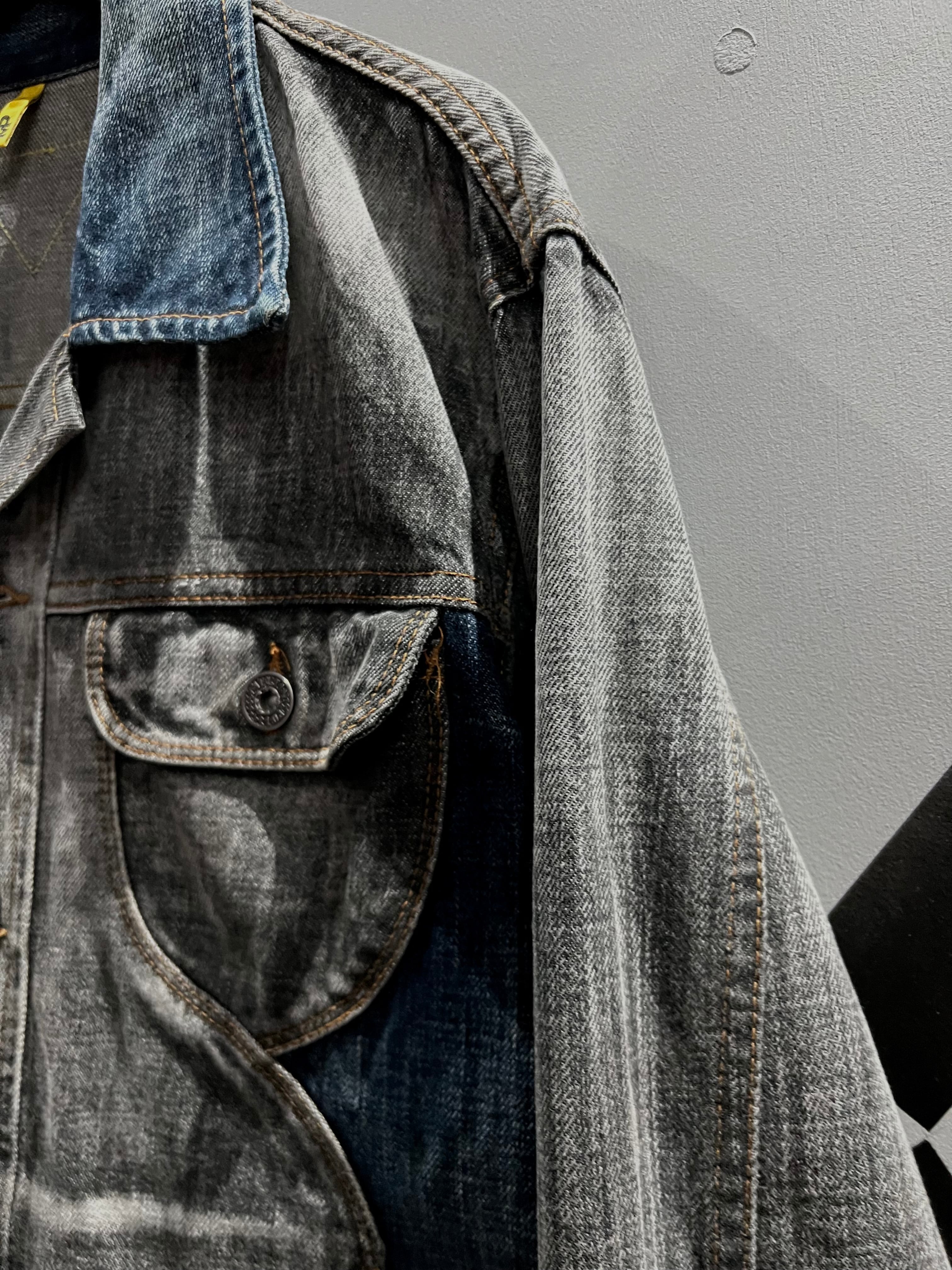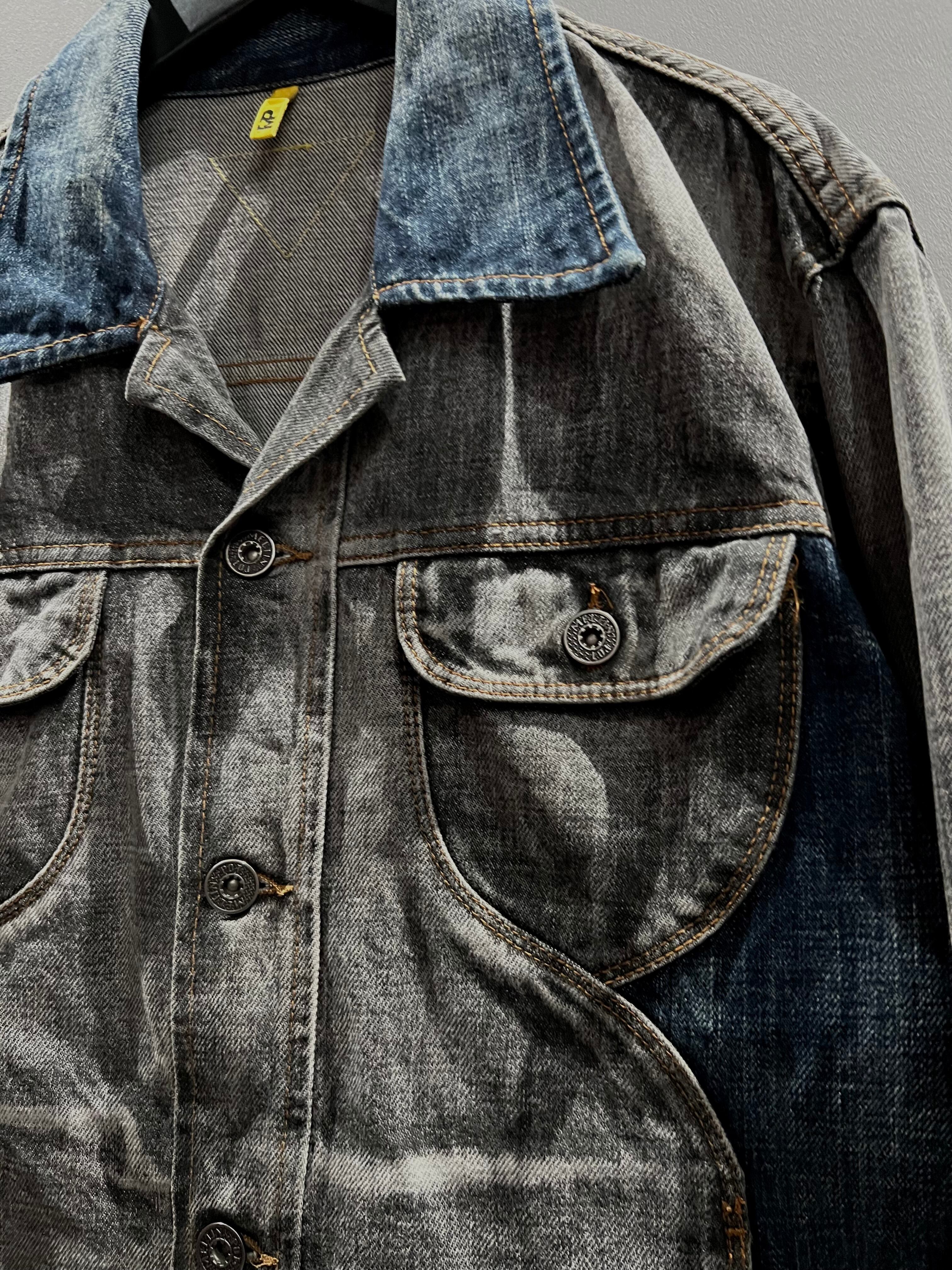 フェード加工がされたブラックデニムをベースに、インディゴブルーを切り替えたデニムジャケット。