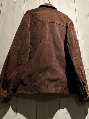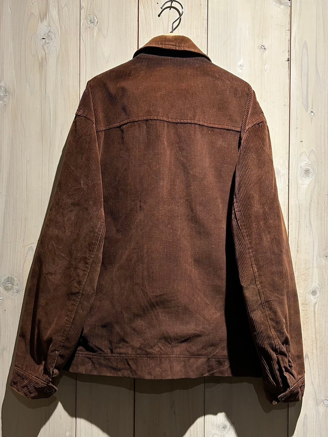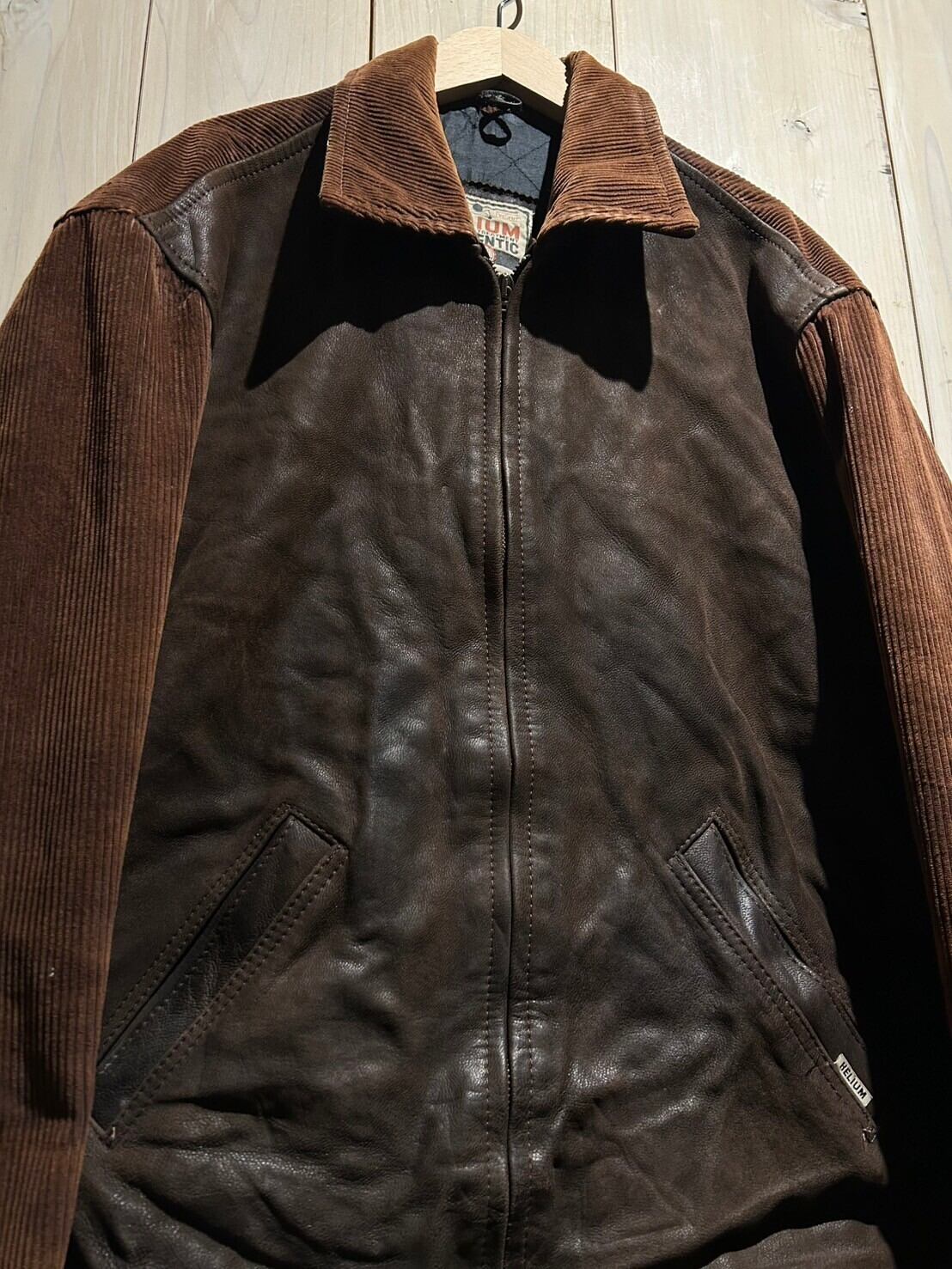 太畝のブラウンのコーデュロイを用いたボディに、前身頃にしっとりと柔らかなレザーを切り替えたジップアップジャケット。
