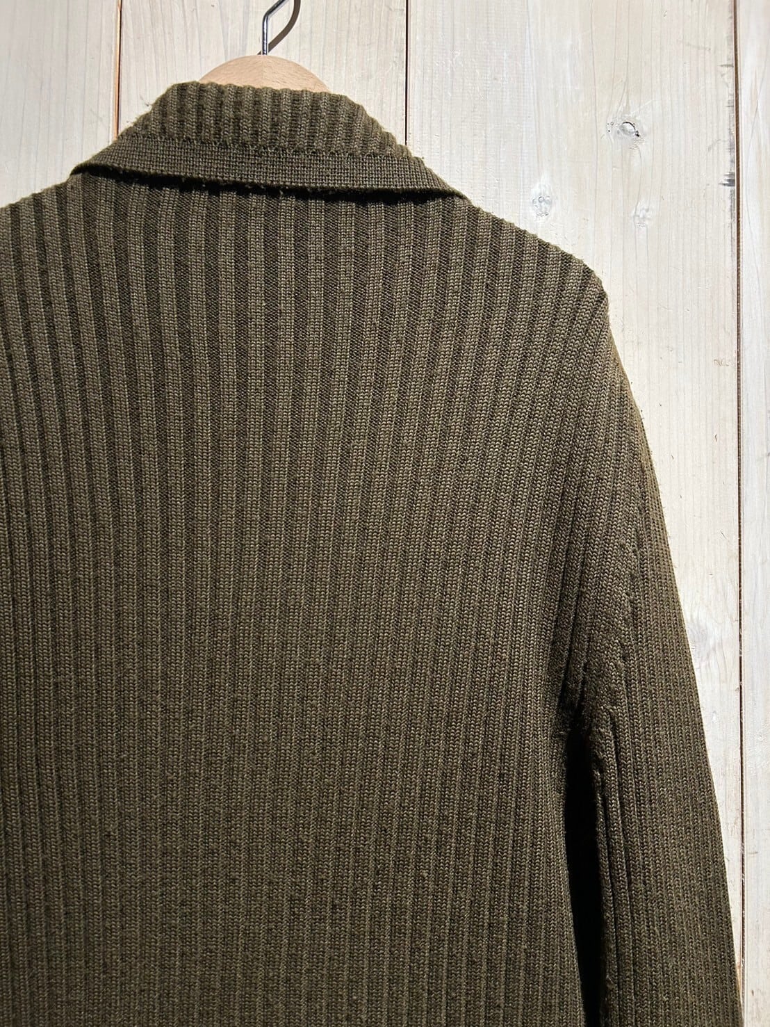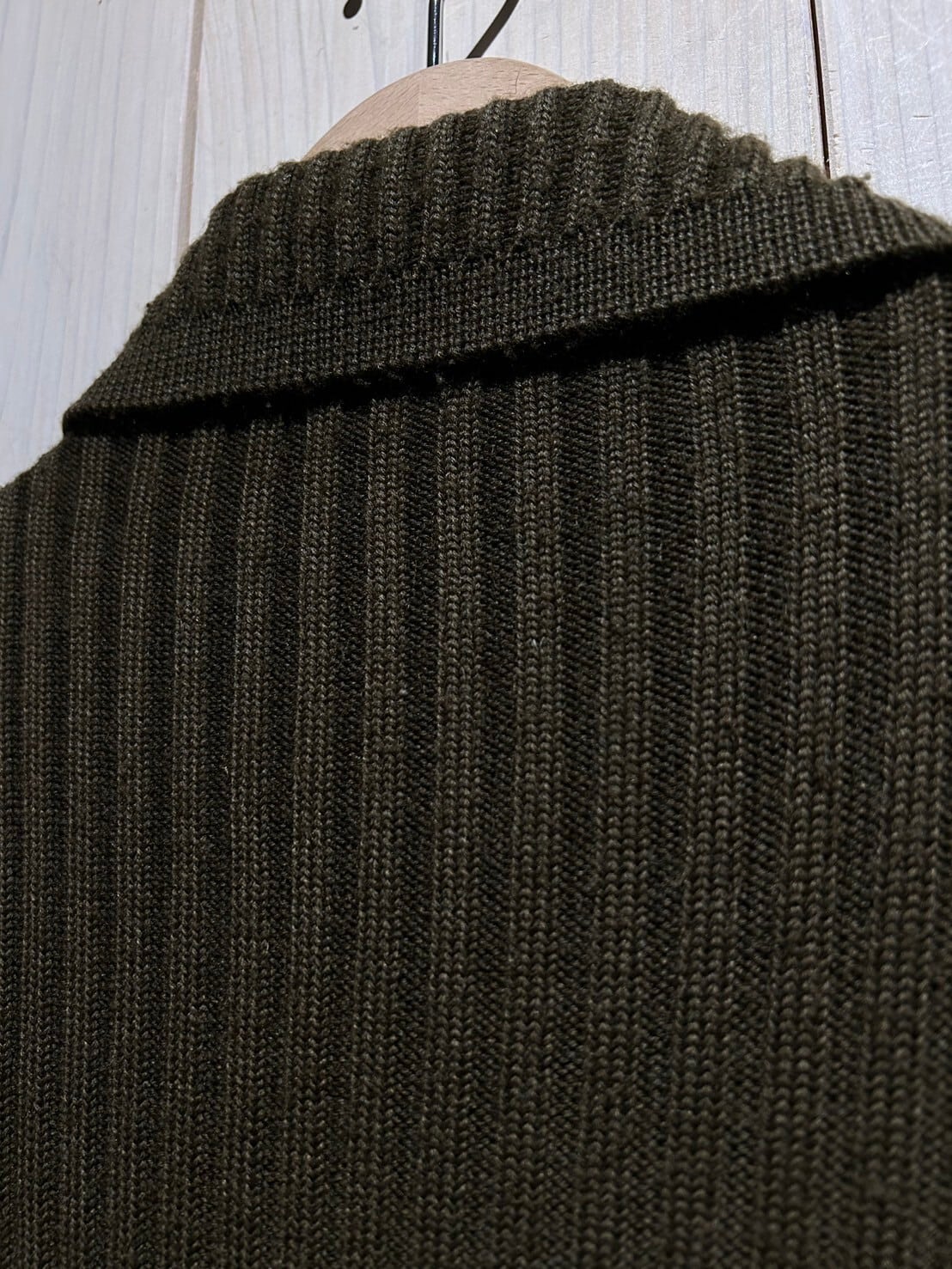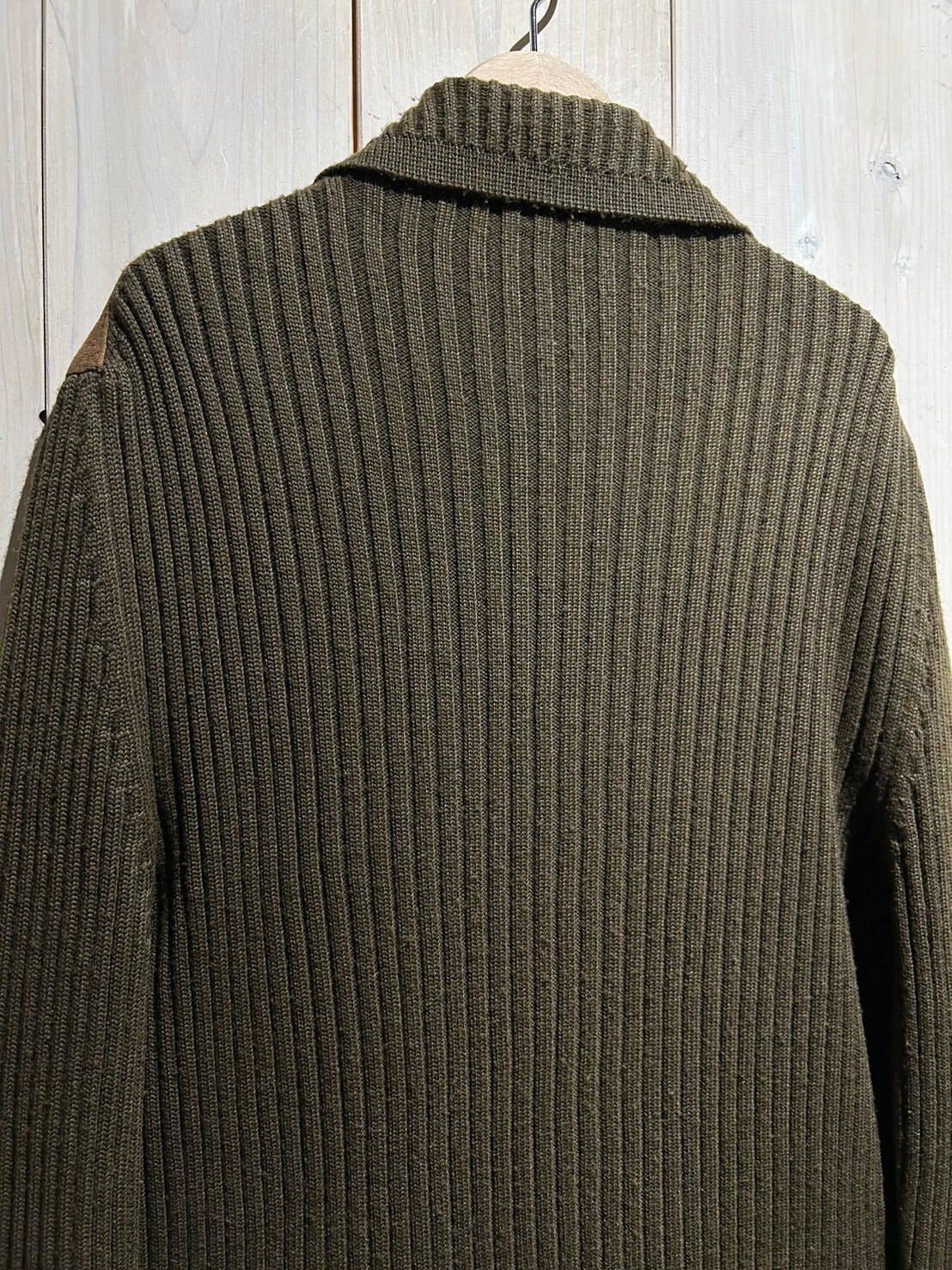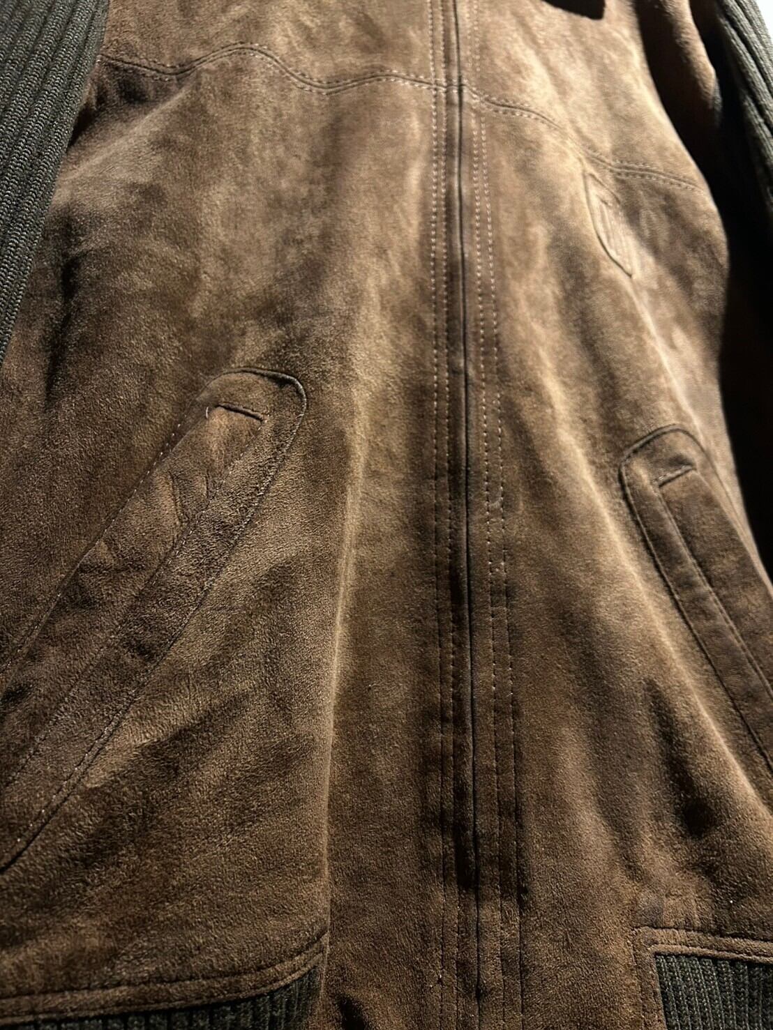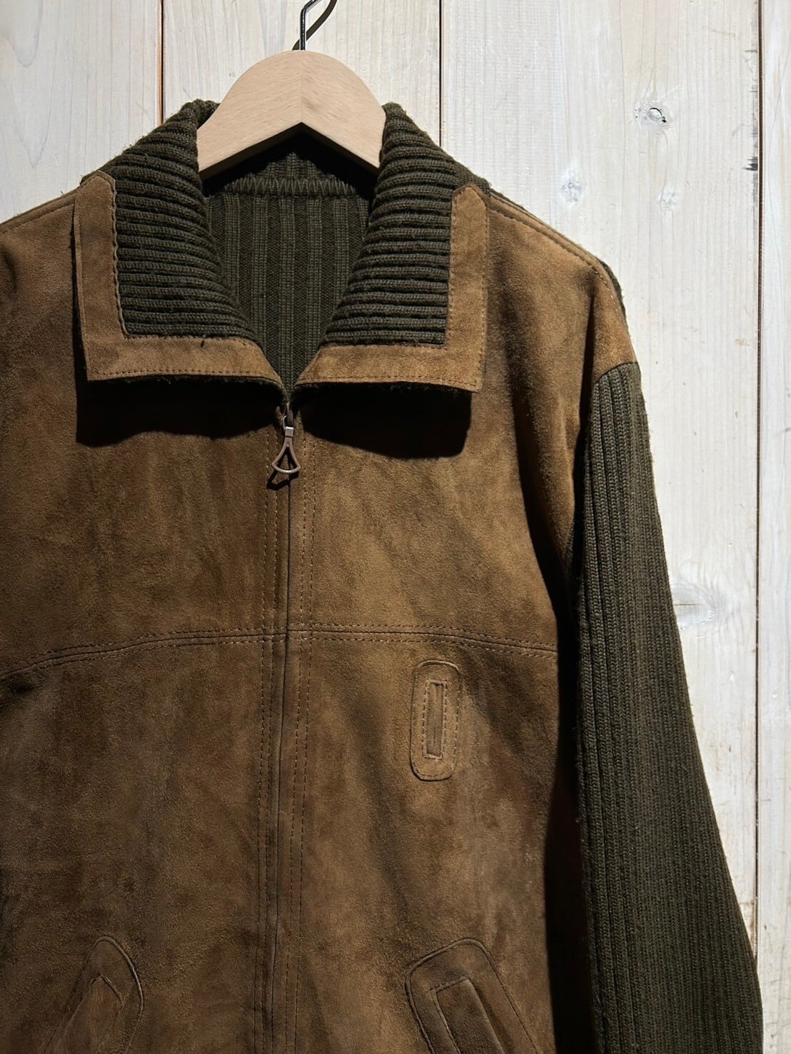 ブラウンのニットボディをベースに、フロント、前背面のヨークをハリのある上質なスエードレザーで切り替えた、ジップアップタイプのニットジャケット。