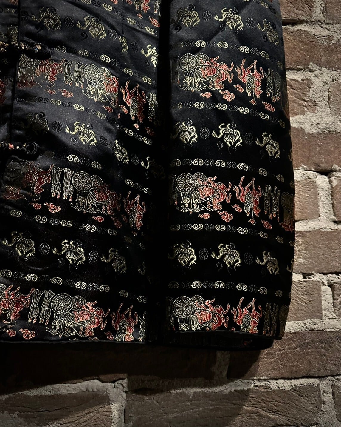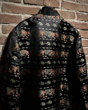 煌々と光沢を放つ、ツルッとした上質な素材を用いたブラックカラーのボディに、マルチカラーの配色で馬車のデザインを繊細な糸の織りによって刻み込んだチャイナジャケット。