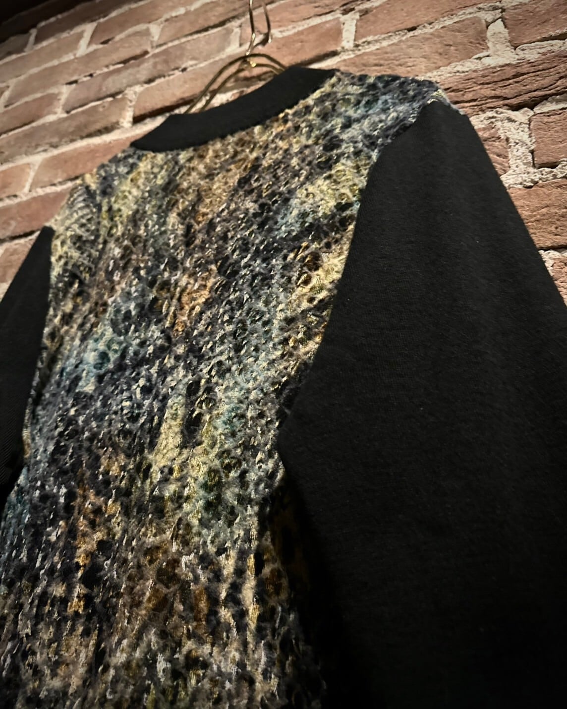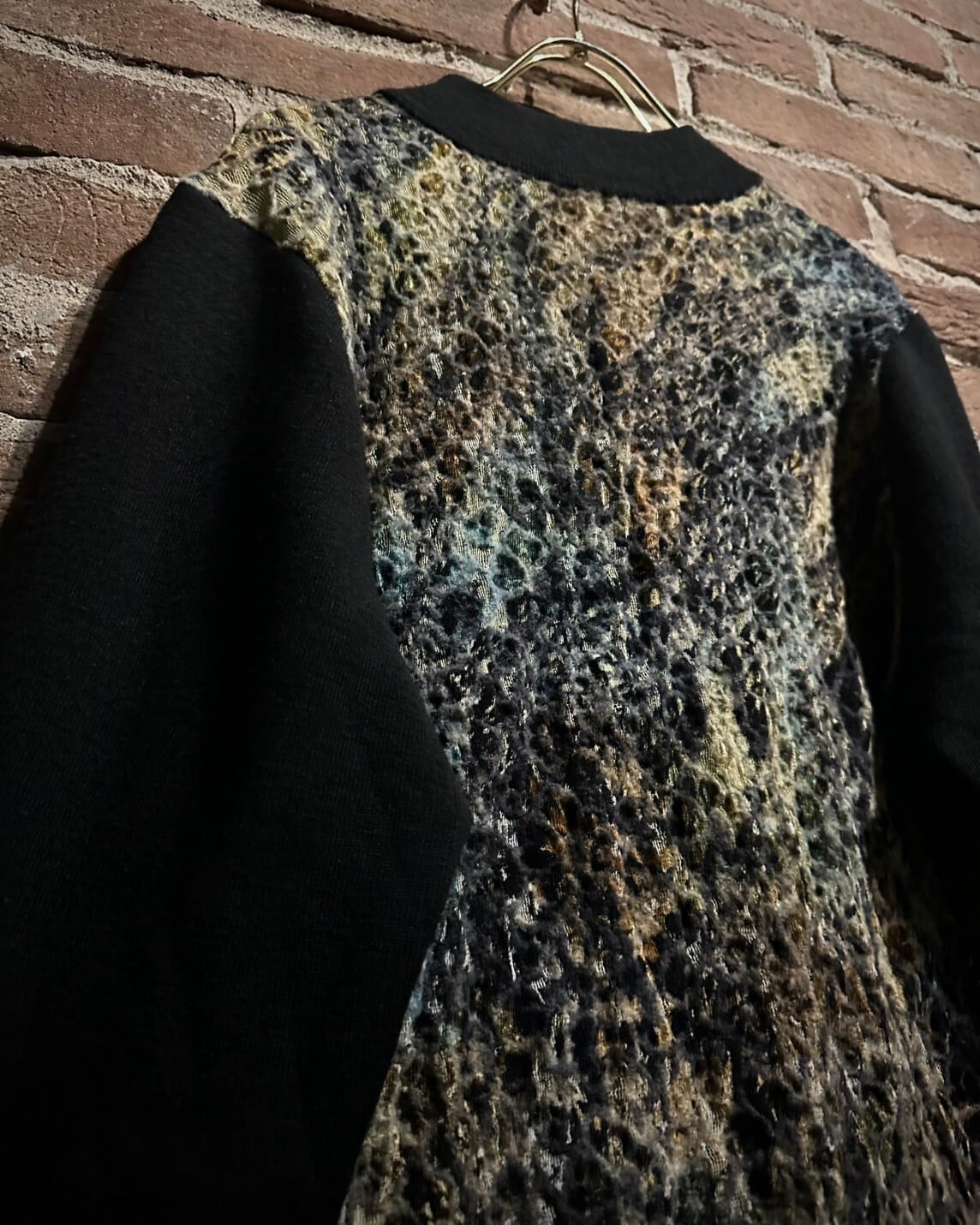 ブラックのボディをベースに、グラデーションがかったカラーリングの織りの生地と、レース生地の切り替えを施したドライバーズ型のニットジャケット。