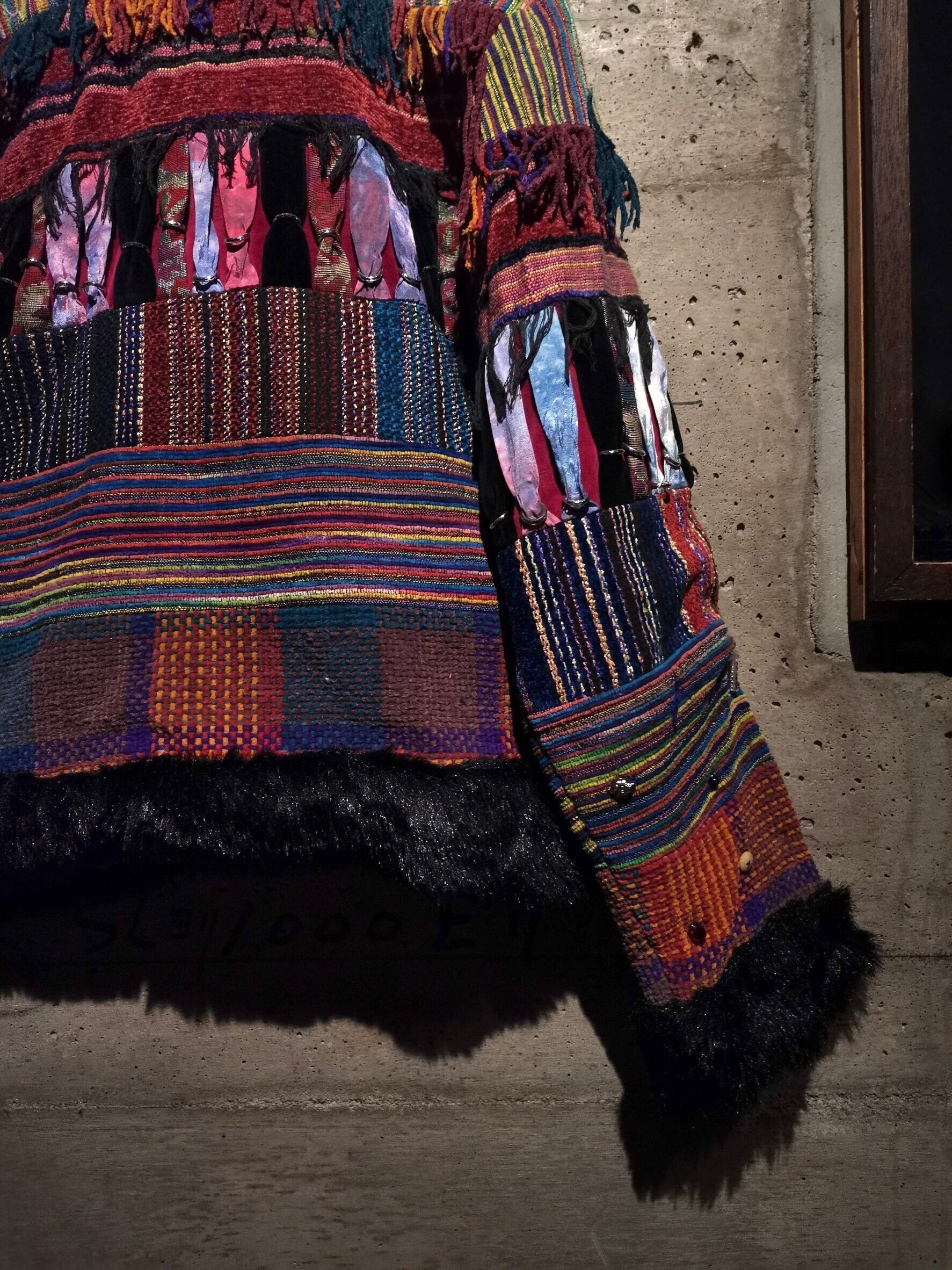 ベロアやファー、コットン地の編み込み等、多種多様な生地をパッチワーク状に切り替え、その上からビジューやリング、短冊状の装飾を施した、唯一無二のデザイン性を誇るジャケット。