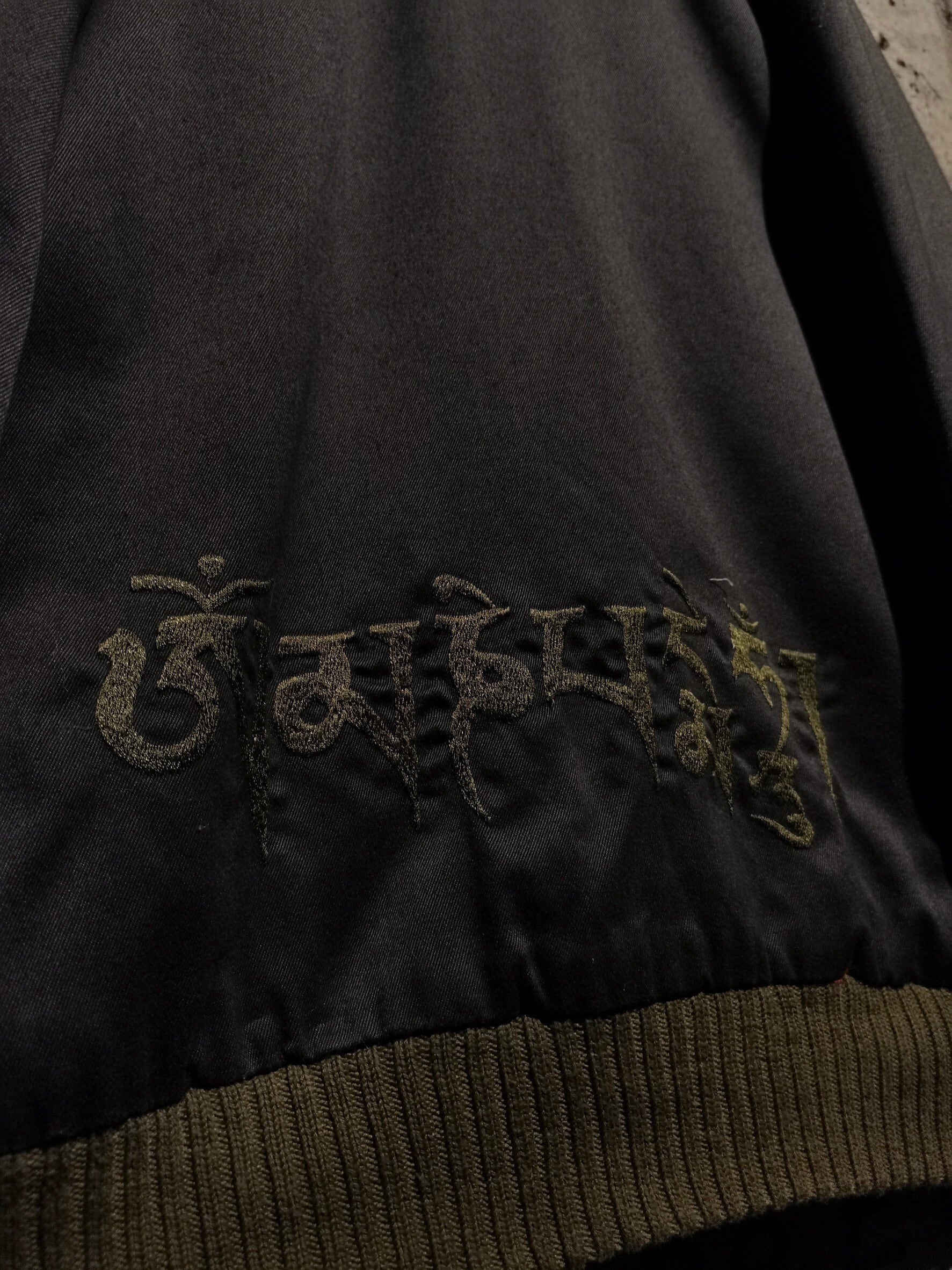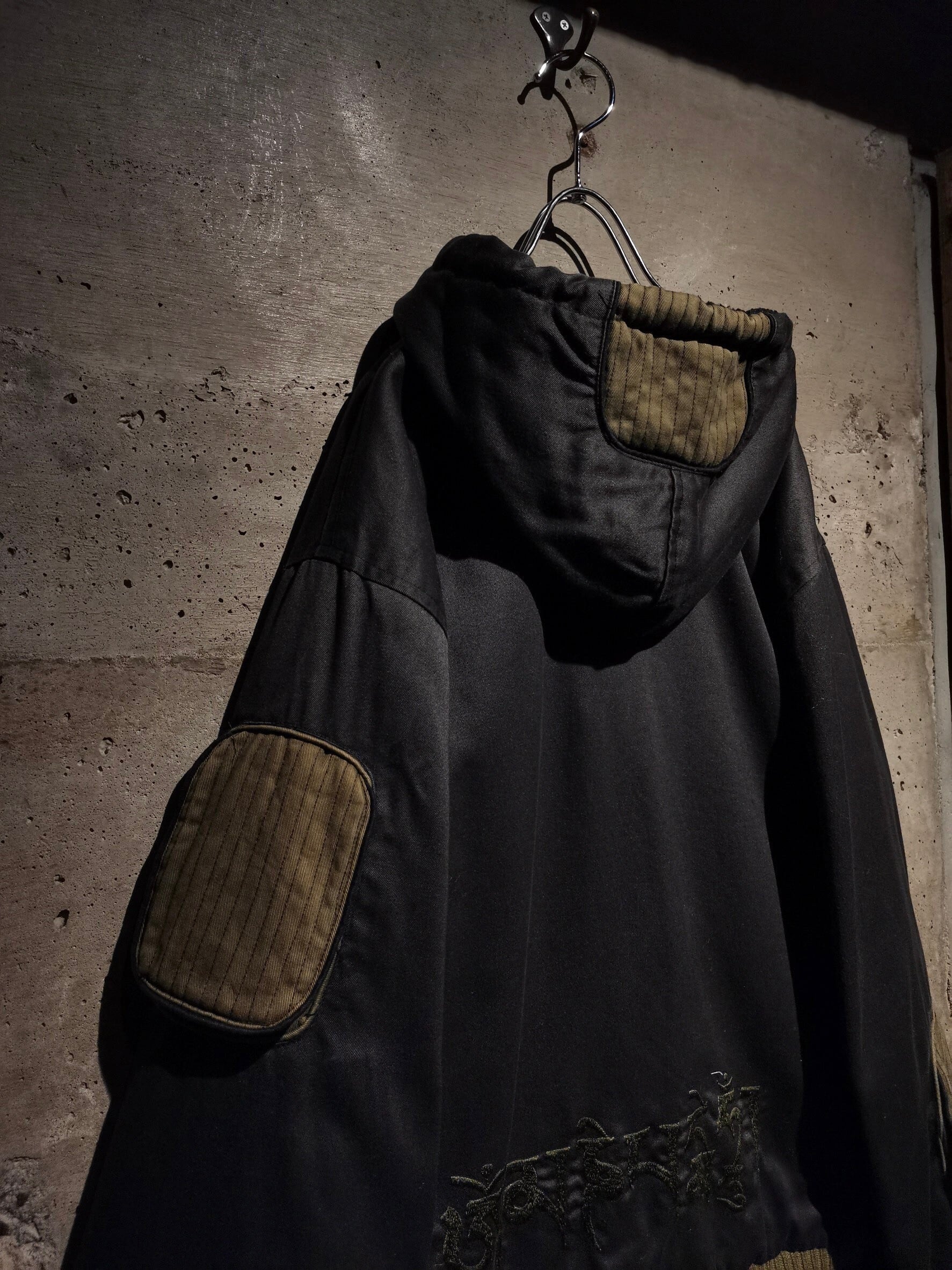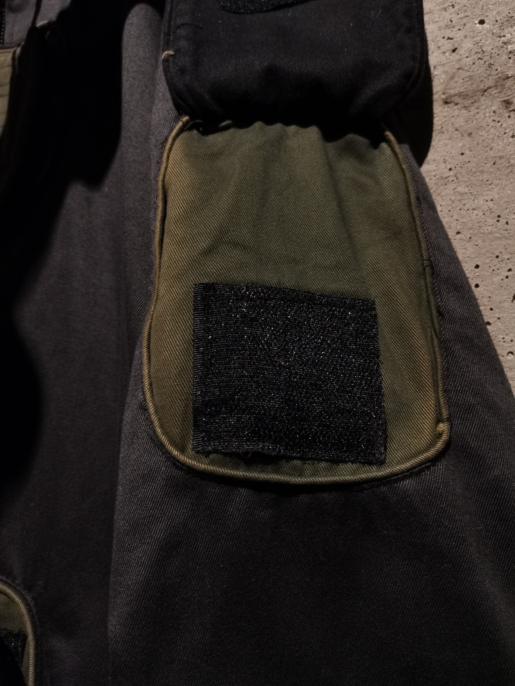 フロントやアームの随所にベルクロのギミック、アシンメトリーなフロントジップ、背面の刺繍デザイン等を施したジャケット。