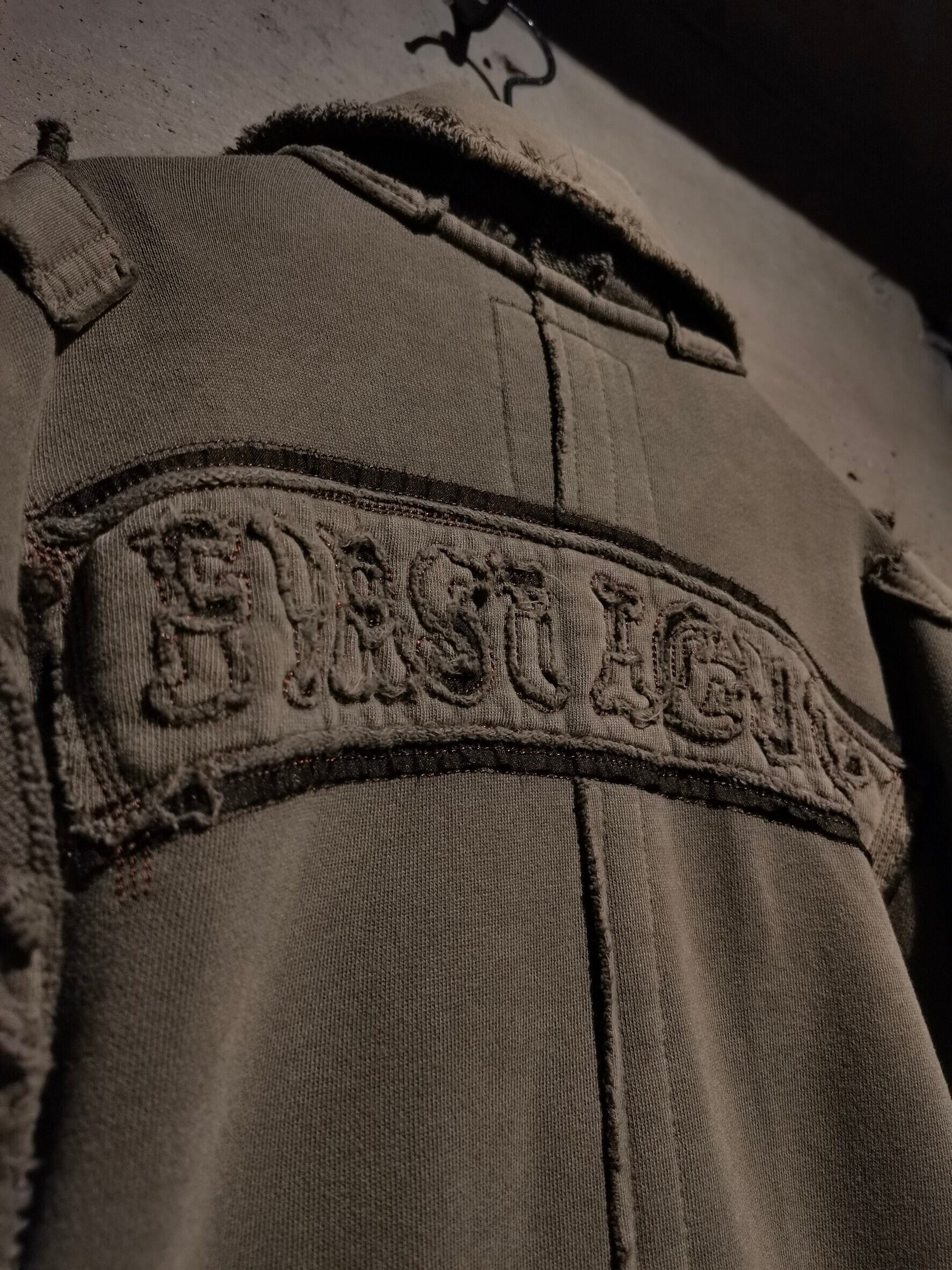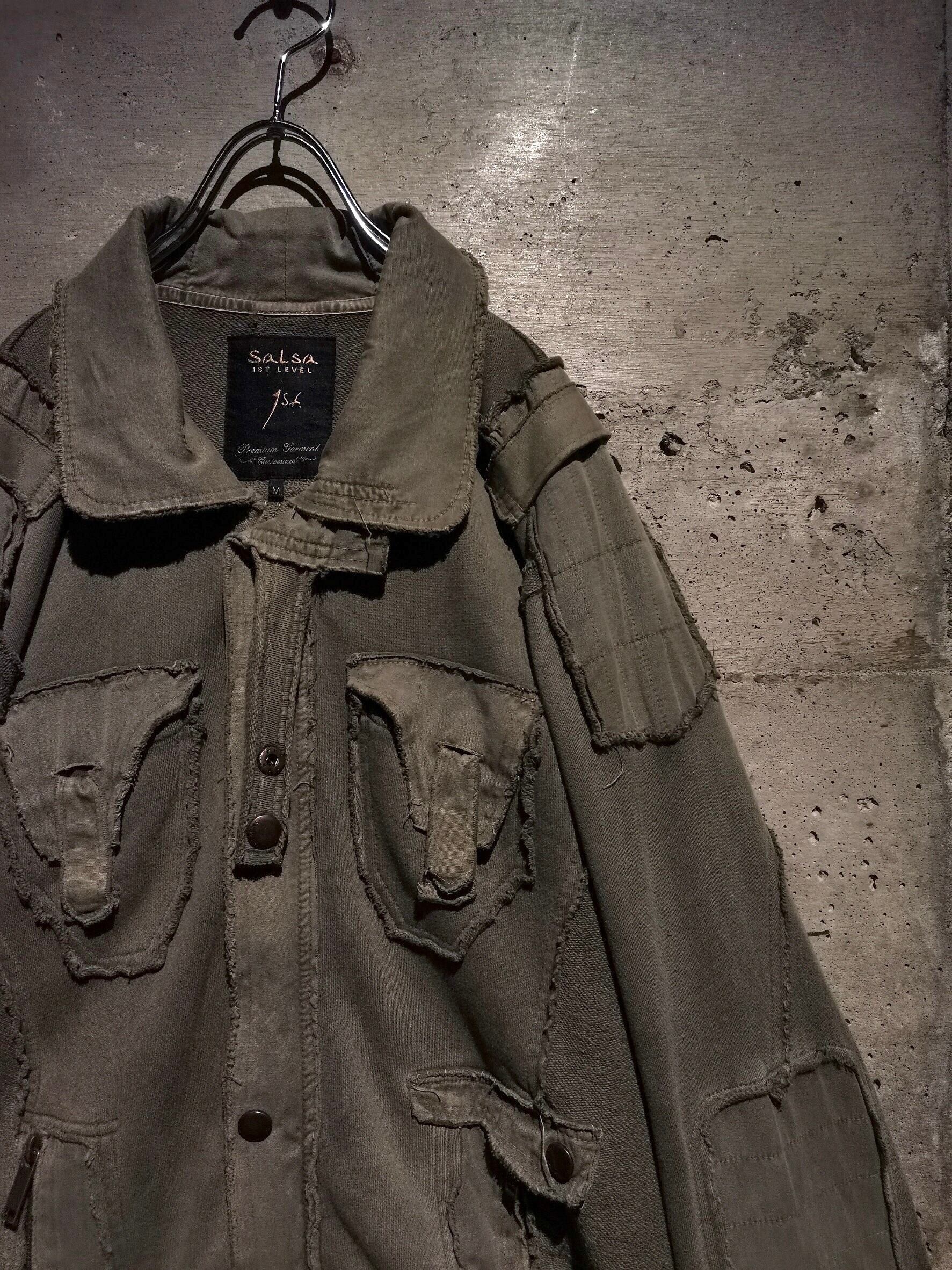スウェット地の裏面を随所に切り替え、ツギハギ風のデザインで仕上げたボディに、様々なギミックを落とし込んだスウェットジャケット。