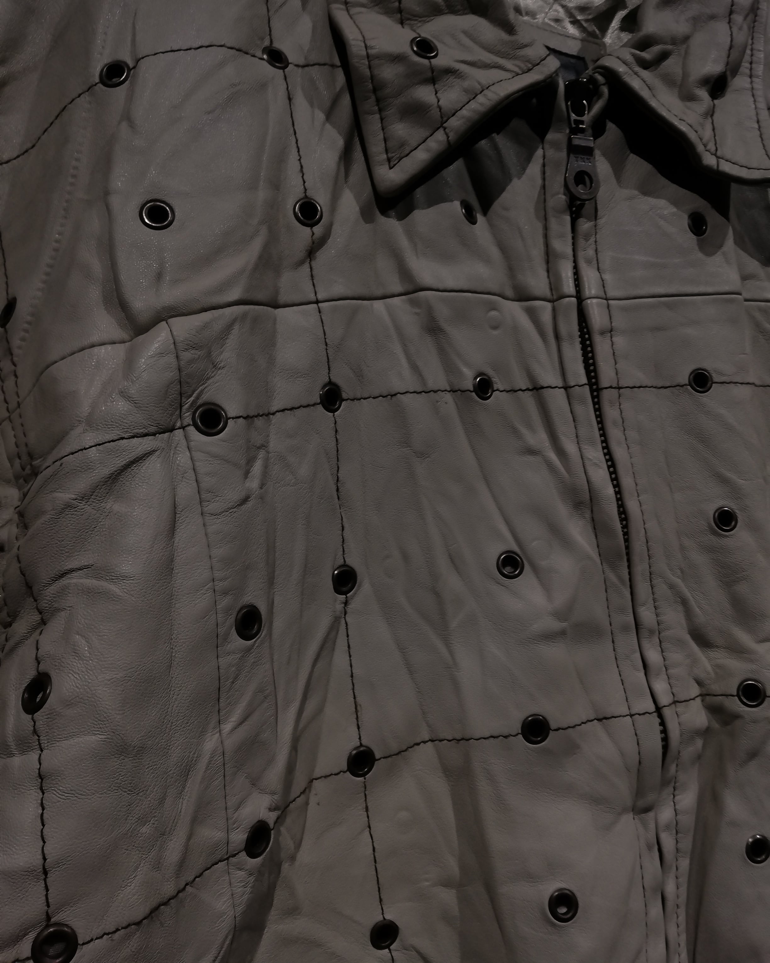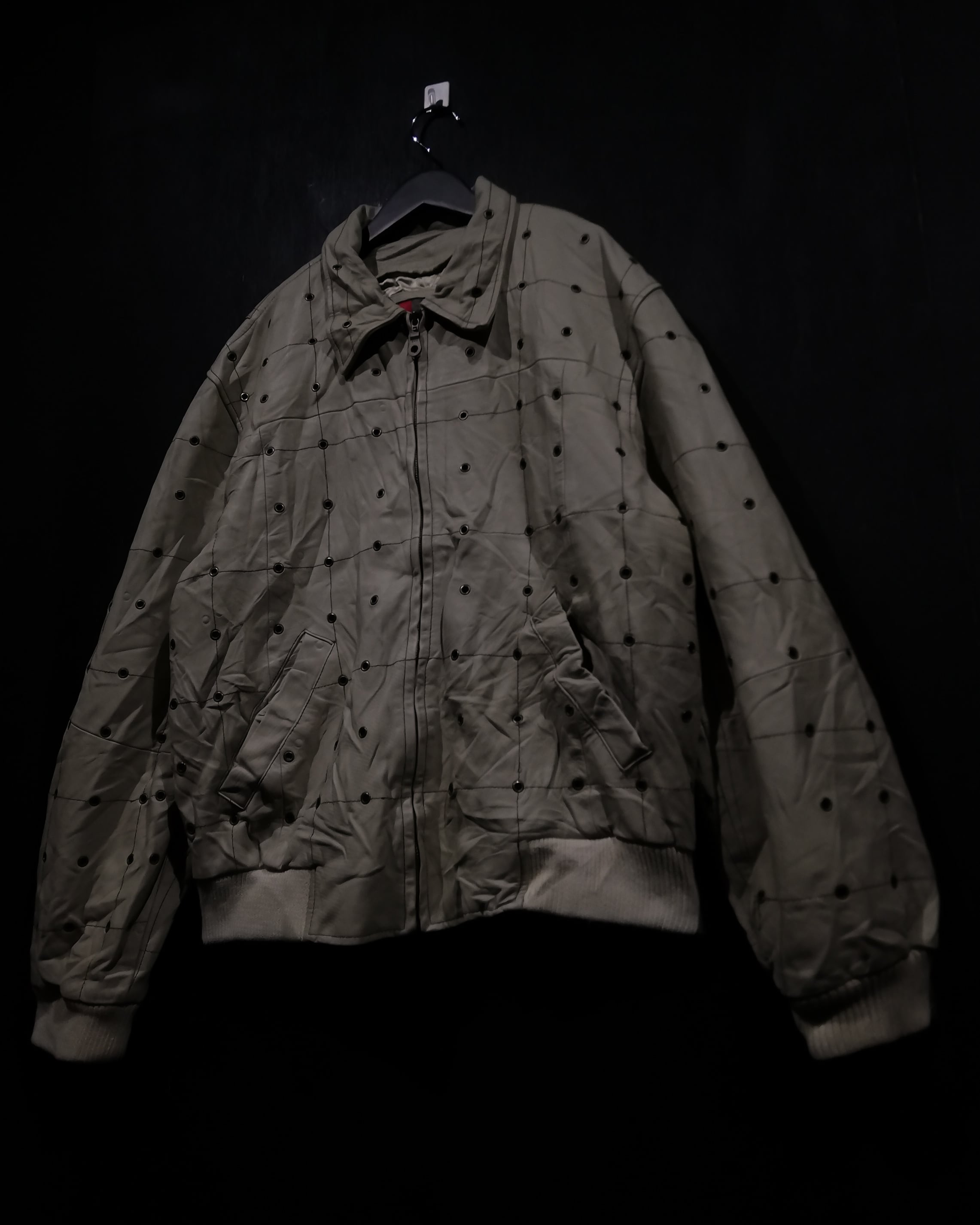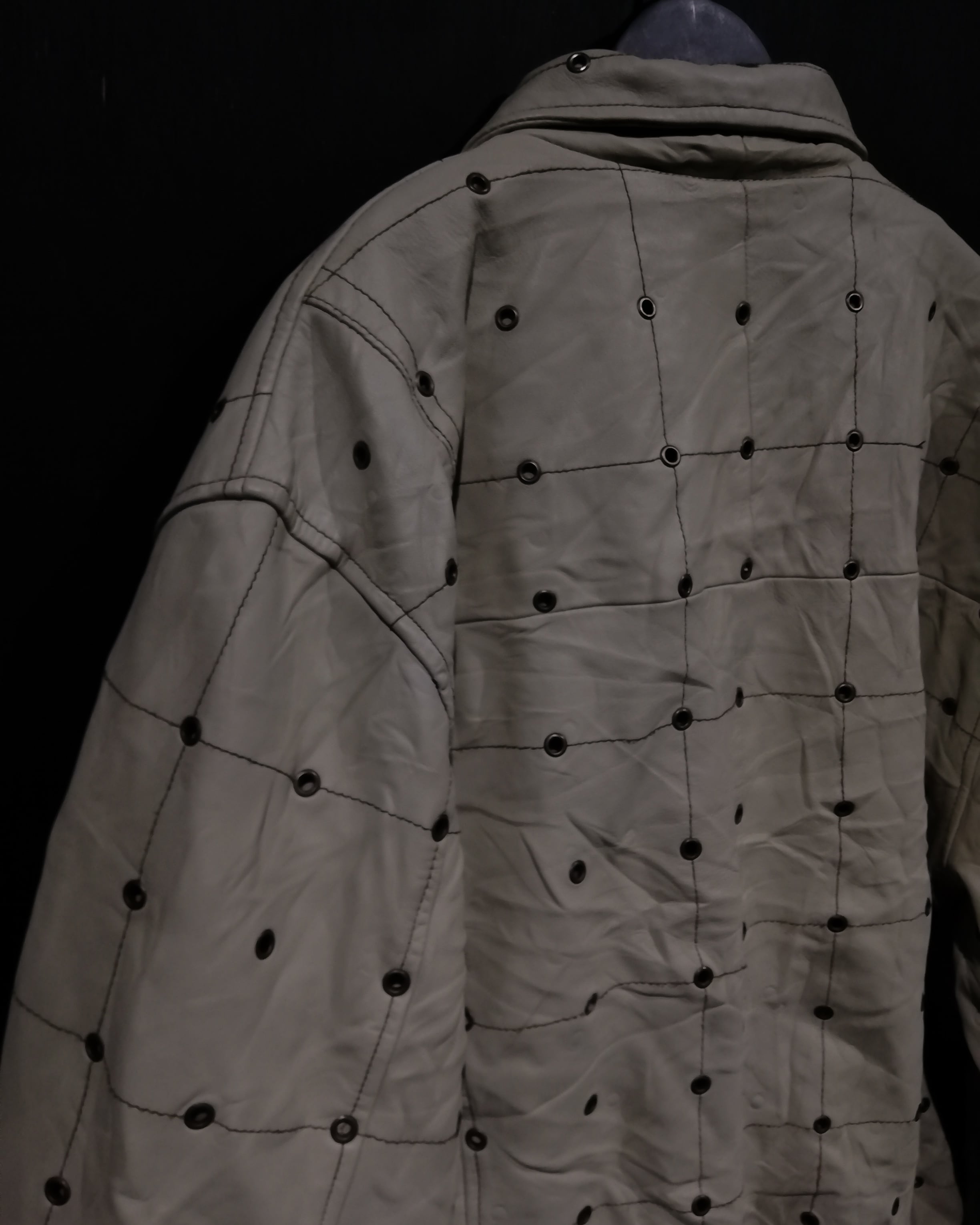 一目見て分かるこのデザイン性の高さ。滑らかなベージュカラーのスムースレザーをベースに、無数のハトメを施した逸品。